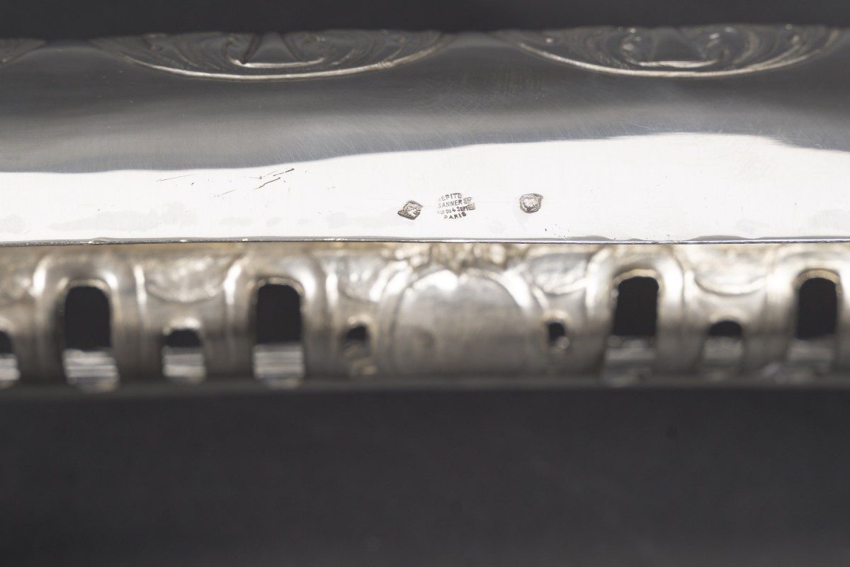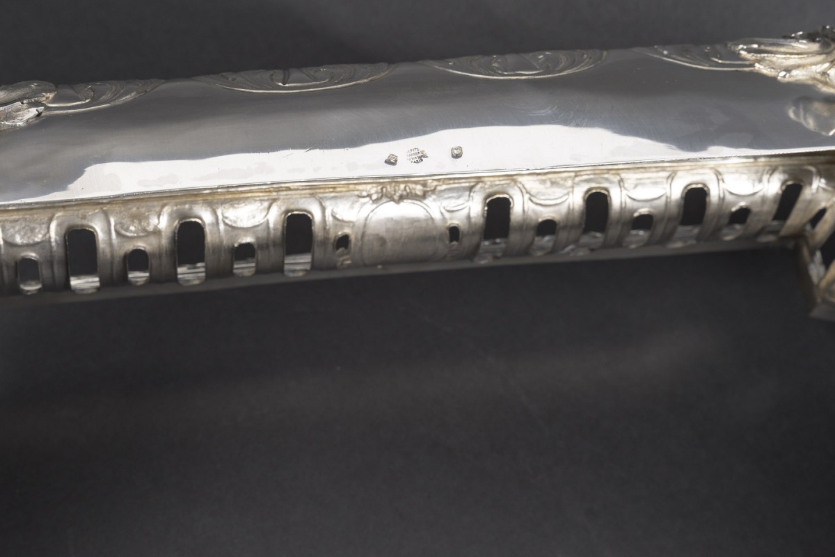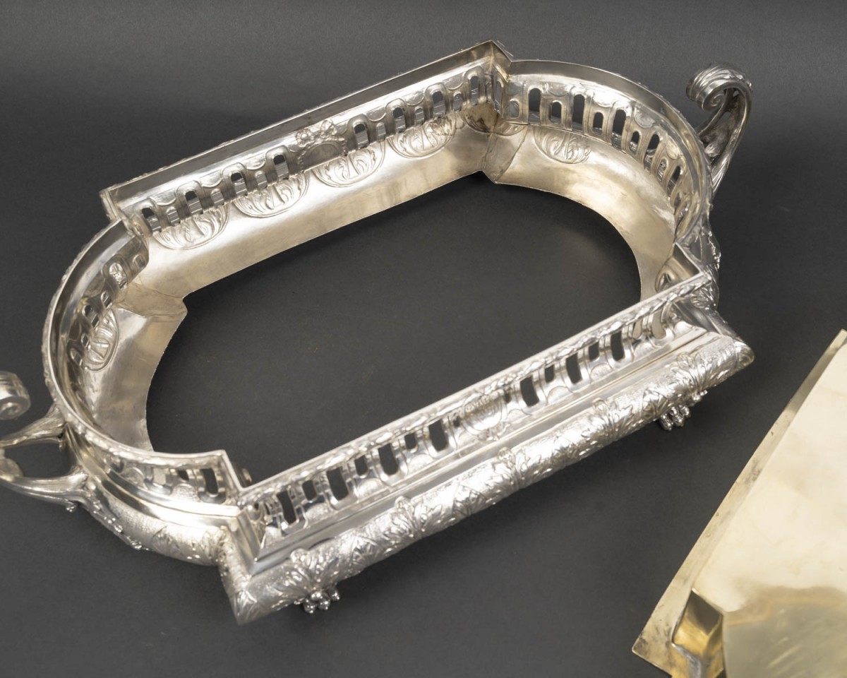 Impressive rectangular planter resting on four feet in the shape of stylized acanthus leaves ending in balls. The domed body is richly chiseled with palmettes, gadroons, and raised foliage motifs. The openwork upper section alternates rectangular openings and vertical uprights, topped with a finely engraved laurel frieze. The scrolled, foliage-covered side handles harmoniously frame the ensemble.