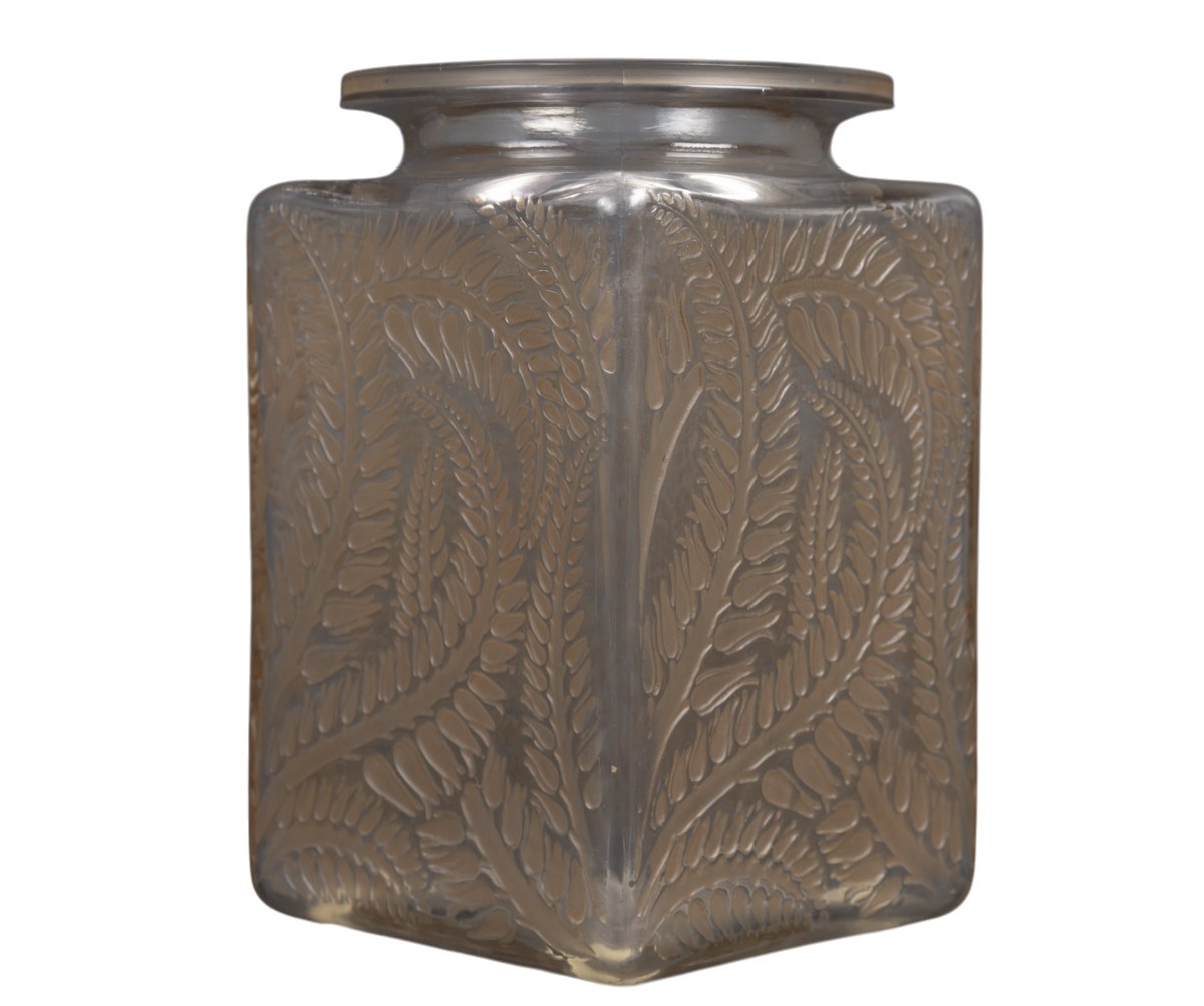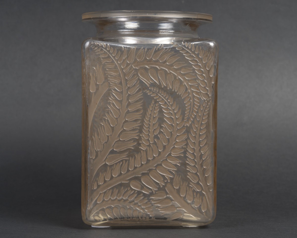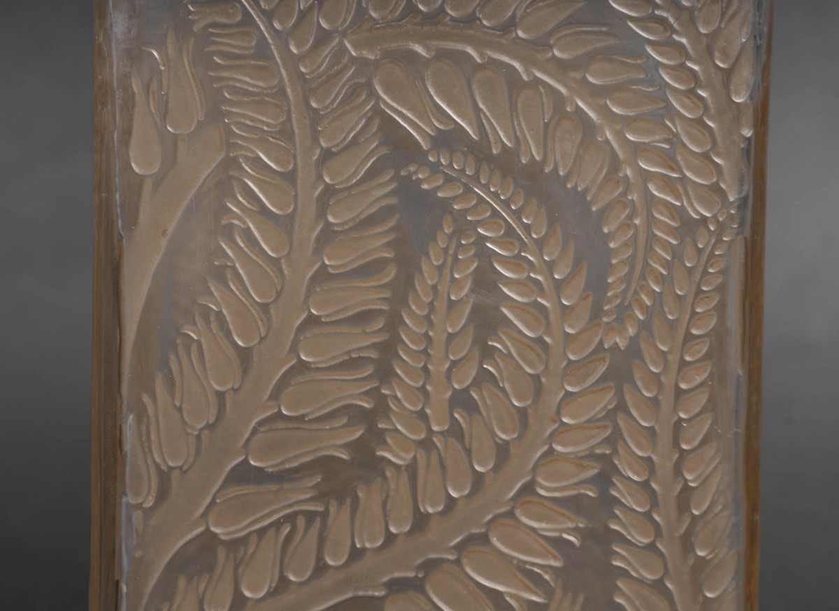 Vase in blown, molded, patinated, and amber-colored white glass. Fern decoration.