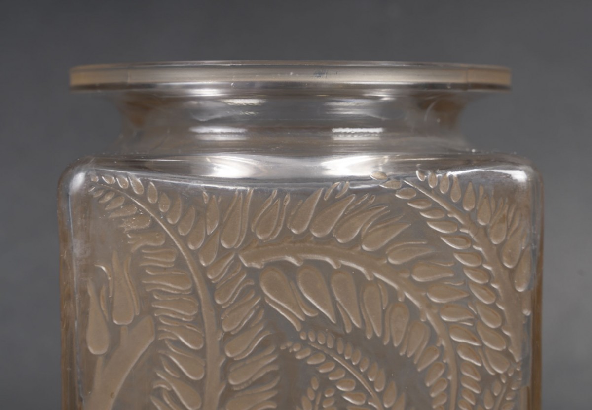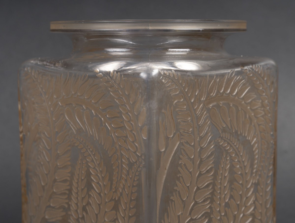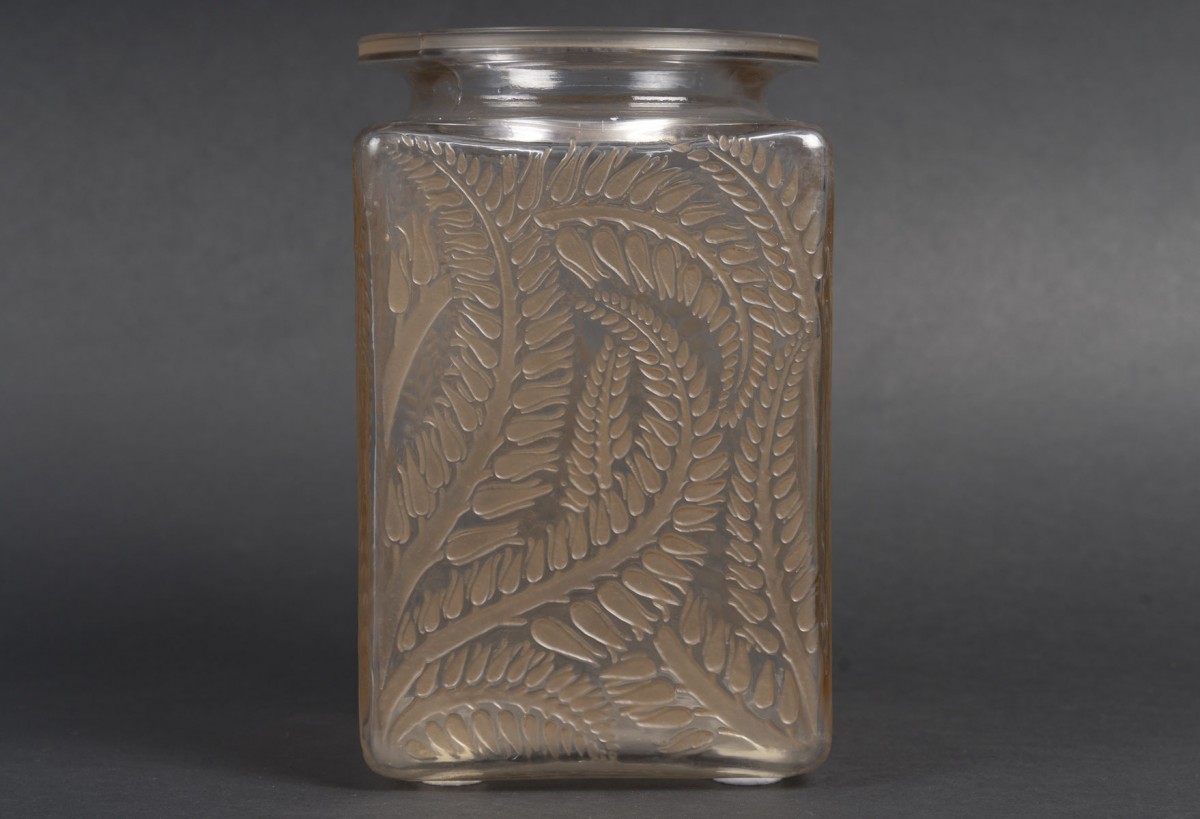 Vase in blown, molded, patinated, and amber-colored white glass. Fern decoration.
