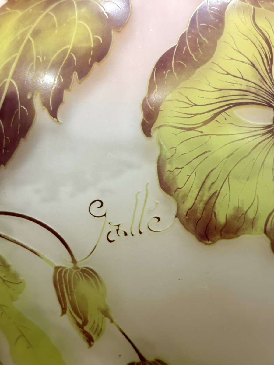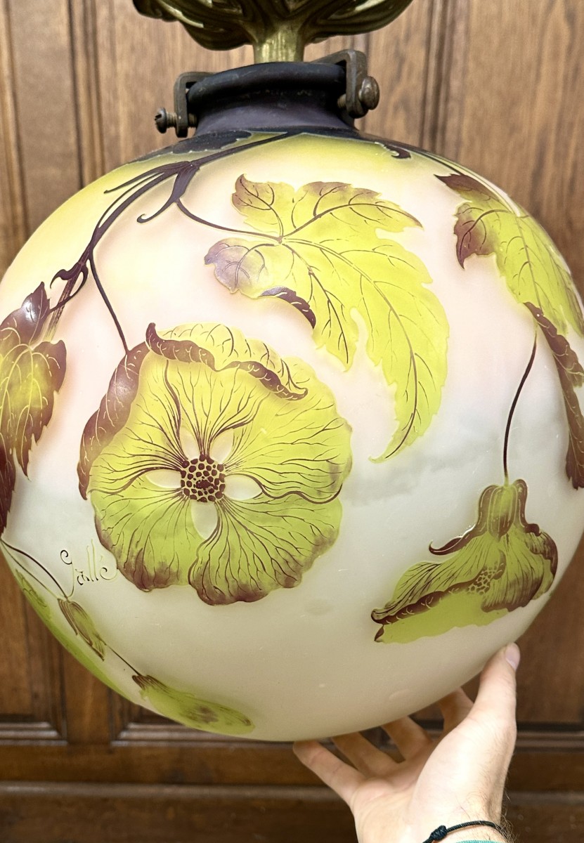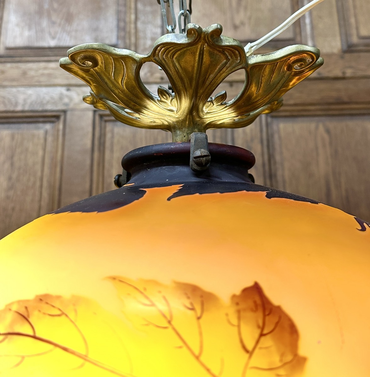 Spherical ceiling lamp or pendant lamp with acid-etched decoration of green abutilon leaves and flowers on a yellow background. Very beautiful piece with its original bronze attachment, also decorated with abutilon motifs. Signed “Gallé” in the decoration. Made around 1900. Perfect condition. Functional electrical wiring.