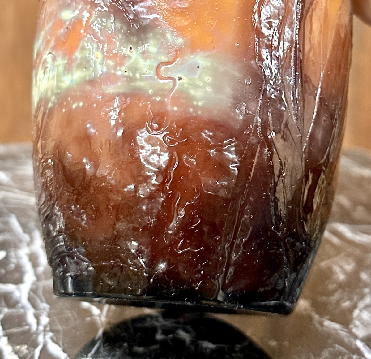 Rare shell-shaped vase by Emile Gallé with a hot-drawn neck decorated with tulips. Gallé's artistic glassware uses a variety of glass techniques. This piece is acid-etched glass that has been reworked on a wheel to accentuate the details of the flowers, with colored inclusions in the decoration. We find purple in the flowers and milky white lines at the top of the vase, as well as a powdery green trail at the base. Richly engraved decoration on several layers with a fire-polished finish on the surface. Naturalistic “Gallé” signature in relief. This is a signature that Gallé affixed to his rarest models. Art Nouveau work from around 1900 in perfect condition.