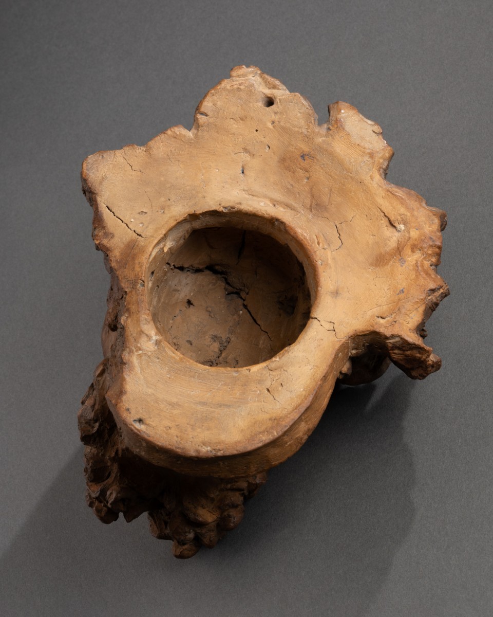 Our terracotta exemplifies this tradition with striking power. The decapitation has just occurred: the Baptist’s face is frozen in an expression of agony and horror. His eyes remain open, his brow is furrowed, and his mouth gapes, revealing a fallen tongue that underscores the brutal immediacy of the scene. The aesthetic dimension of the work finds fulfillment in the elegant flow of his hair, once spreading fluidly across the platter’s surface, mingled with blood.
