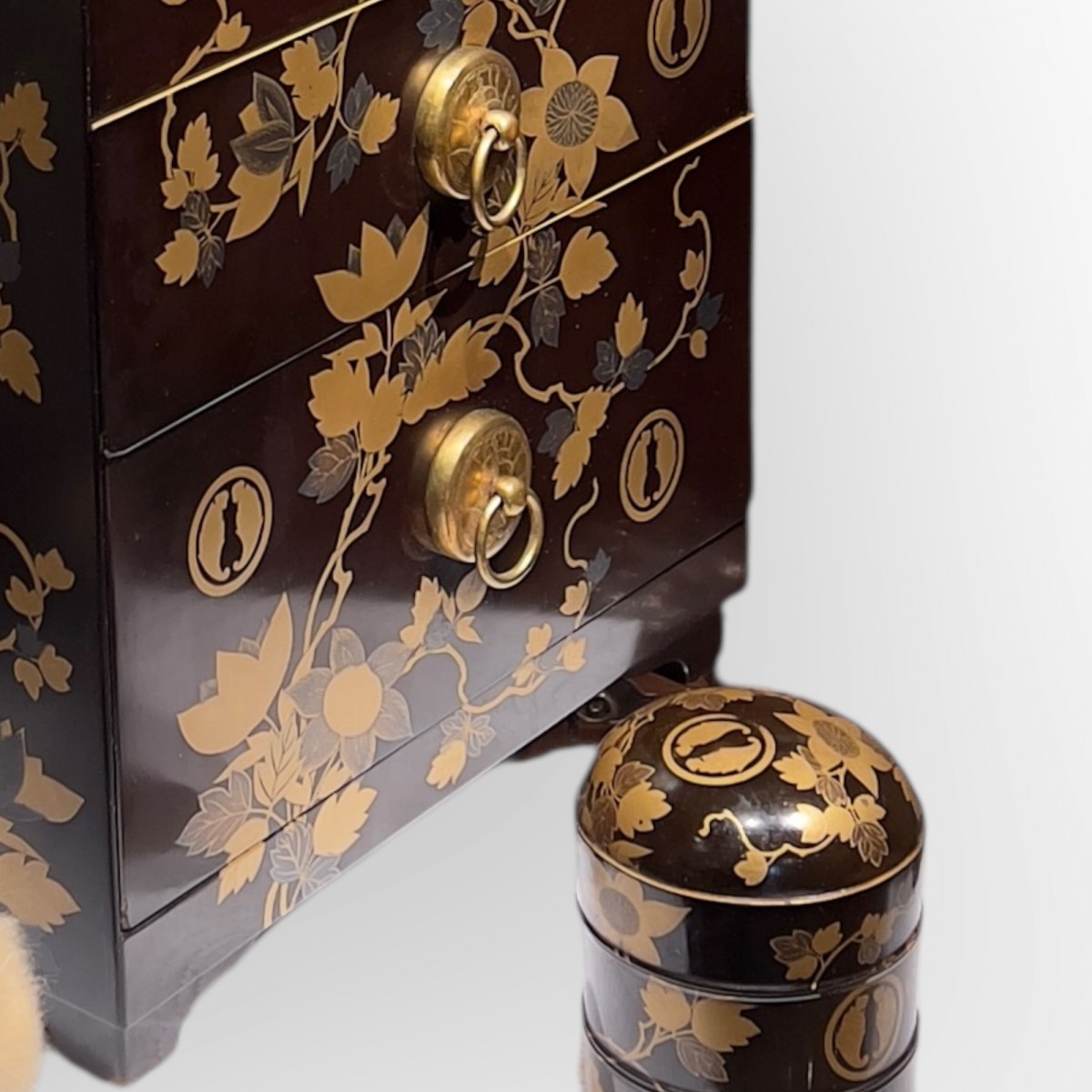 The cabinet is decorated in black urushi lacquer with gold and silver maki-e decoration, with brass hardware and knobs. The kamon Maru ni Daki My?ga—the emblems of the Inagaki family, daimy? of Mikawa Province and vassals of the Tokugawa shogunate—are scattered across all sides of the cabinet, among a network of climbing clematis. The large star-shaped flowers and slender stems of this tessen-karakusa motif reflect the virtuosity of lacquer workshops in the second half of the 18th century.