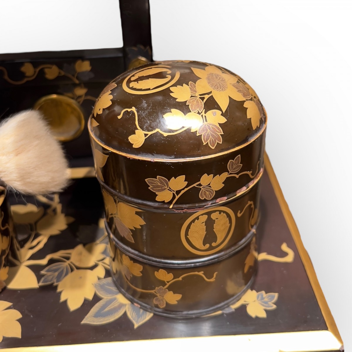 This ky?dai, a vanity unit, is a remarkable example of ceremonial furniture from the Edo period. The set includes a cubic cabinet with drawers, a polished metal mirror simply placed on its stand, a compartmentalized makeup box, a small container, and two original brushes, exceptionally preserved since the 18th century.