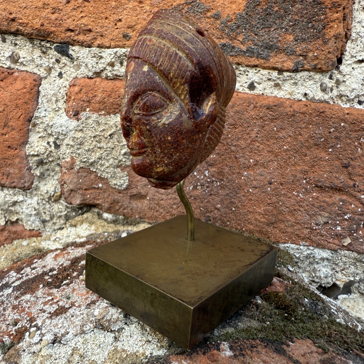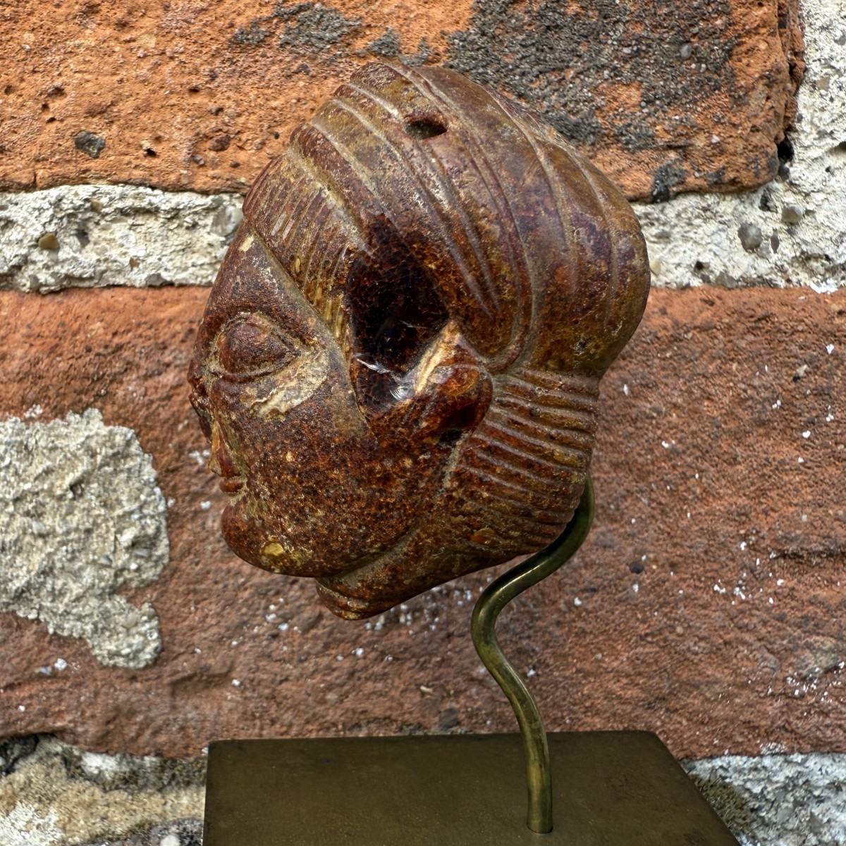 Carved from translucent red-brown amber with a warm, granular patina and areas of stable age-related degradation, this pendant takes the form of a profile head with stylised Archaic features. The sculptor emphasised the large almond eye beneath a defined brow ridge, a softly smiling mouth, and carefully delineated hair arranged in striated bands sweeping back from the face. A drilled perforation at the crown indicates its original function as a suspended ornament, while the smoothing around the opening suggests active wear in antiquity.