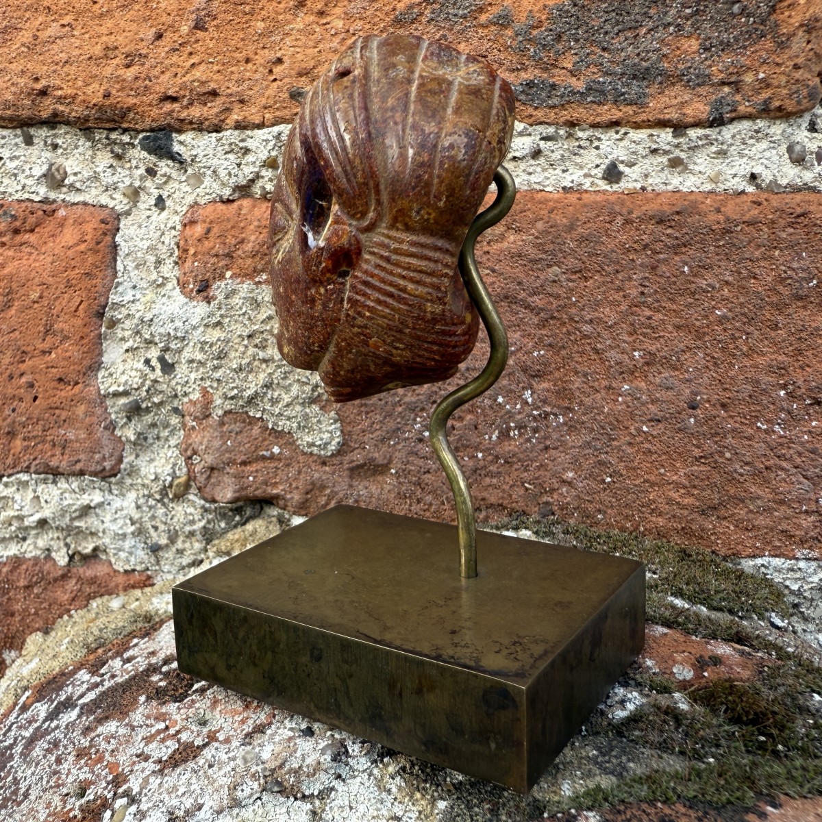 Amber was a prestigious imported material in Etruria, highly prized for its rarity, colour, and perceived apotropaic power. From the late 6th century B.C. onwards, figured amber pendants appear in elite tombs, particularly those of women, reflecting both personal identity and a protective role within funerary belief systems. The prominent, wide-open eye here may have served as a talismanic motif, thought to ward off malign forces and ensure the wearer’s vigilance and wellbeing in life and beyond the grave. This piece reflects the distinctive aesthetic of Etruscan amber carving, in which Mediterranean influences are reinterpreted with a locally expressive sculptural style.