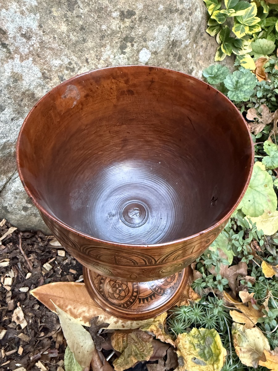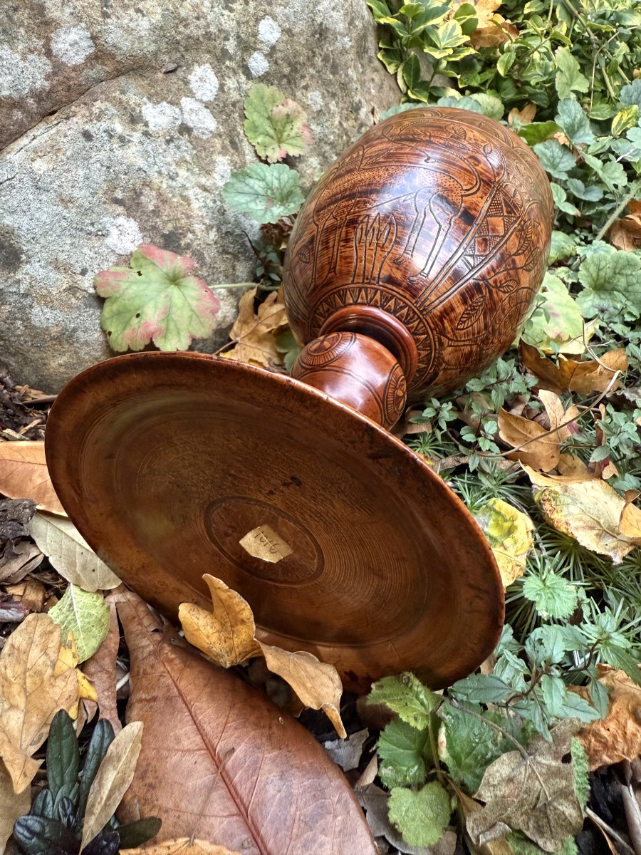 A rare early seventeenth-century standing cup finely turned from pearwood, its bowl and foot engraved with foliate and geometric ornament. Around the body are detailed depictions of a white hart, a wyvern and a unicorn amidst stylised foliage, all executed in precise line incision. The upper border is composed of an arcade of semi-circular arches enclosing rosettes, while the foot is similarly ornamented with concentric geometric bands of roundels and leaf motifs. Above the inscribed date 1636 appear the initials T.F.S.. The surface retains a rich, warm patina from prolonged handling and age.