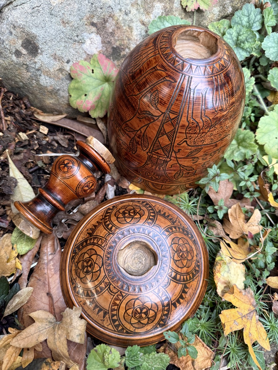 The vessel’s elegant proportions and lively engraving place it among the more sophisticated survivals of seventeenth-century English treen (domestic woodenware), a class of object once ubiquitous but now exceedingly scarce. Cups of this type were often both functional and commemorative, their inscriptions or dated ornament suggesting presentation or marriage pieces.