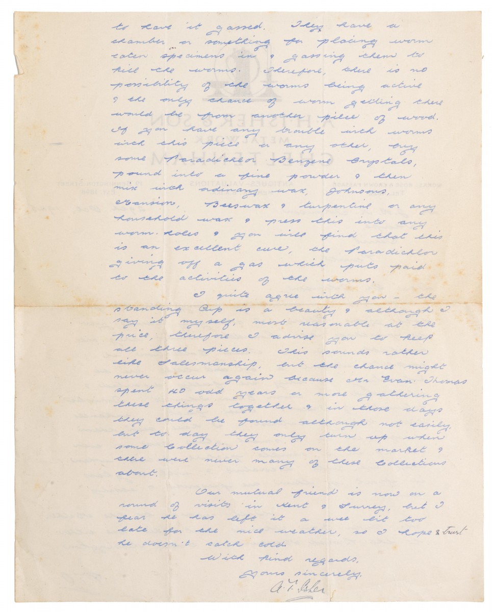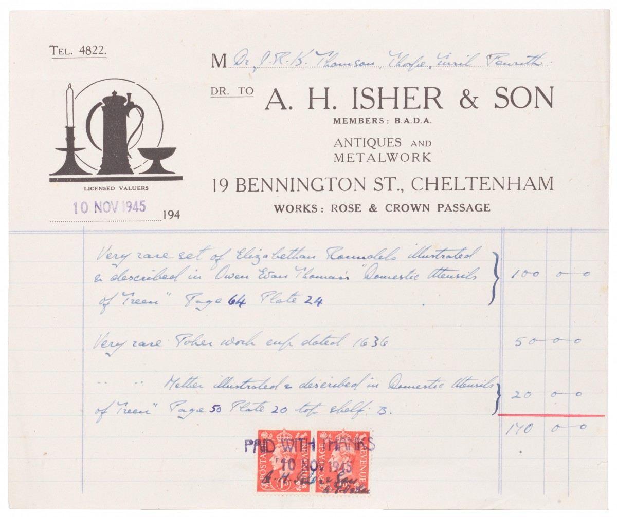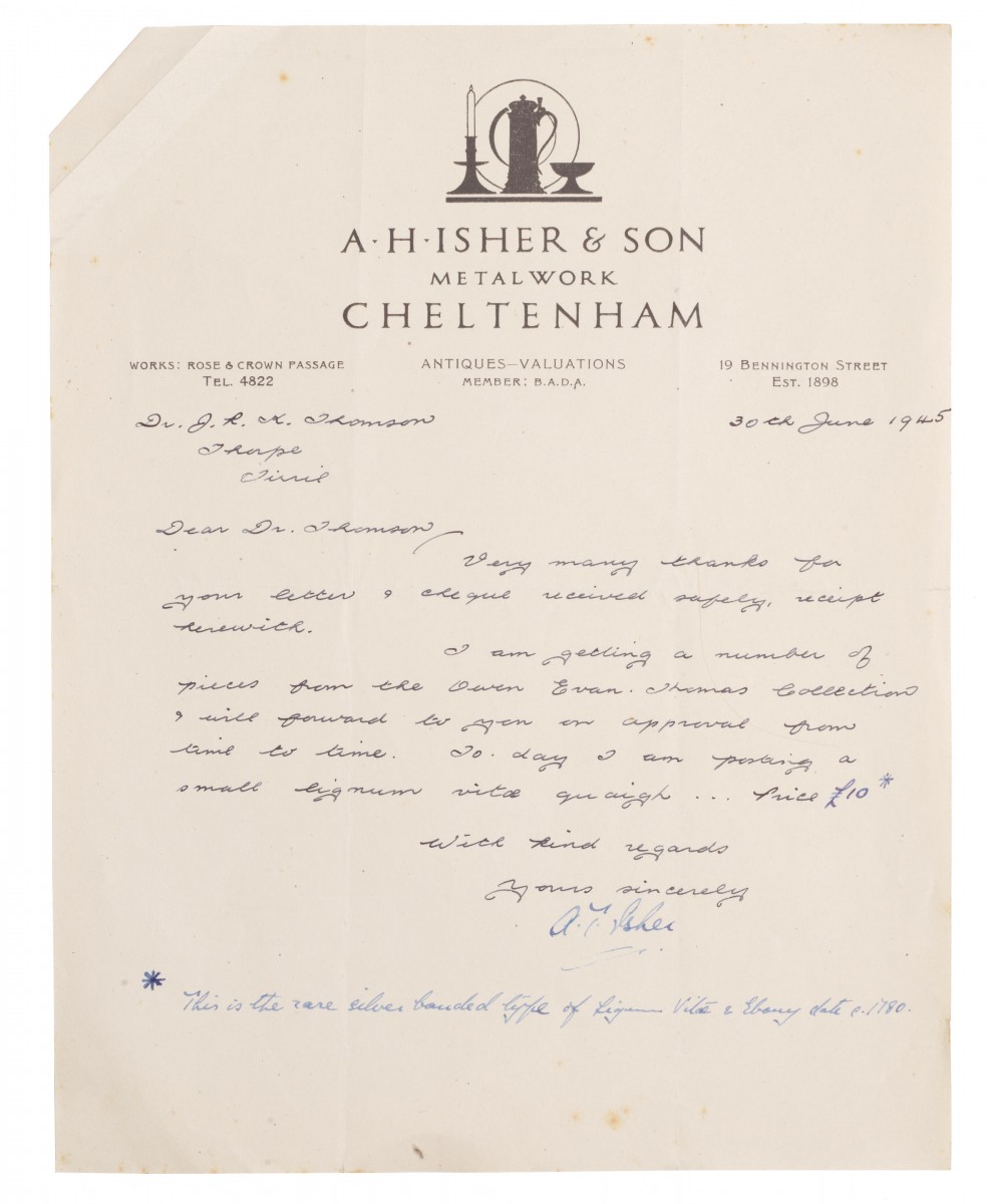 • A. H. Isher & Son, Cheltenham, acquired from the Owen Evan-Thomas collection, 1945 (with original correspondence and invoice dated 10 November 1945).