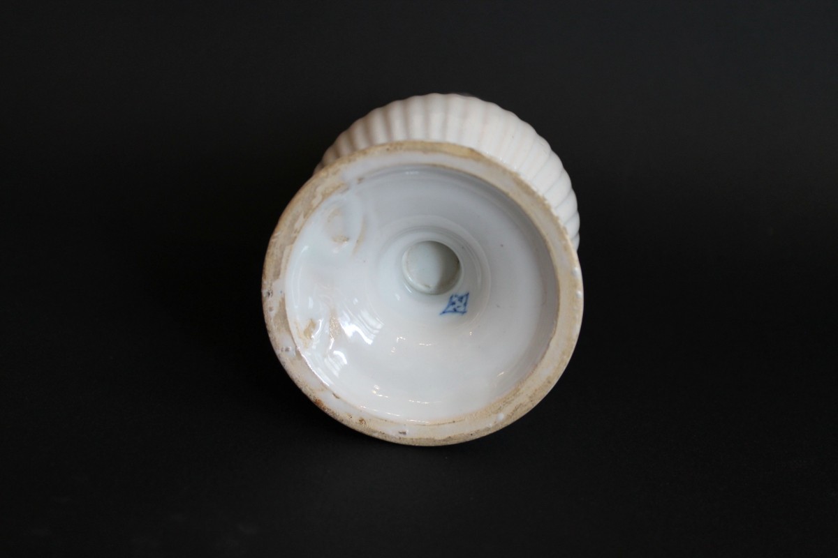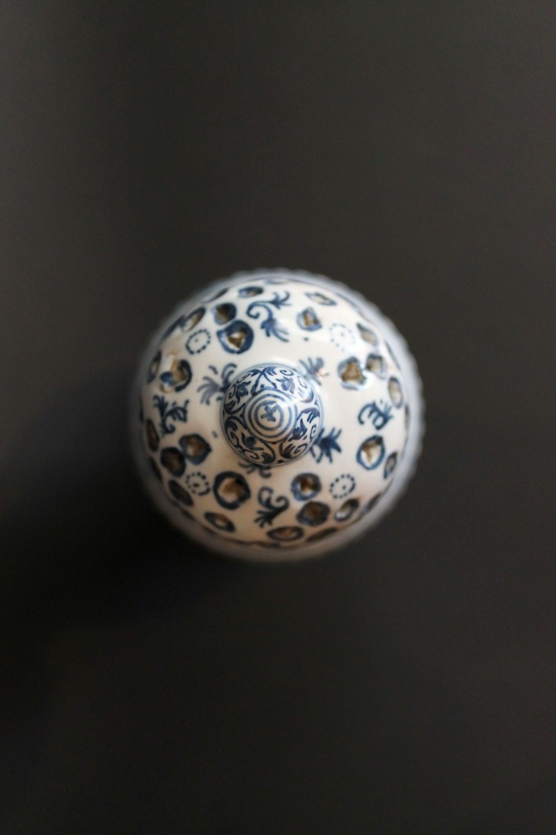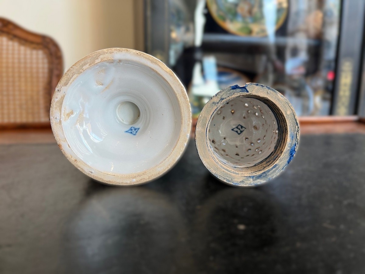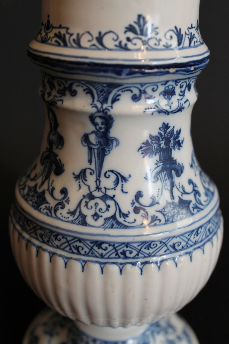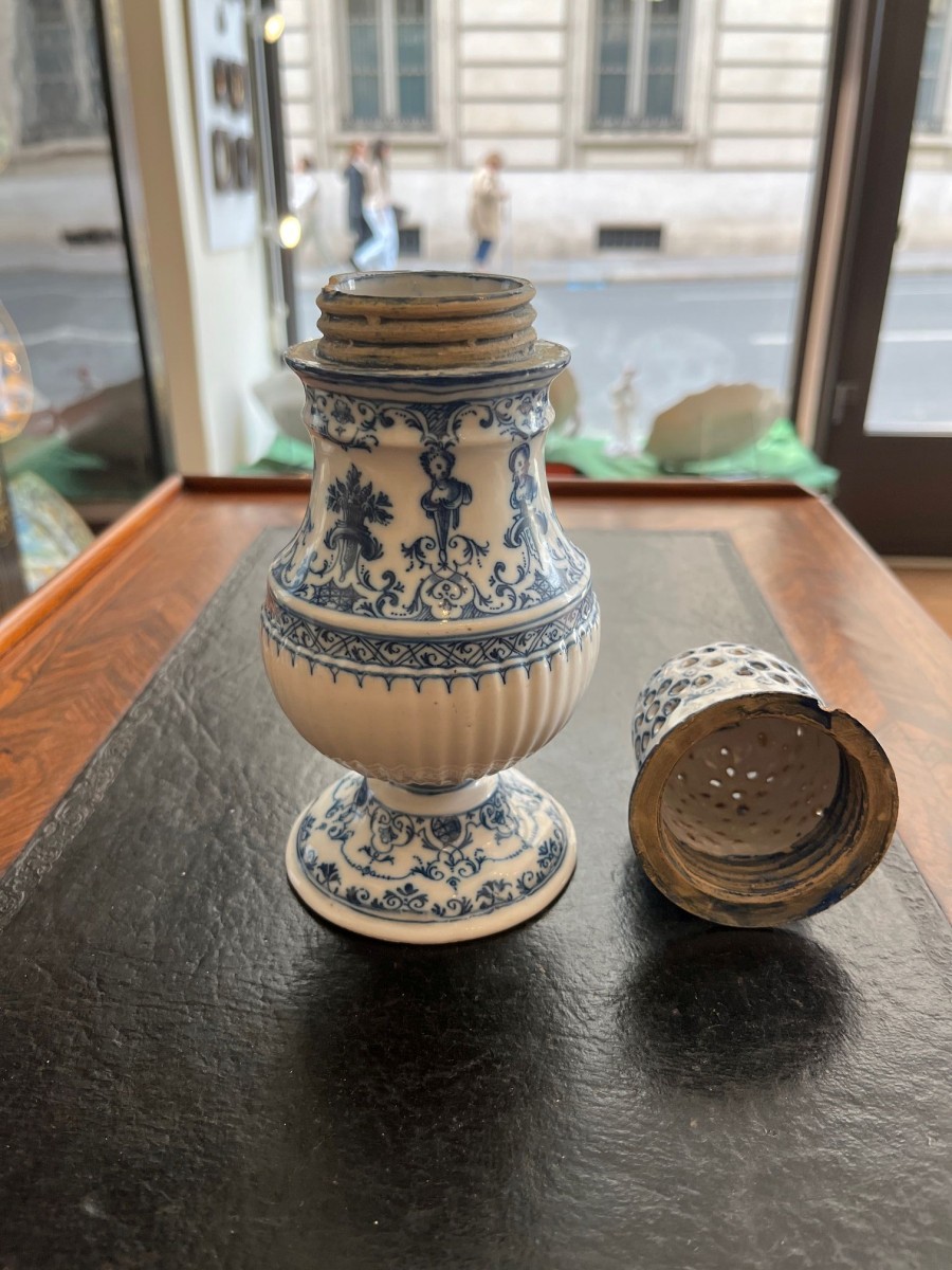 Baluster-shaped powder sprinkler with gadrooned decoration resting on a pedestal with an openwork lid in Moustiers earthenware, decorated in a style inspired by Bérain in shades of blue with busts of women and bouquets of flowers surrounded by foliage and garlands, a checkered frieze, and lace.