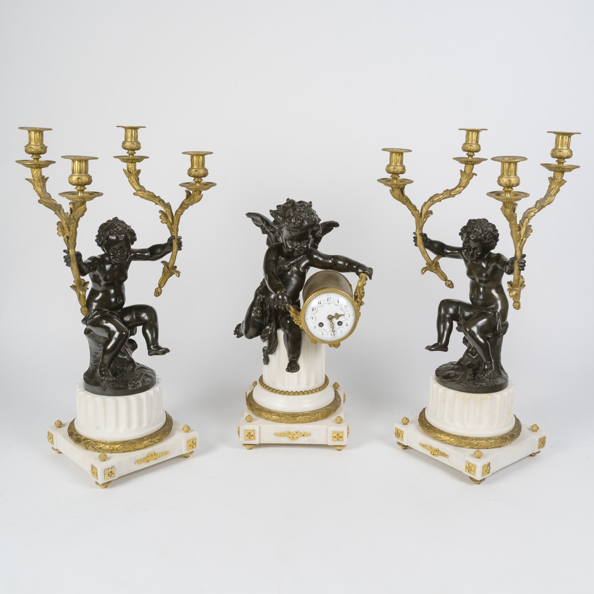 An important mantelpiece in white marble, gilt bronze, and patinated bronze, comprising a clock and two four-light candelabras held by musician putti, seated on fluted truncated columns.