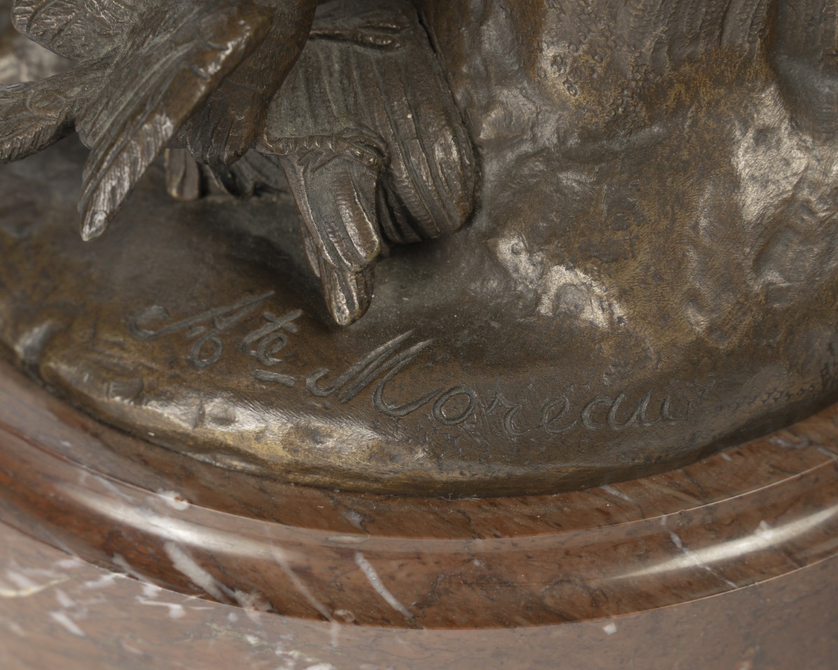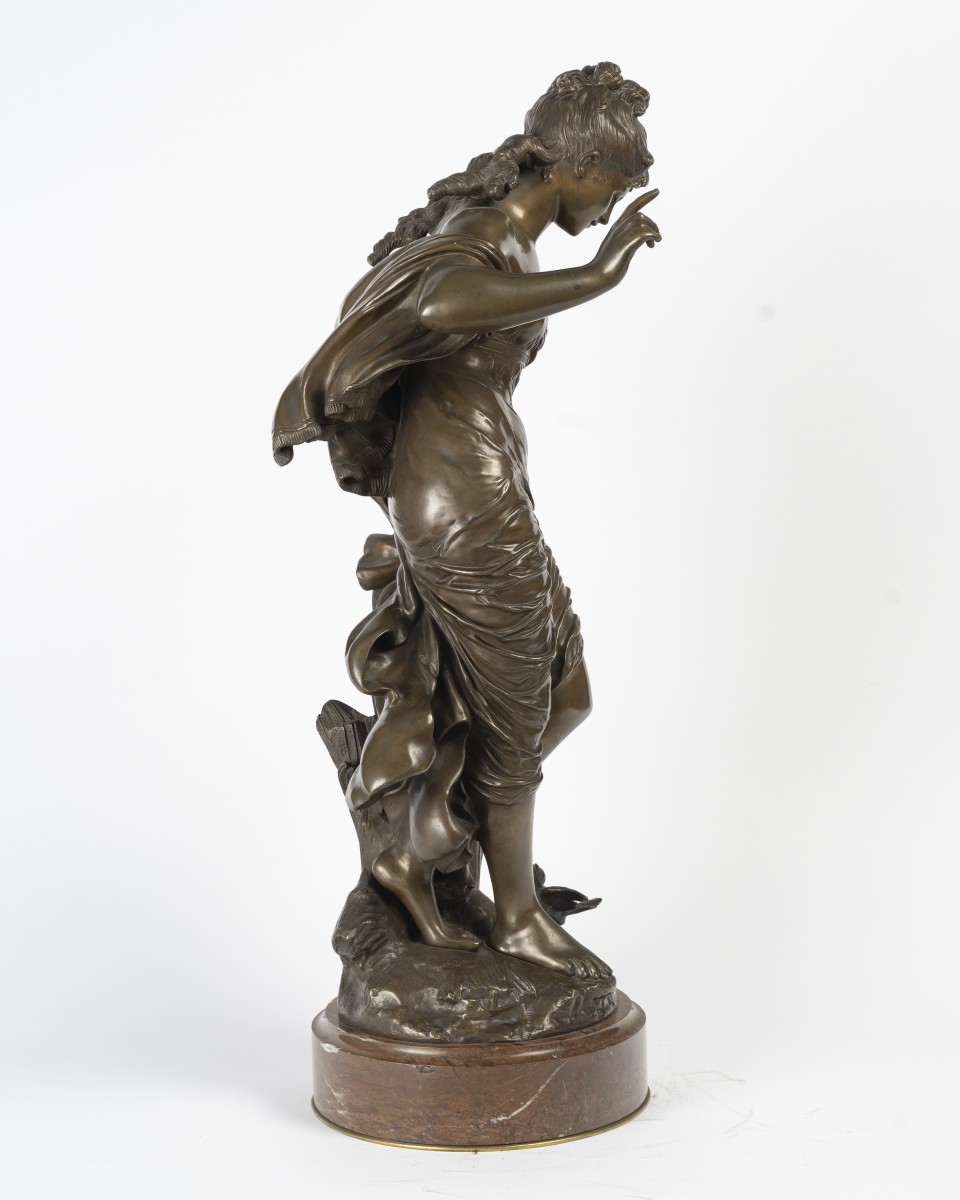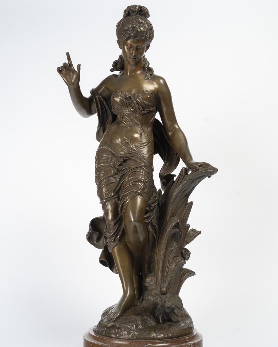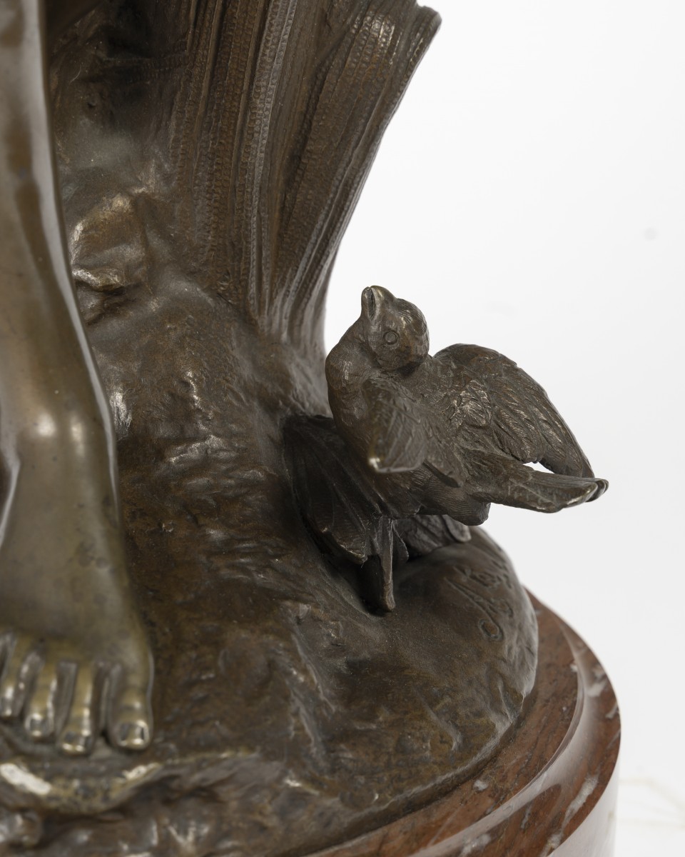 A beautiful late 19th-century sculpture of a woman with a bird by Louis Auguste Moreau.