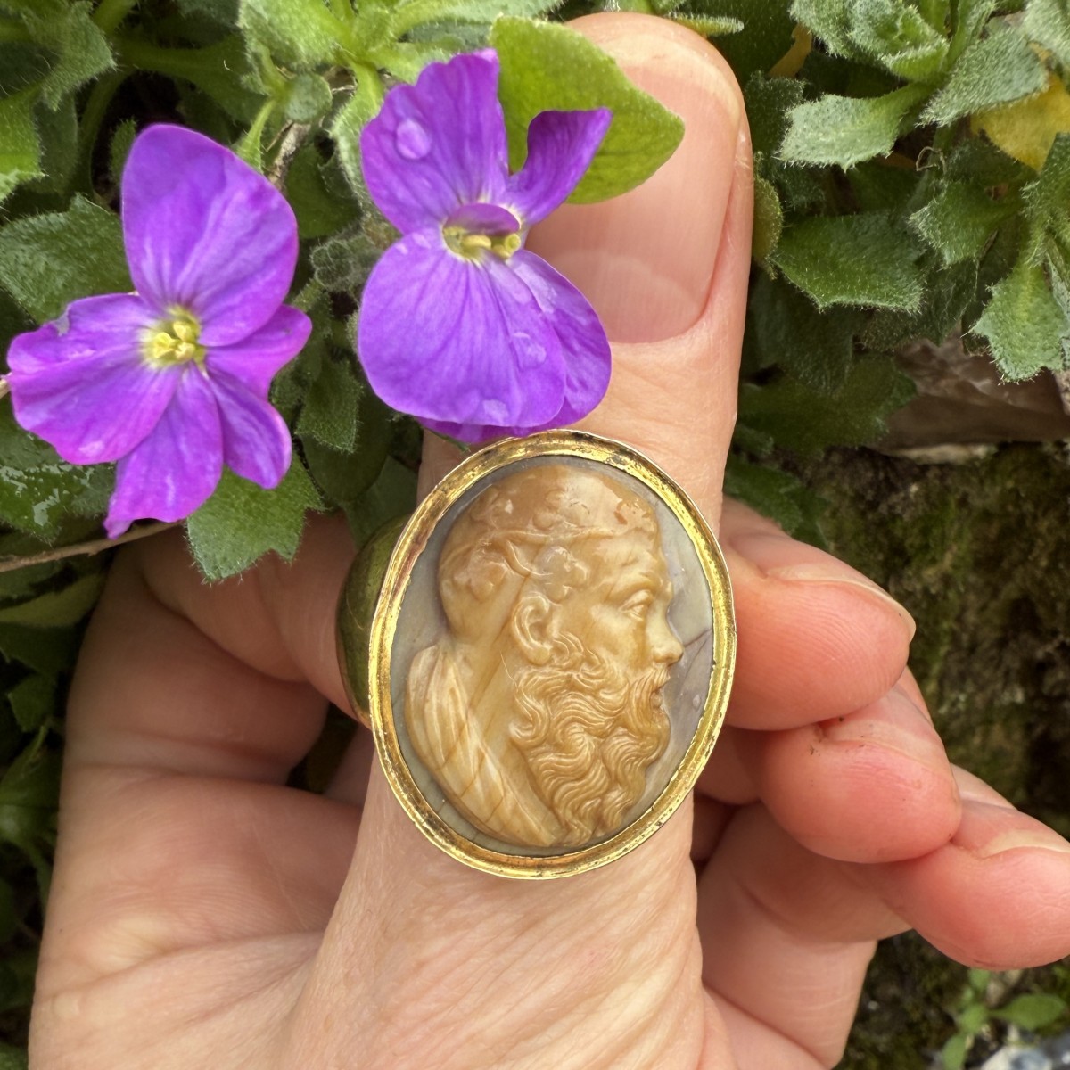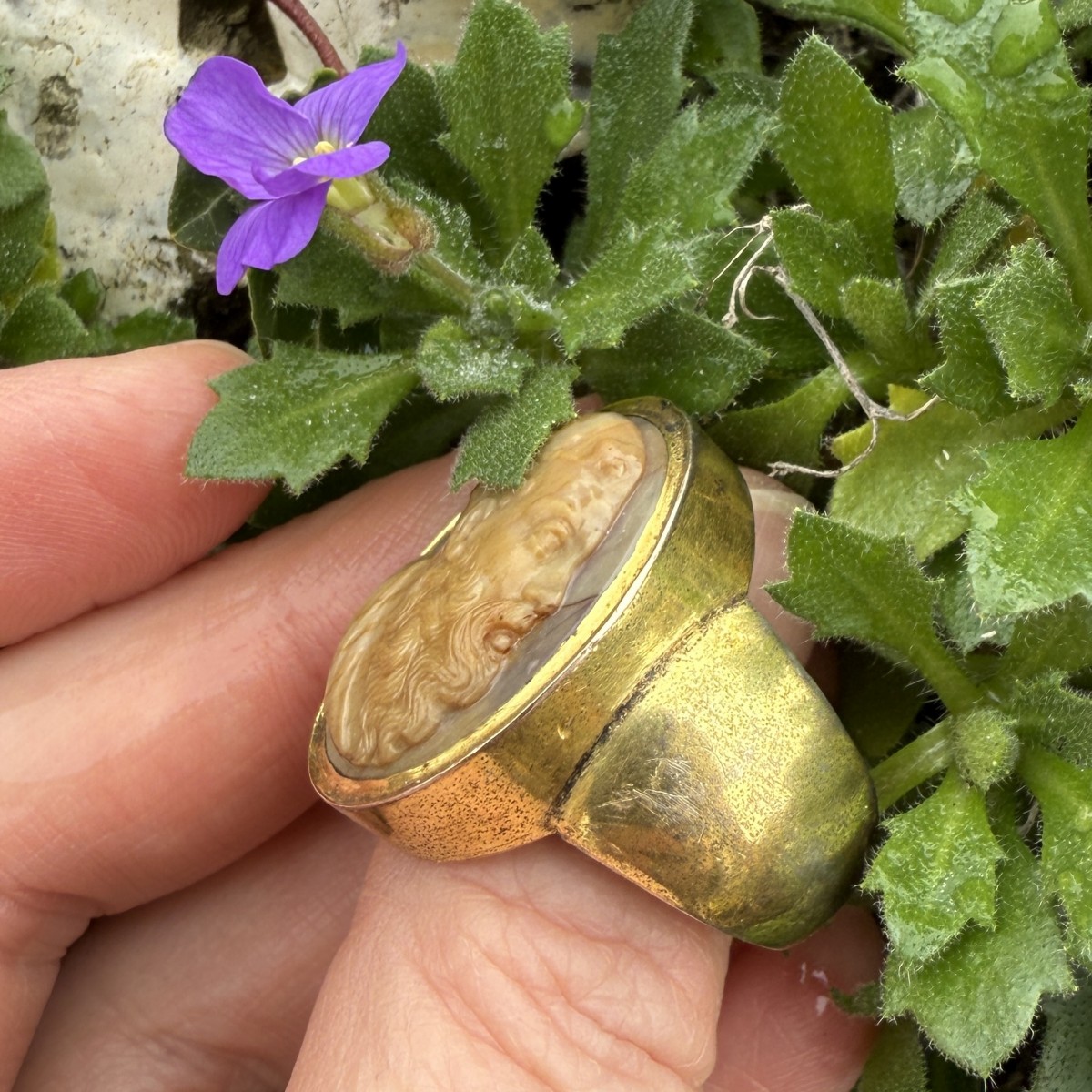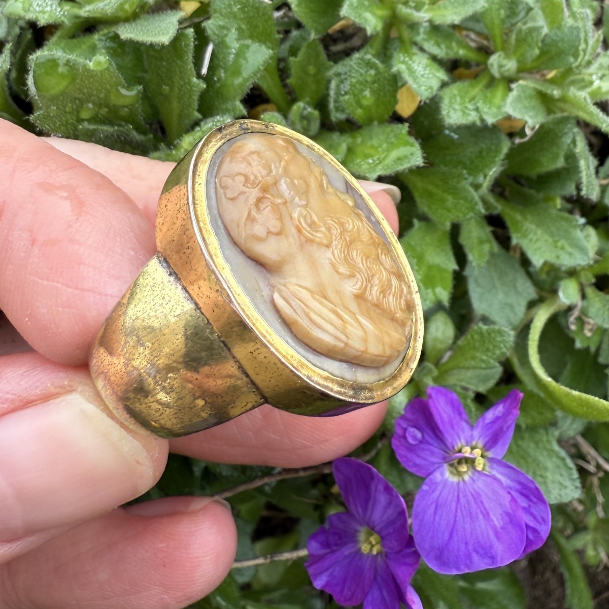 The gem is mounted within a smooth, oval silver-gilt bezel, the broad hoop tapering towards the back in characteristic Georgian fashion. The softly burnished surface of the gilt silver and the classical restraint of form harmonise beautifully with the ancient subject, typical of early nineteenth-century taste for antique revival cameos. The cameo itself may be marginally earlier, reflecting the period’s appreciation for re-mounting existing engraved gems in fashionable yet dignified settings.