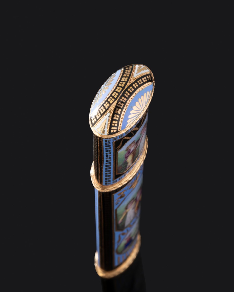 The backgrounds are adorned with black and lavender-blue enamel, decorated with floral baskets and ribbons.
