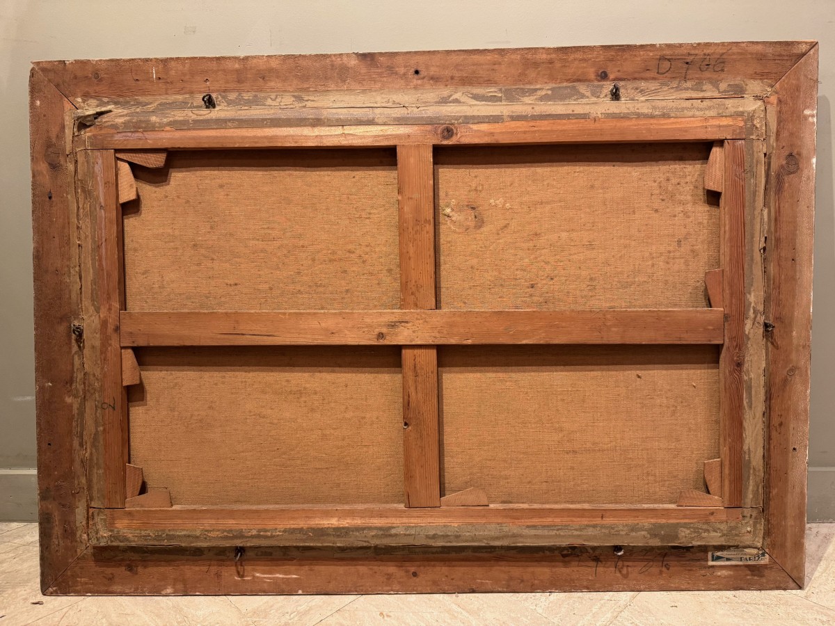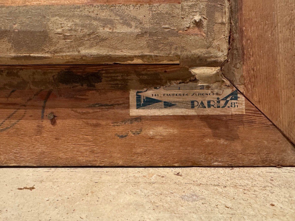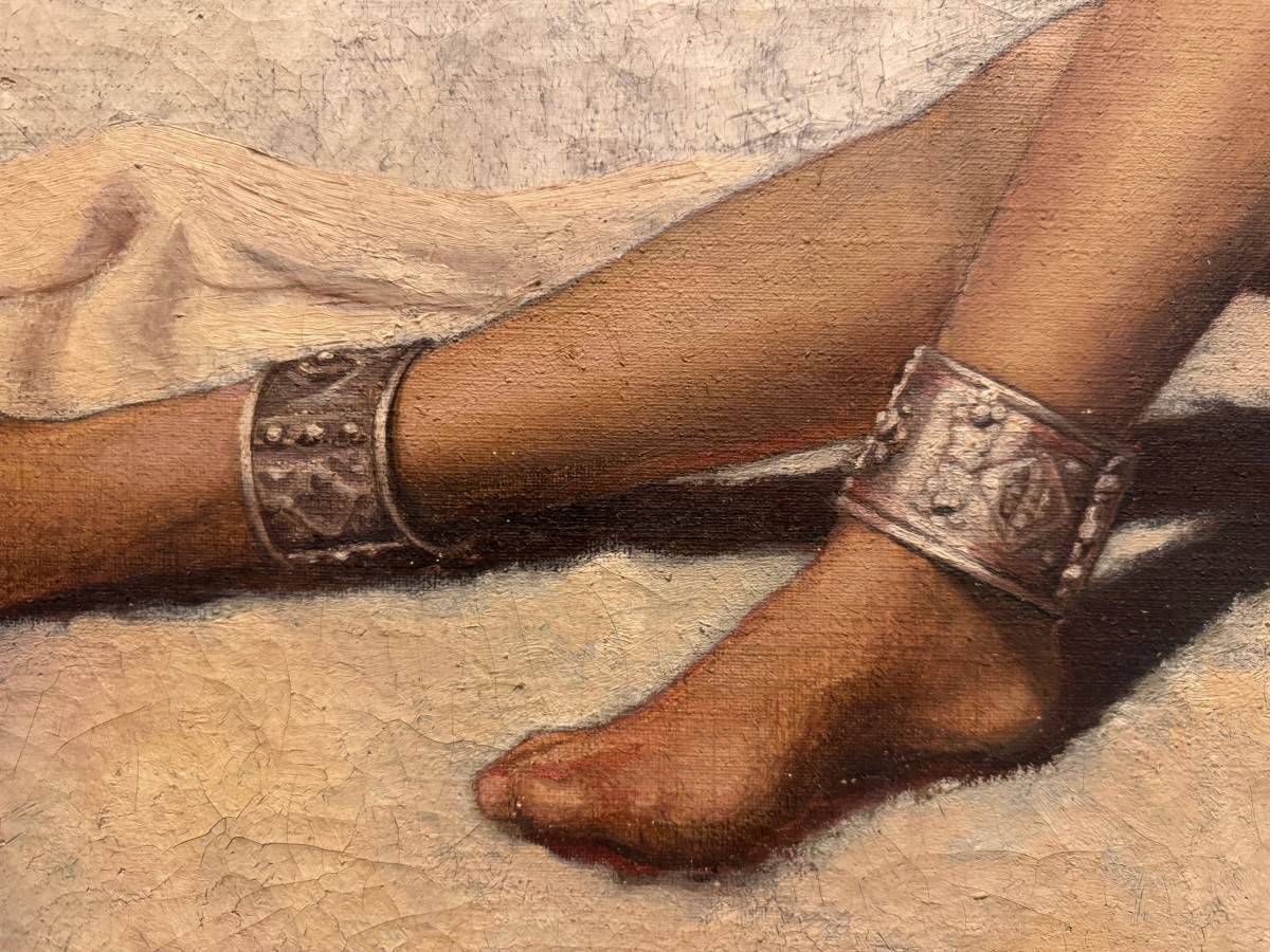 Oil on canvas depicting a young, nude Oriental woman lying on a sheet. She wears a red turban, silver bracelets on her wrists and ankles, and possibly a Berber tattoo on her forehead. Signed lower left J.DUTEY, circa 1930. Born in Orléans, died in the Congo, he is known as an Orientalist painter, hunter, and writer. Heir to a family of industrialists and military men, this dilettante adventurer had every means to satisfy his passions: writer, avid hunter, and painter, he was a colorful figure, worthy of the great adventurers in Africa of the first half of the 20th century. Among other works, he published a personal adventure story in 1948 entitled "Facing the Giants of the Bush." As a painter, he produced portraits of women full of truth, as well as landscapes. He died in Pointe-Noire, in French Equatorial Africa (Congo). He does not appear to have exhibited in any official painters' salon, which is quite in keeping with his character. One of his paintings is on deposit at the Boulogne-Billancourt Museum. See "French Orientalist Painters, Index of Painters". In its original frame, 117 x 82 cm.
