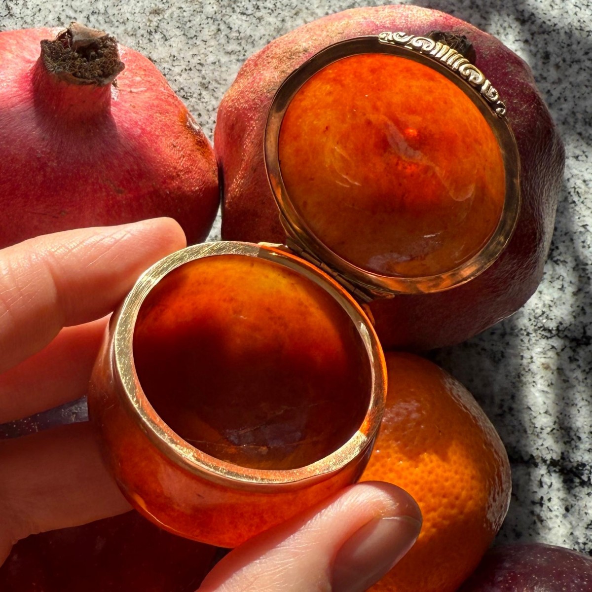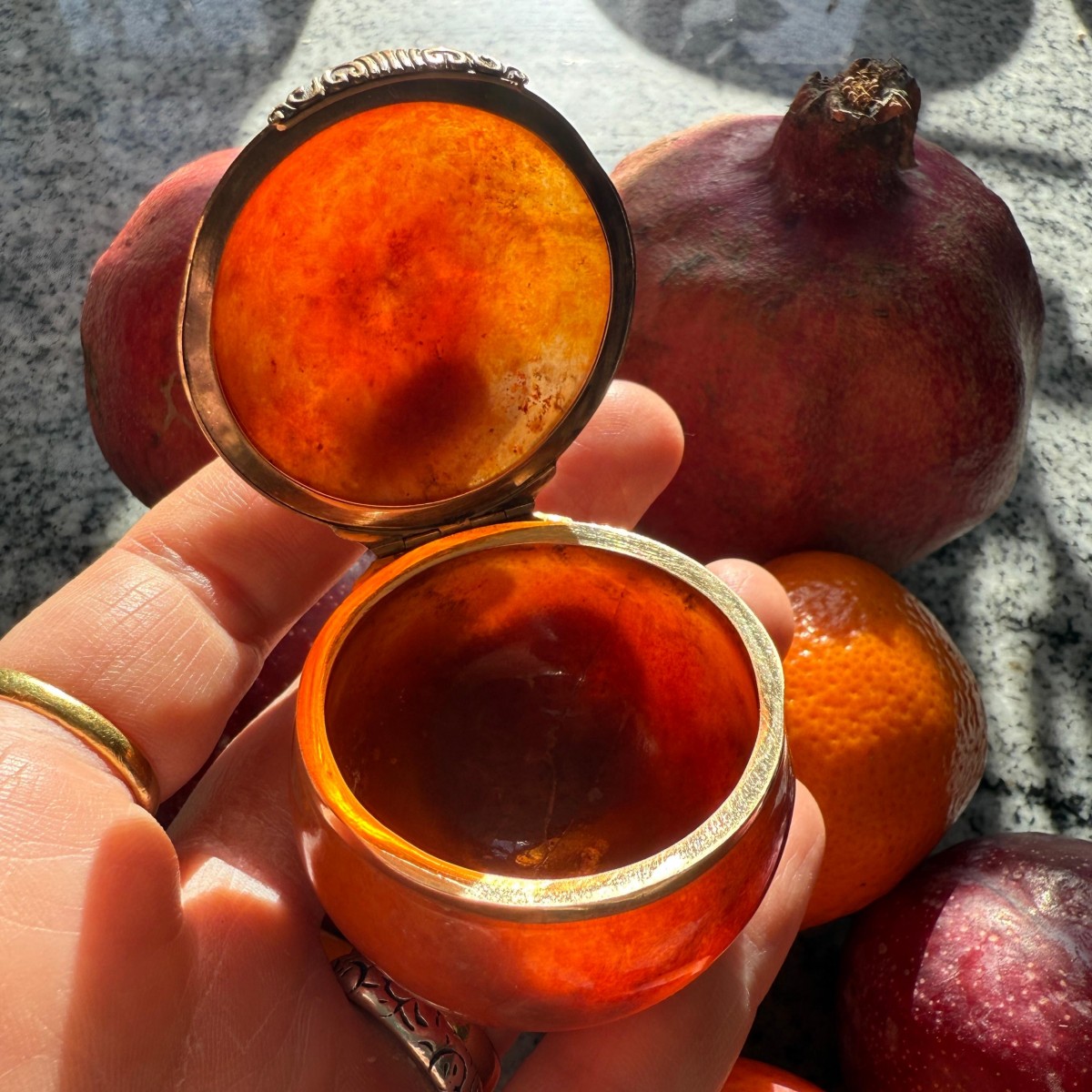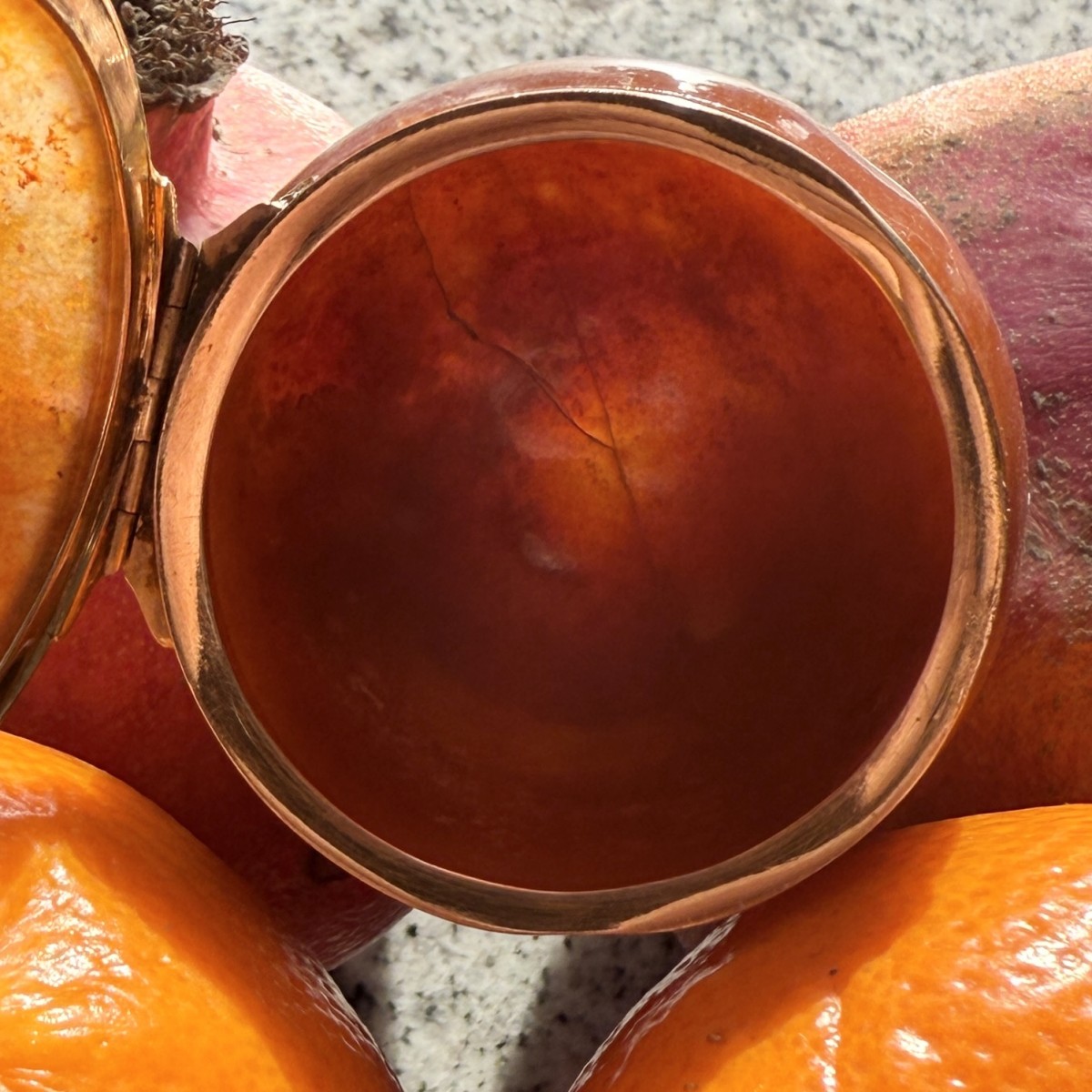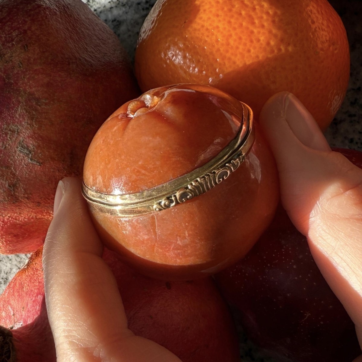 A rare and exquisitely carved bonbonnière in the form of an orange, fashioned from a single block of translucent orange agate with natural mottling and veining imitating the variegated rind of the fruit. The lid and lower section are joined by a chased gold mount, finely worked with symmetrical rocaille and shell motifs typical of the Rococo taste. The upper surface of the stone is subtly carved with the fruit’s natural pedicel and radiating depressions, the lapidary capturing with remarkable delicacy both texture and contour.