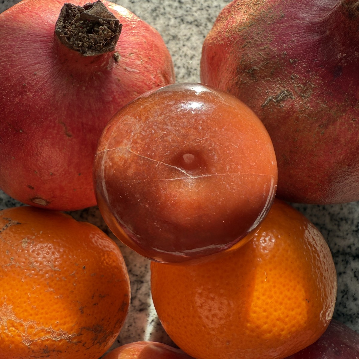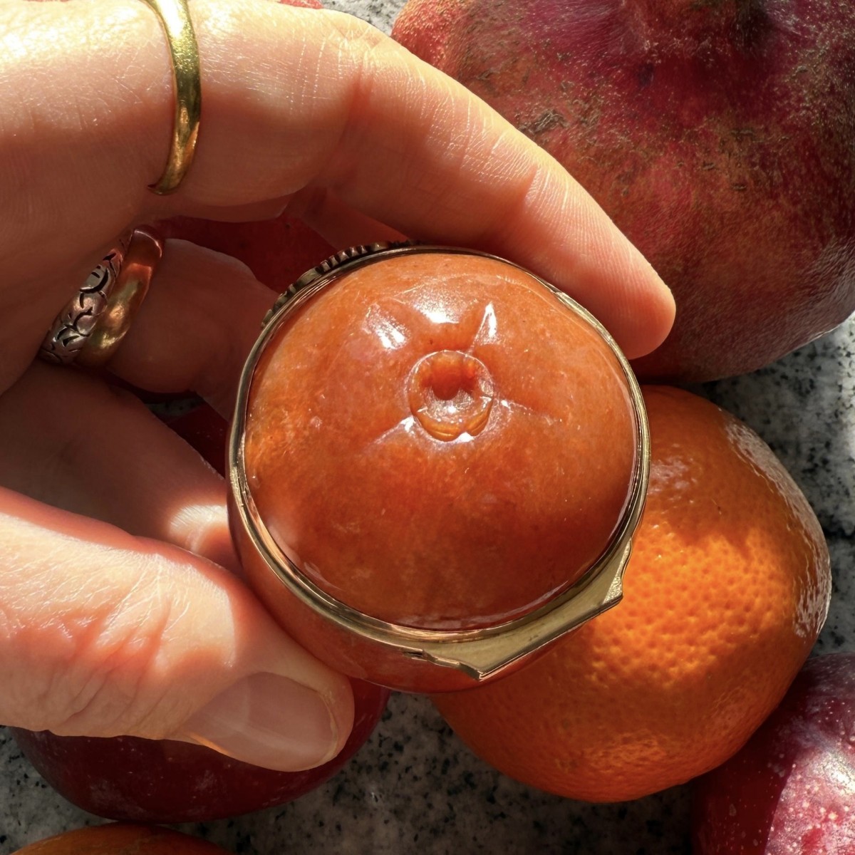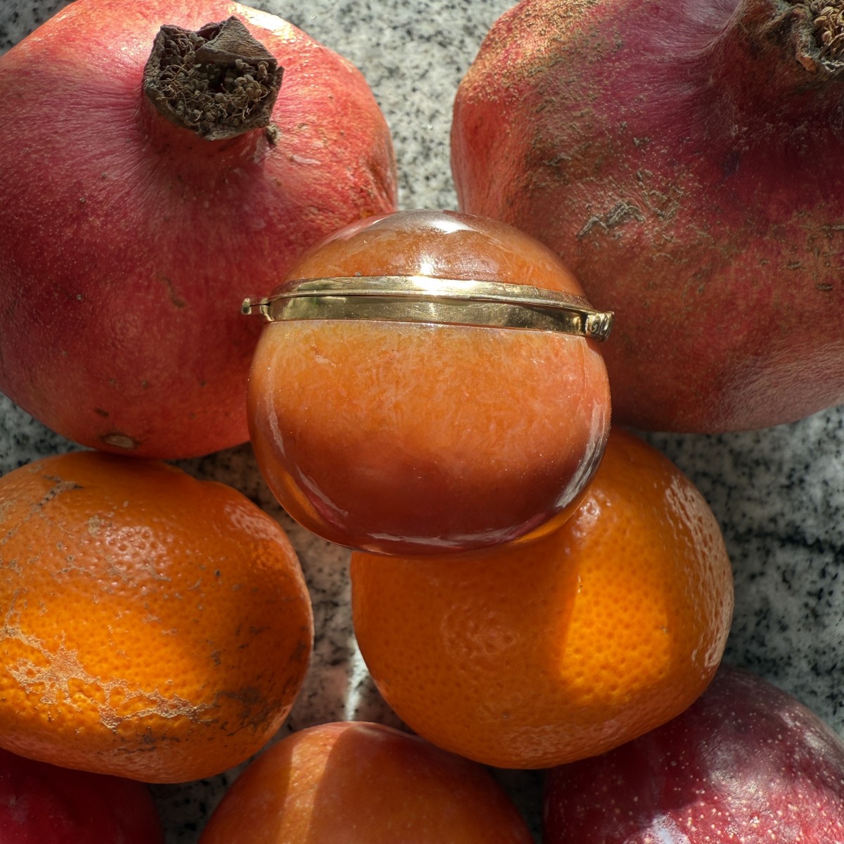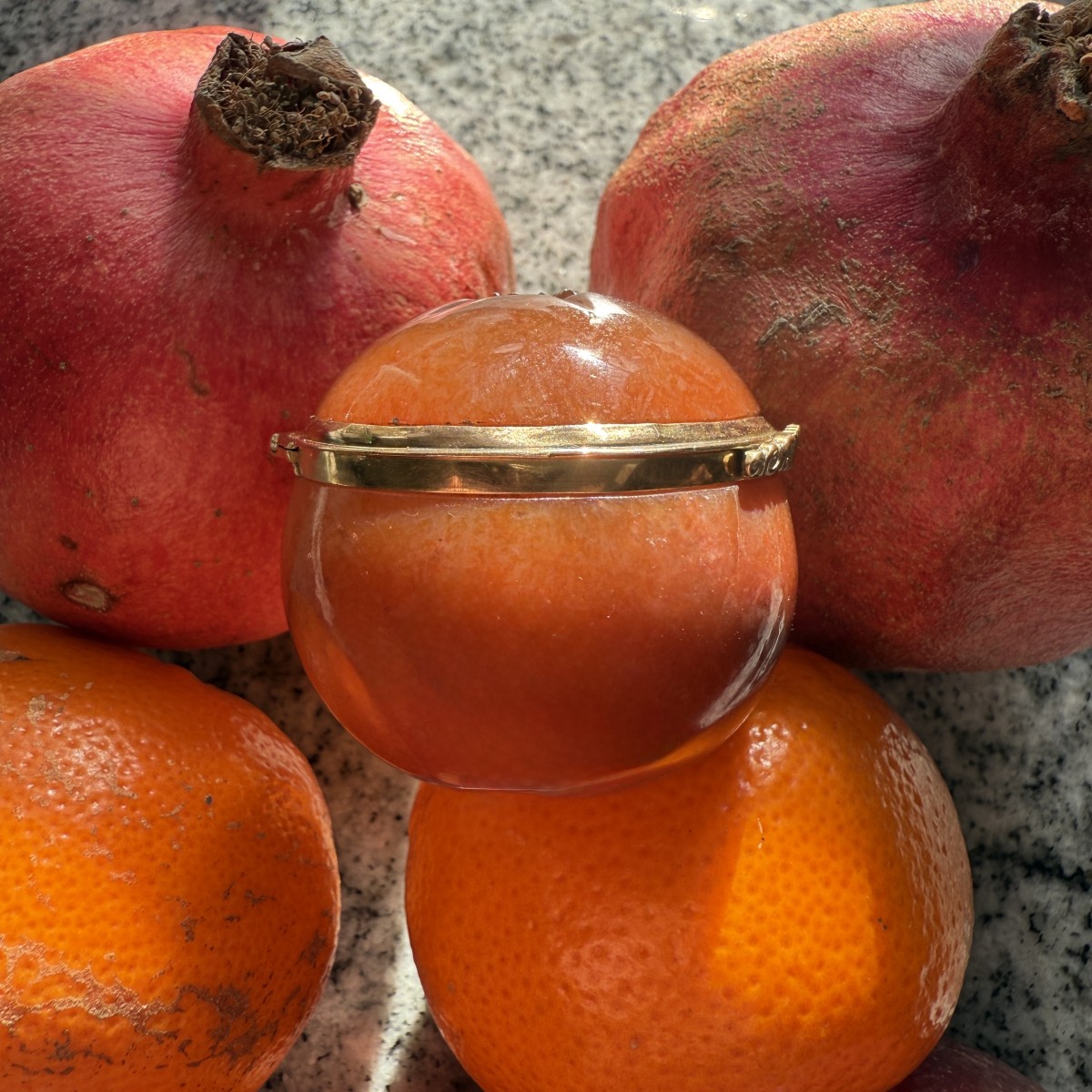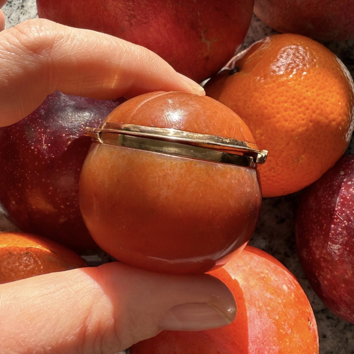 A rare and exquisitely carved bonbonnière in the form of an orange, fashioned from a single block of translucent orange agate with natural mottling and veining imitating the variegated rind of the fruit. The lid and lower section are joined by a chased gold mount, finely worked with symmetrical rocaille and shell motifs typical of the Rococo taste. The upper surface of the stone is subtly carved with the fruit’s natural pedicel and radiating depressions, the lapidary capturing with remarkable delicacy both texture and contour.