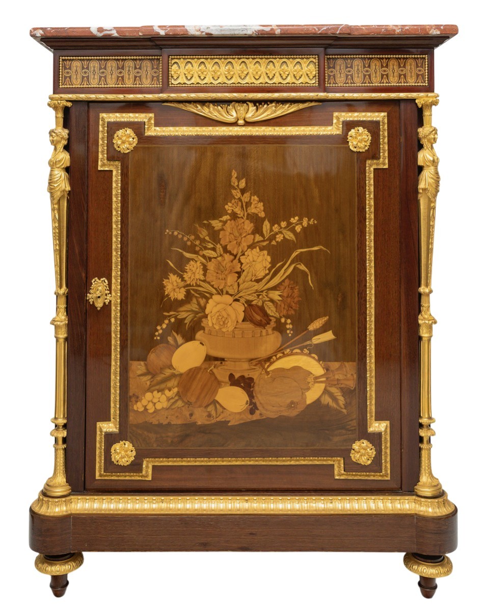 The façade consists of a central door decorated with a vase containing a bouquet of flowers, above a composition of fruits, executed in several precious wood veneers. The finely chased and mercury-gilded bronzes, notably the two caryatids framing the door, add majesty and elegance to the piece.