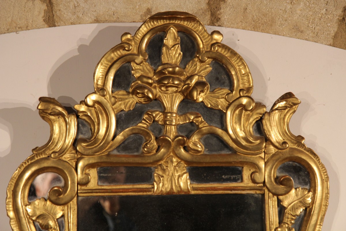 18th C gilded and carved wooden beaded mirror known as «from Beaucaire» with vine branches decor and bouquet of flowers at the pediment. Mercury tain.