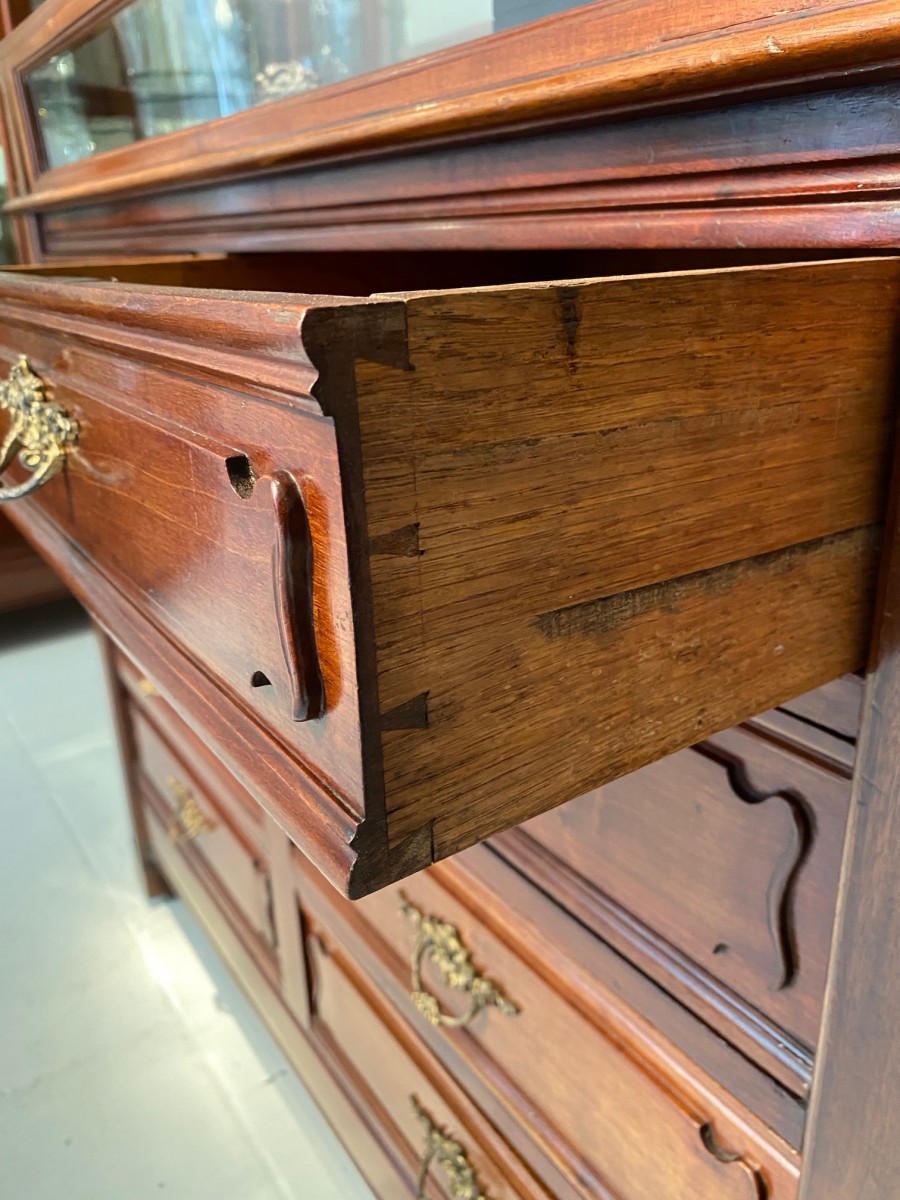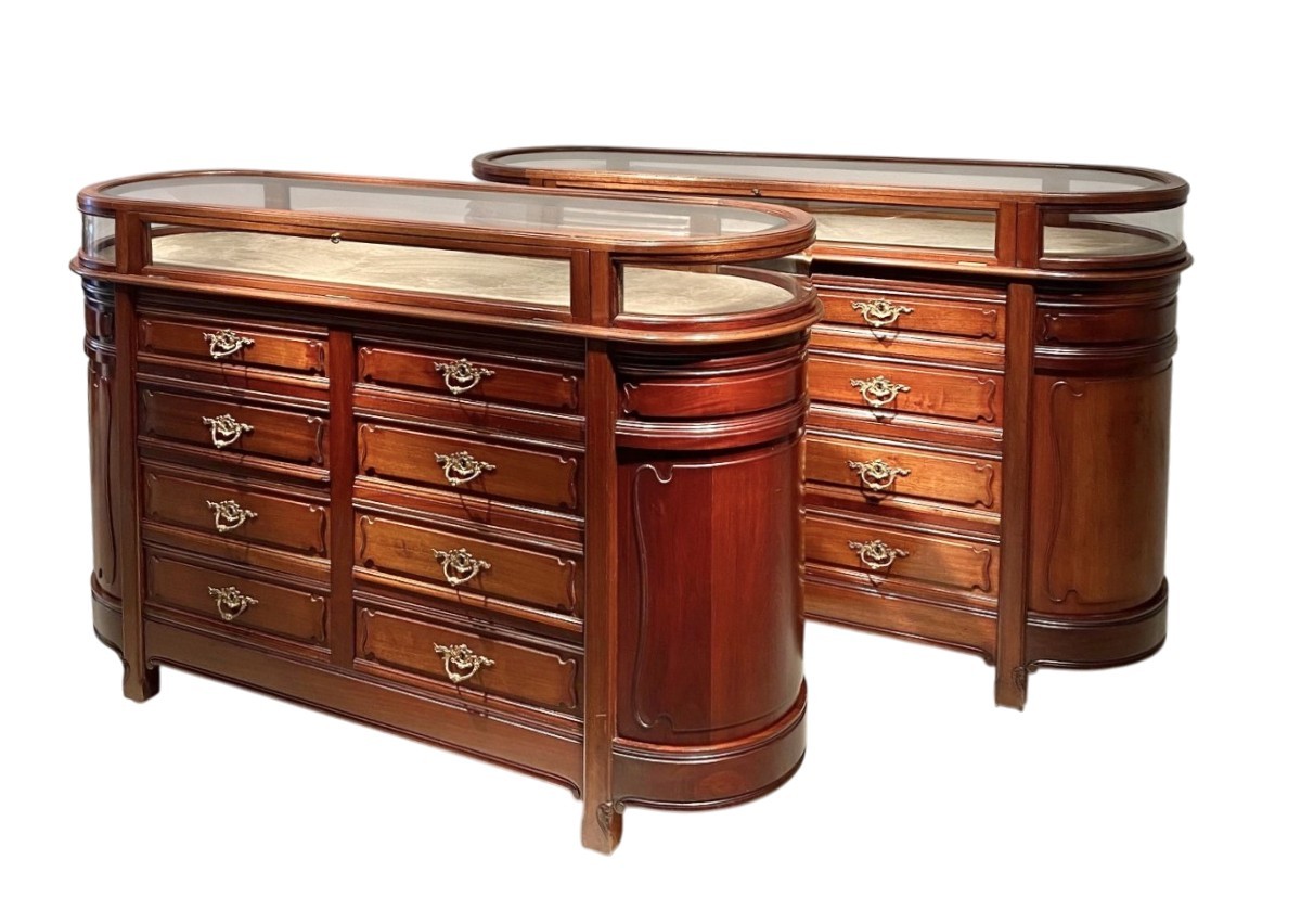 An exceptional pair of identical freestanding Art Nouveaudisplay counters in richly polished mahogany, originally designed for ajewellery boutique. Each counter features elegant, rounded ends and flowing,sinuous lines characteristic of the Art Nouveau period. The upper section comprises a vitrine display case withcurved and bevelled cut-glass panels and top, allowing for an elegantpresentation of jewellery or other fine objects. Below, the counters are fittedwith multiple drawers adorned with finely cast gilt-bronze handles, providingboth beauty and practicality. Beautifully detailed on all sides, these counters wereconceived to stand freely in the room or dressing room, making them visuallystriking from every angle. A remarkable example of late 19th-century commercialcraftsmanship, combining utility with refined artistic design.