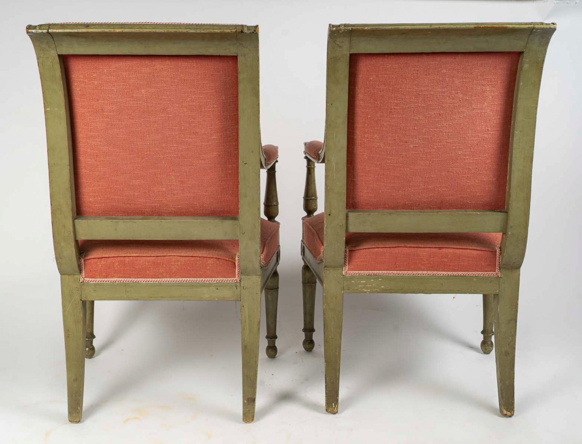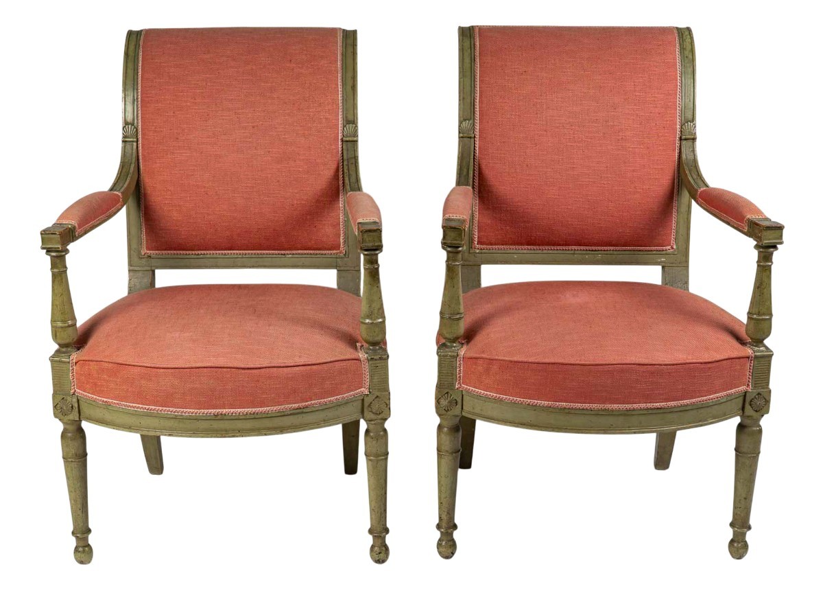 A refined pair of green lacquered beech armchairs, retaining their original lacquer. The armchairs feature rear sabre legs and front "Jacob" legs. The carved connecting blocks, equipped with scrapers, support baluster-shaped uprights. Their generous seats and reclined backs make them both comfortable and elegant pieces.