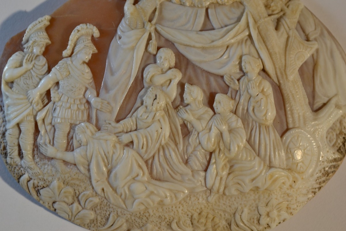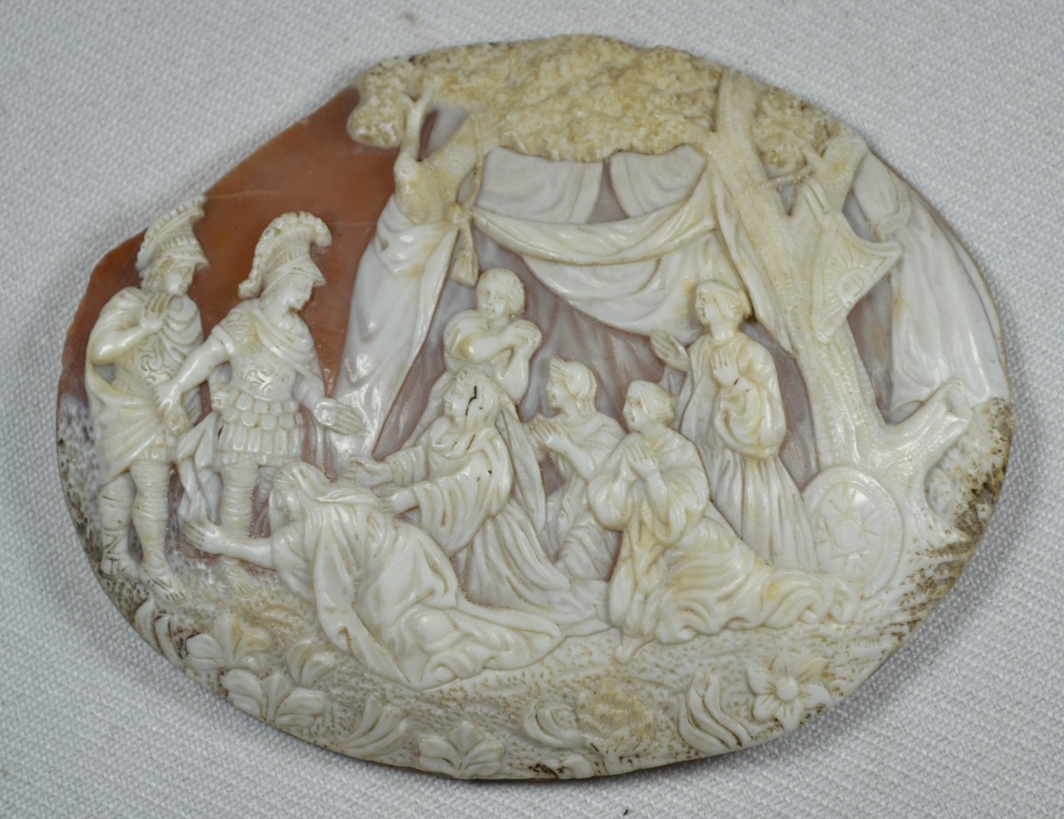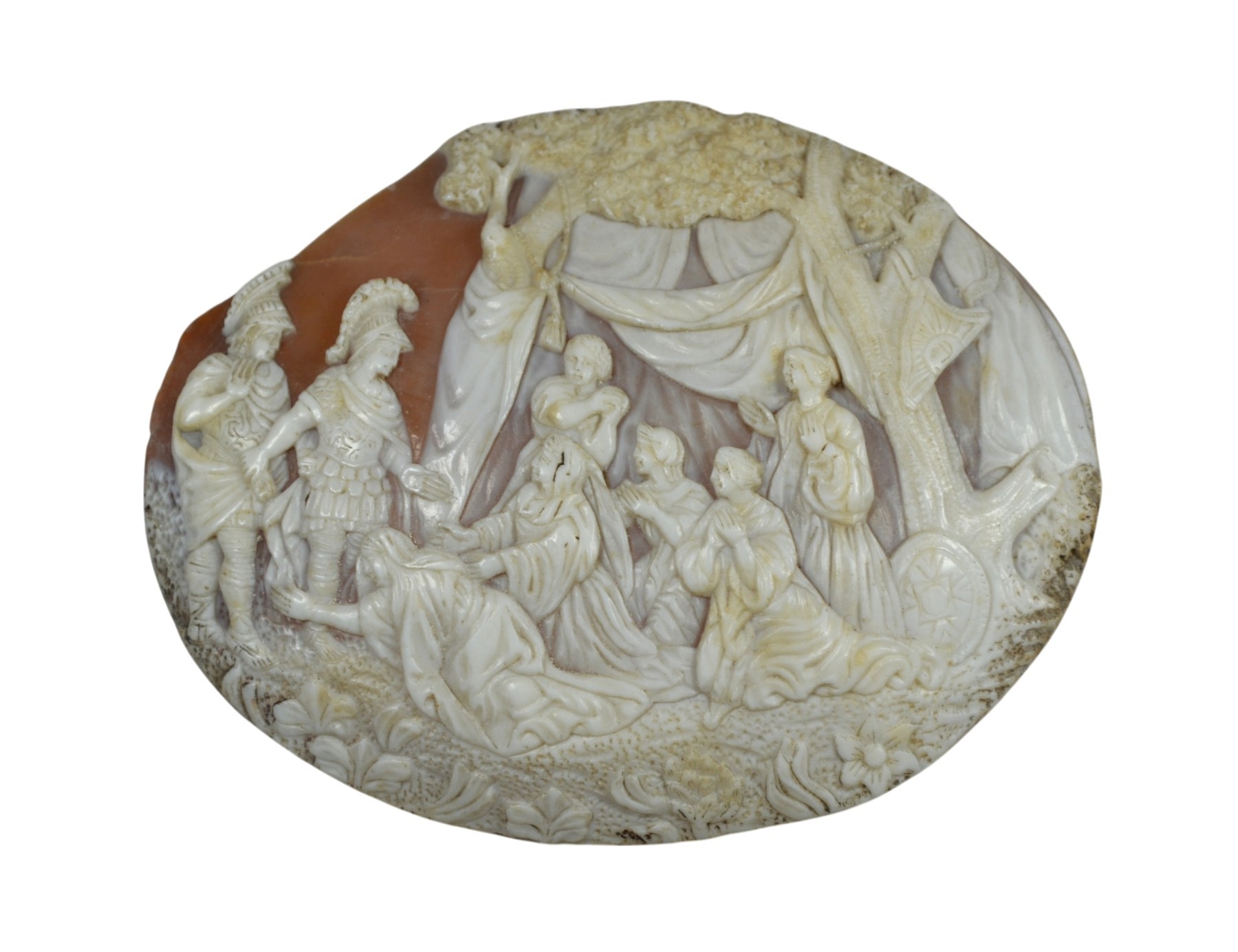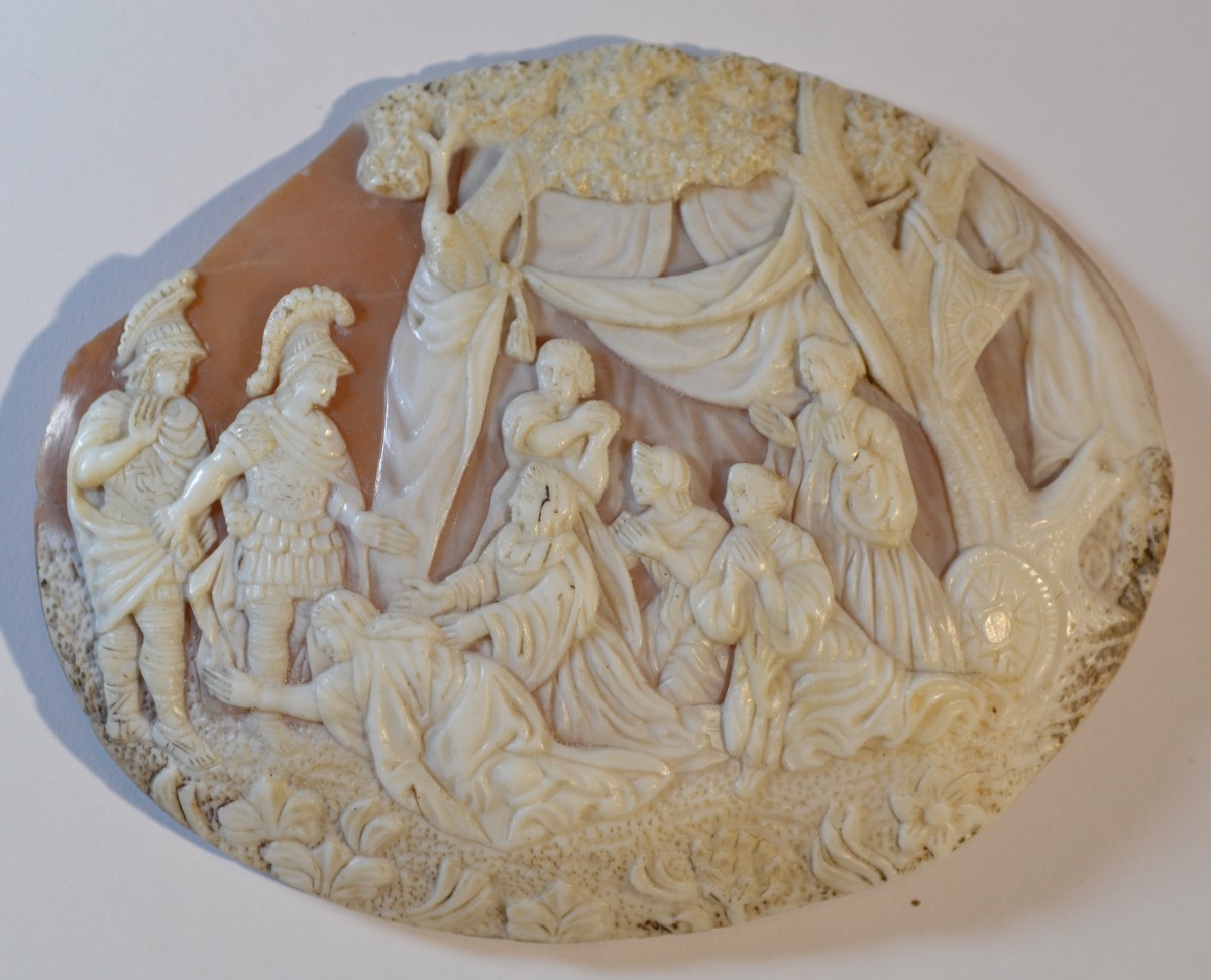 The shell is carved in high relief with an antique scene, probably illustrating the clemency of Alexander the Great sparing the family of the defeated Persian king Darius. This scene was frequently depicted during the Italian Renaissance. Good condition, no restoration, no grinding, a large loss in the background which, however, completely preserves the decoration. Italian work from the second half of the 16th century, Florence or Lombardy.