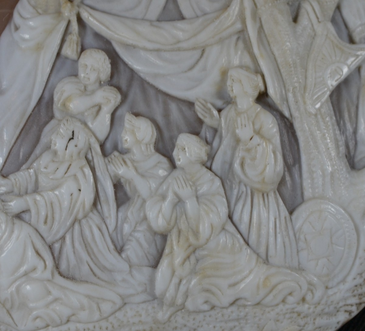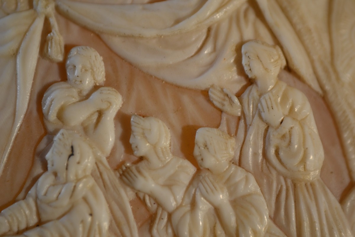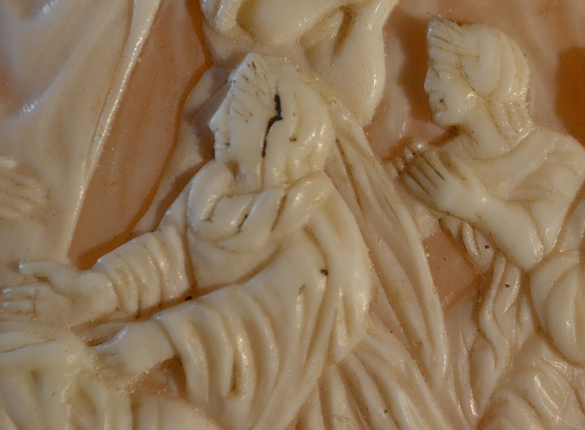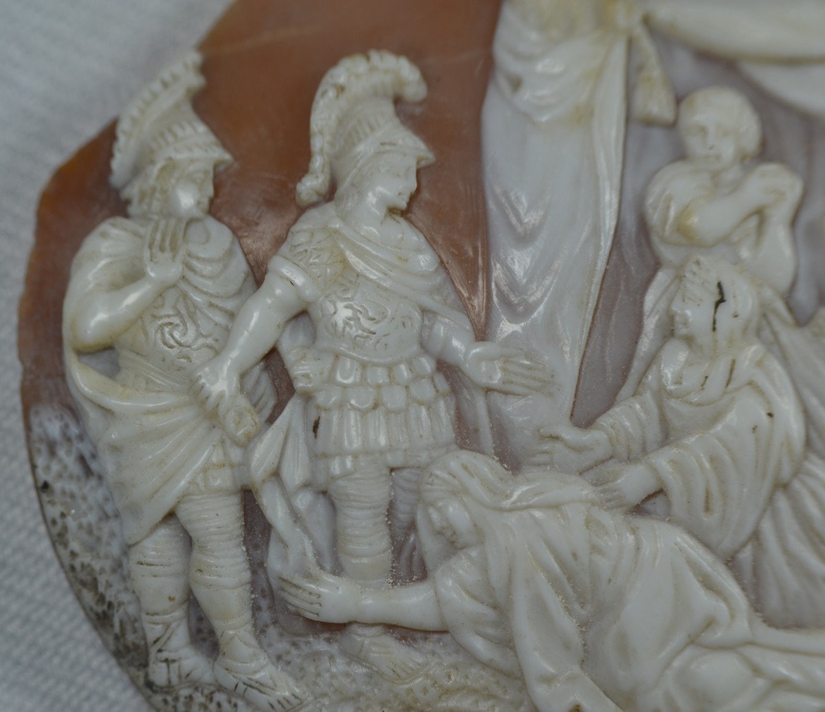 The shell is carved in high relief with an antique scene, probably illustrating the clemency of Alexander the Great sparing the family of the defeated Persian king Darius. This scene was frequently depicted during the Italian Renaissance. Good condition, no restoration, no grinding, a large loss in the background which, however, completely preserves the decoration. Italian work from the second half of the 16th century, Florence or Lombardy.