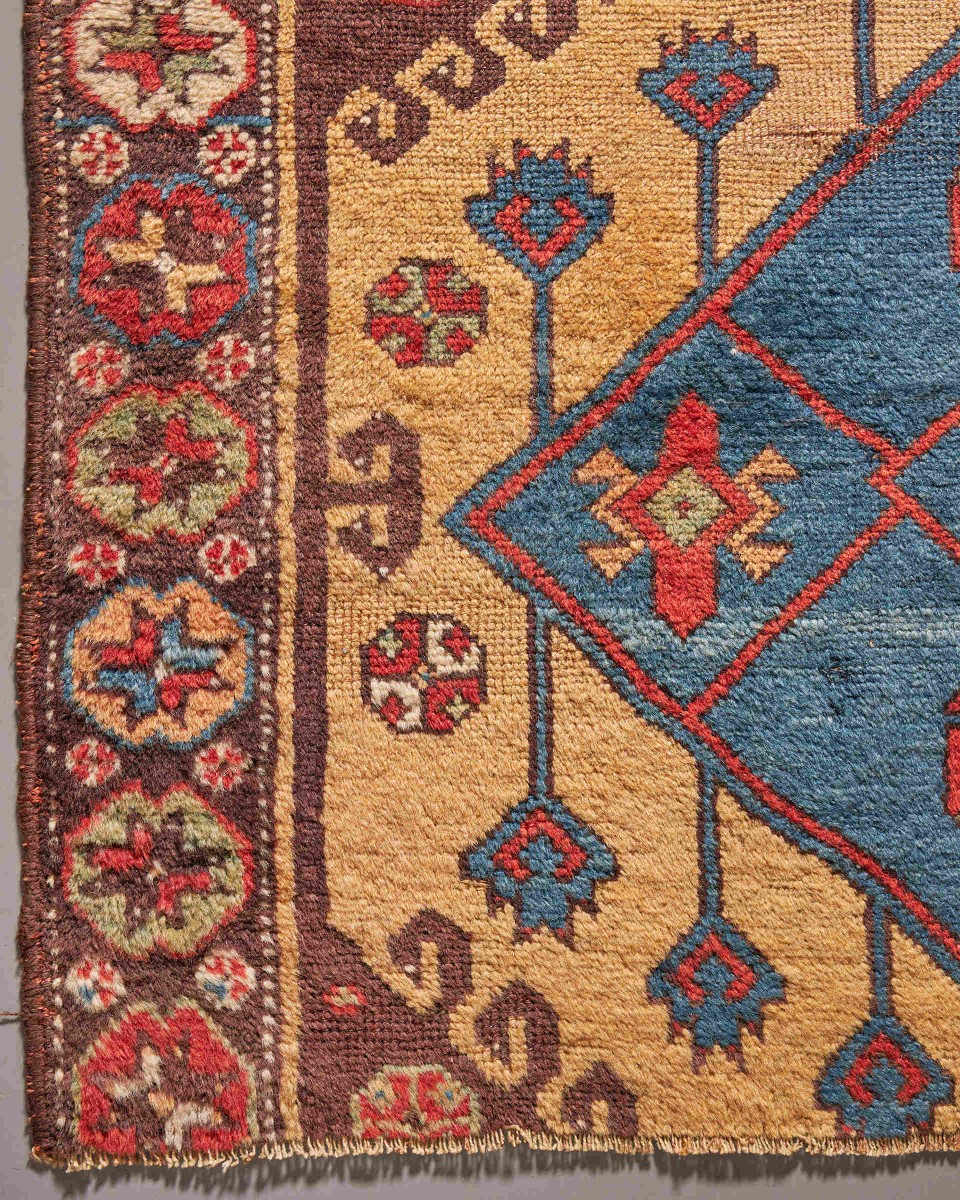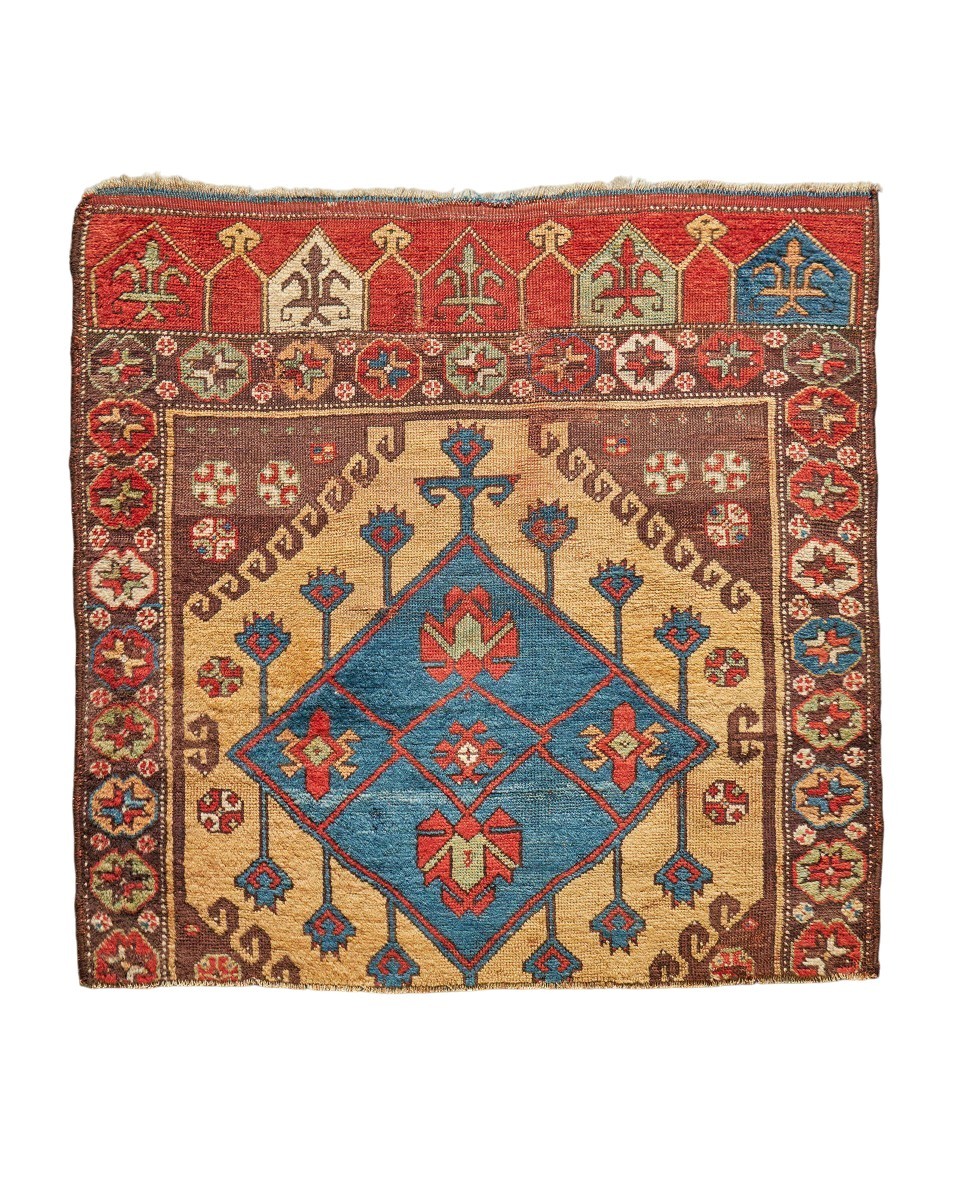 This attractive fragment comes from a longer runner and is decorated with a large blue-red diamond medallion with an inner field of yellow and an outer one of brown/aubergine, within a border of eight-pointed star cartouches, and end-lappets of alternating trident-filled arches and simple mihrabs, all on a tomato red ground.