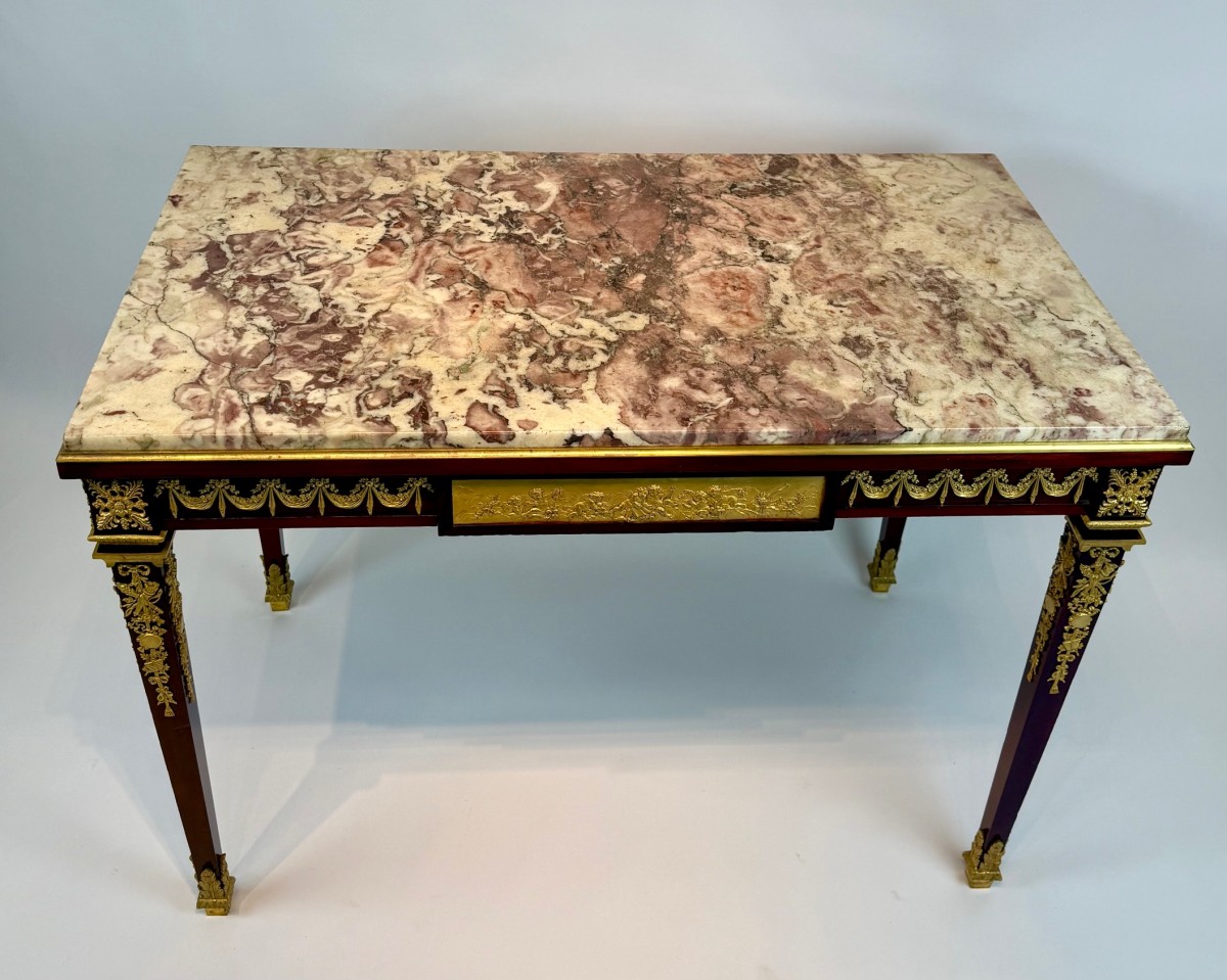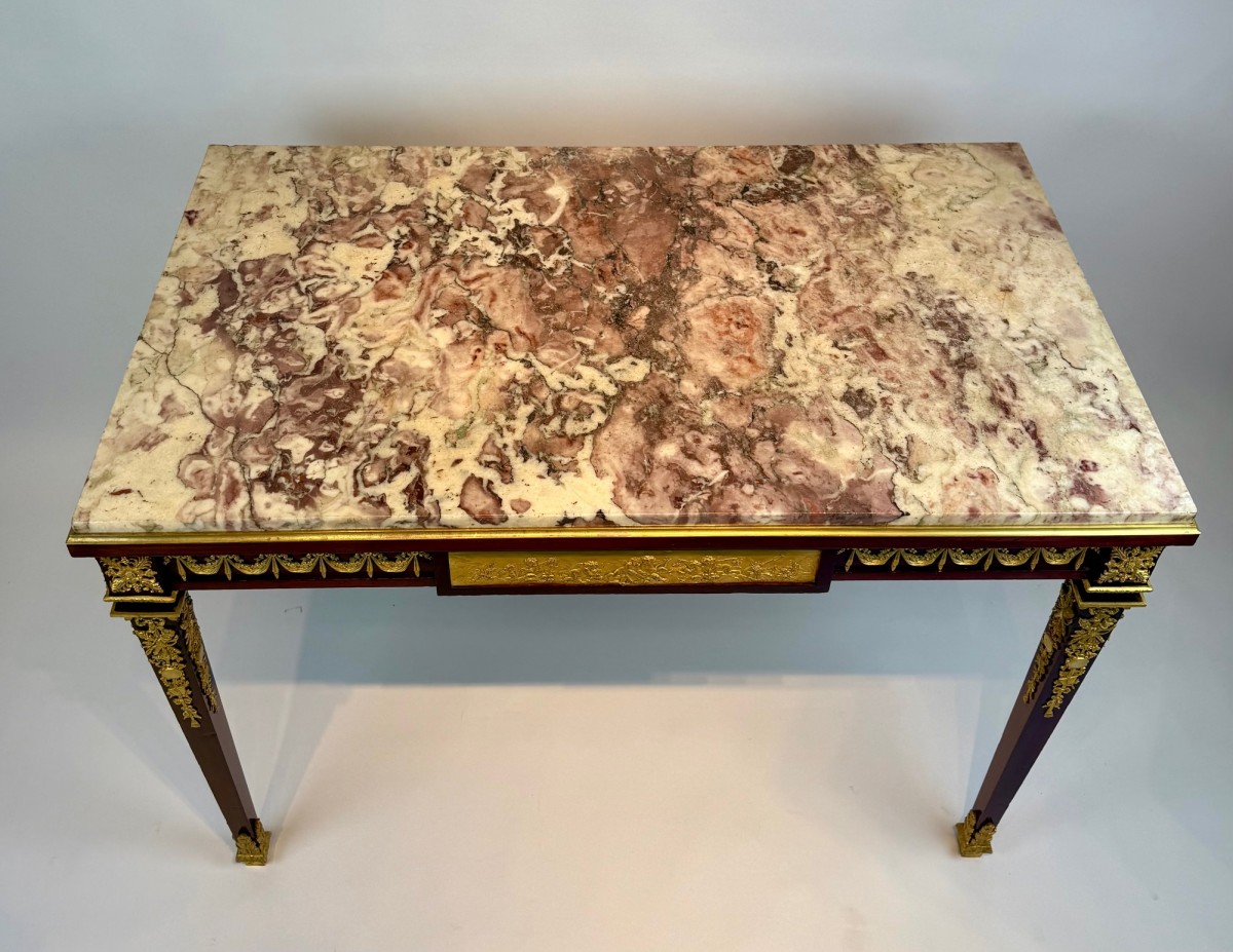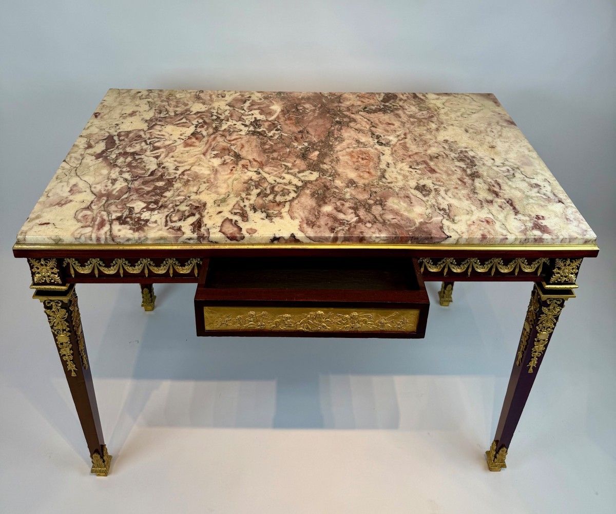 A fine Louis XVI–style writing table, the rectangular top inset with richly veined Brèche Violette marble within a gilt-bronze molded border. The mahogany frame is adorned with exceptionally detailed gilt-bronze mounts, including floral swags, rosettes, and classical trophies, reflecting the refined neoclassical taste of the period.