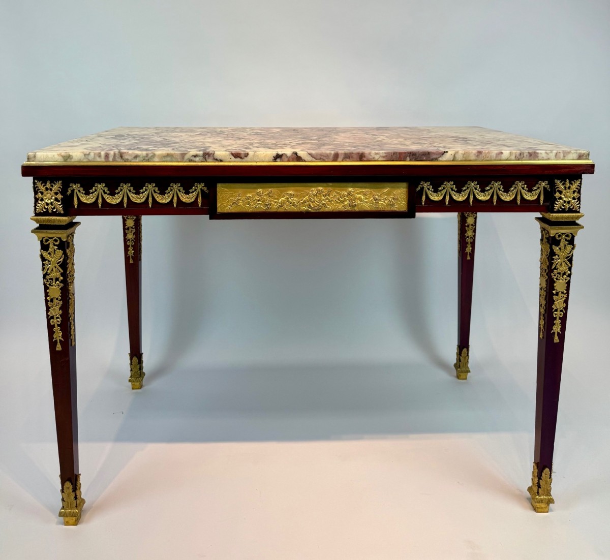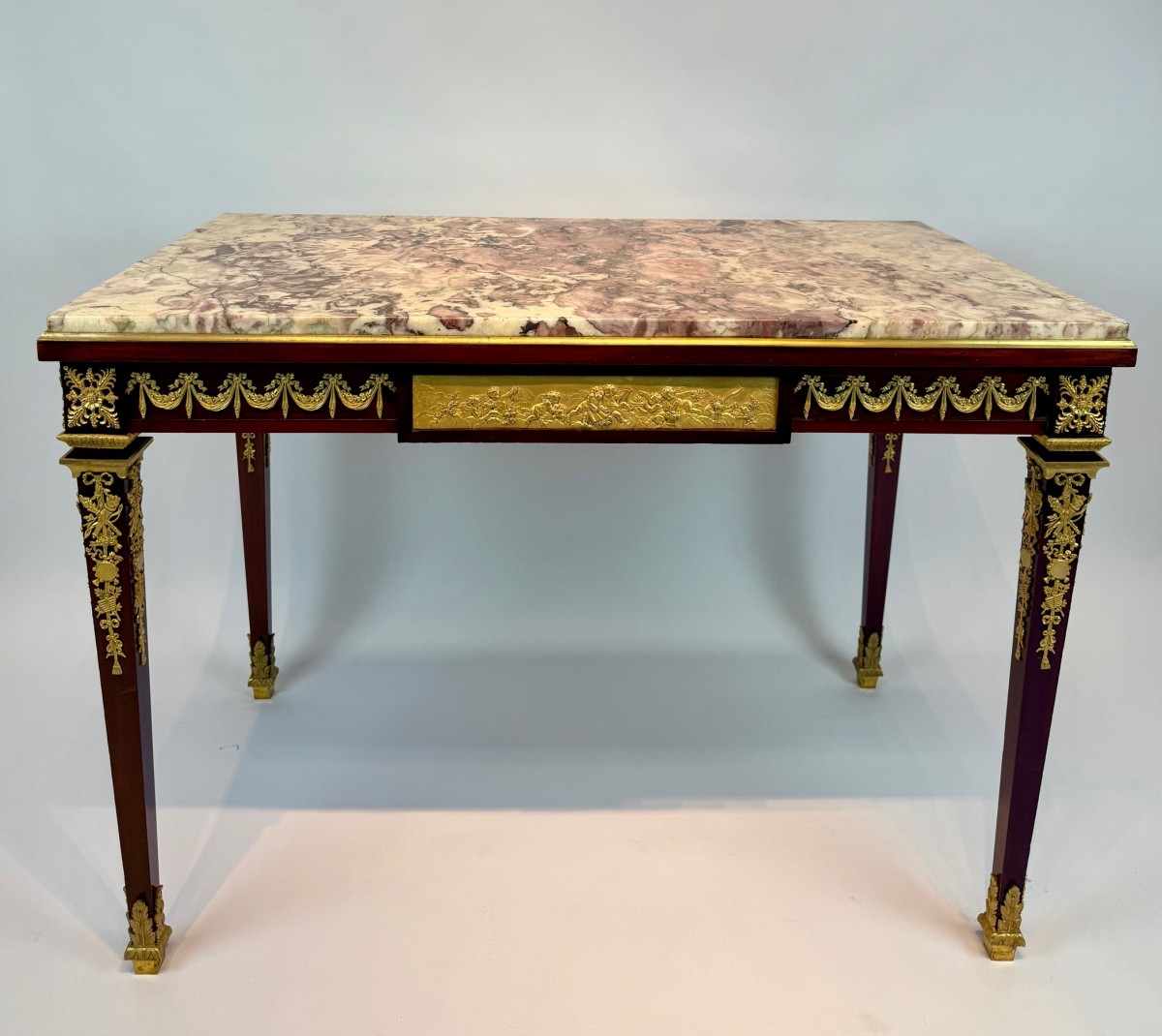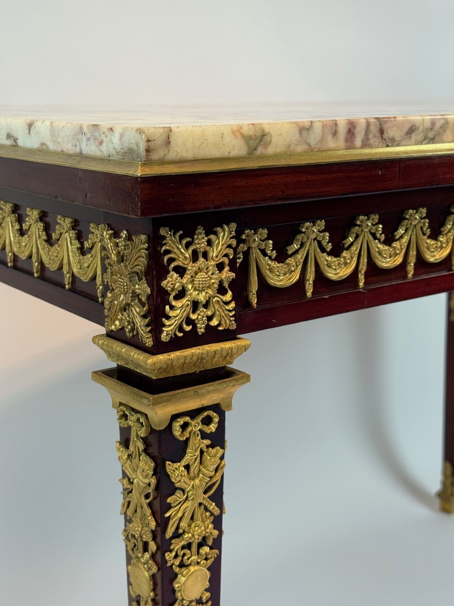 A fine Louis XVI–style writing table, the rectangular top inset with richly veined Brèche Violette marble within a gilt-bronze molded border. The mahogany frame is adorned with exceptionally detailed gilt-bronze mounts, including floral swags, rosettes, and classical trophies, reflecting the refined neoclassical taste of the period.