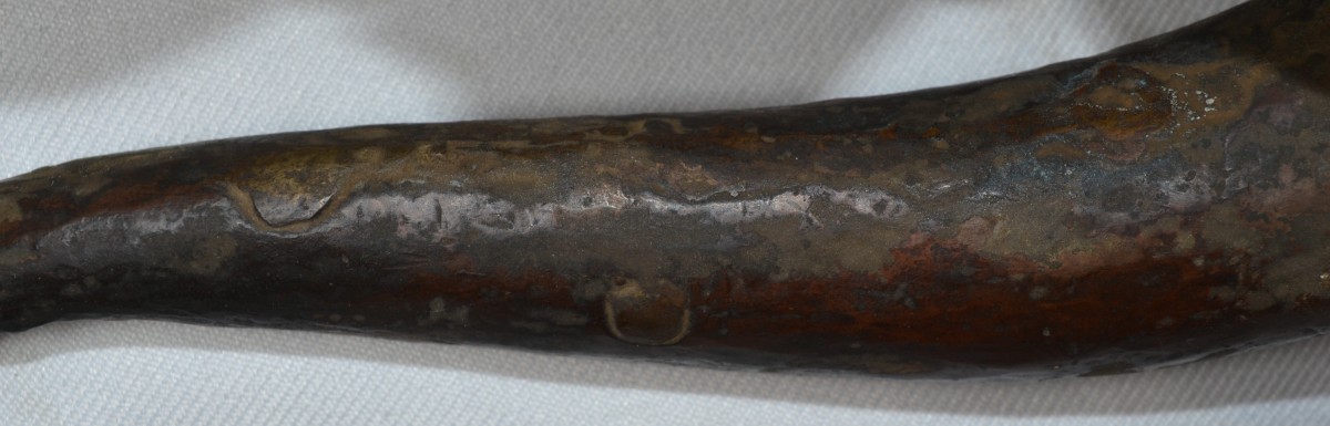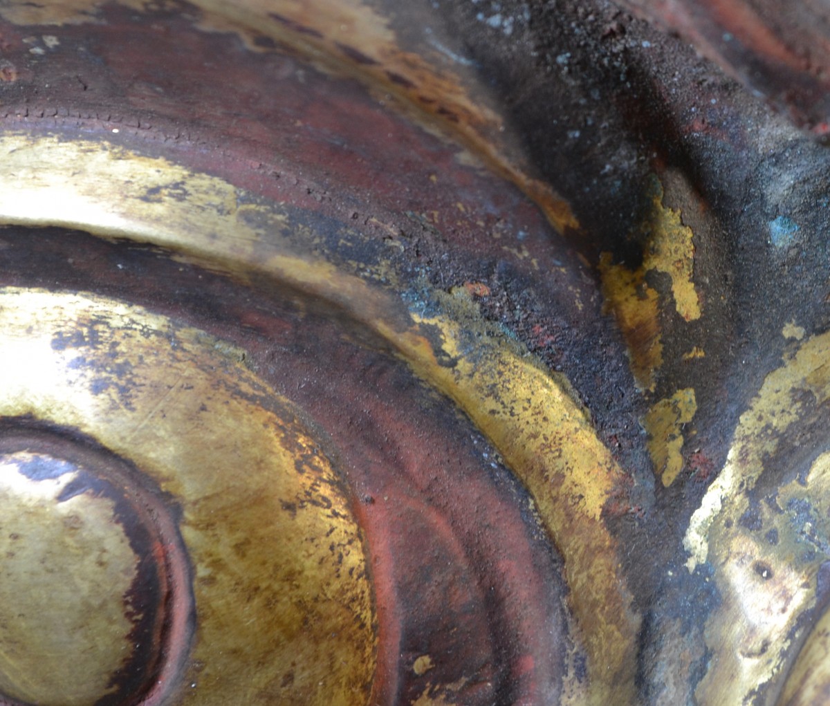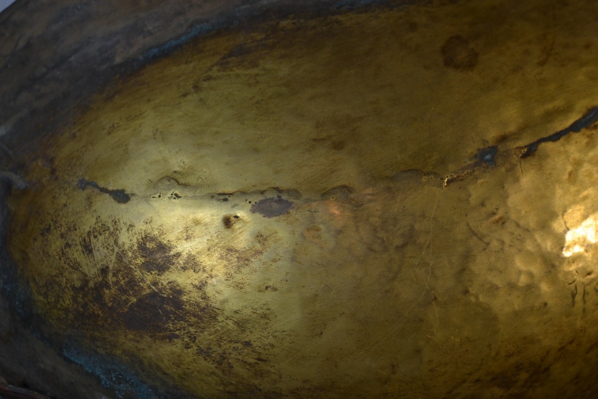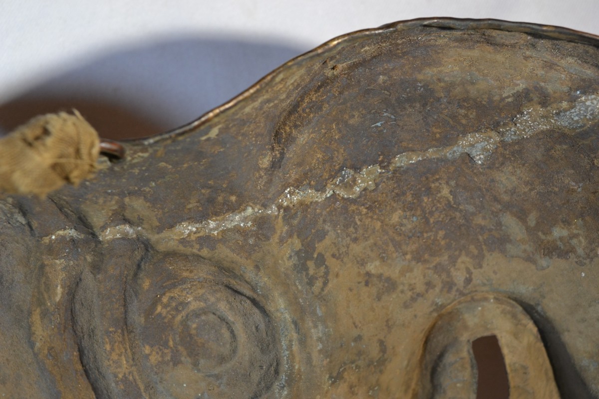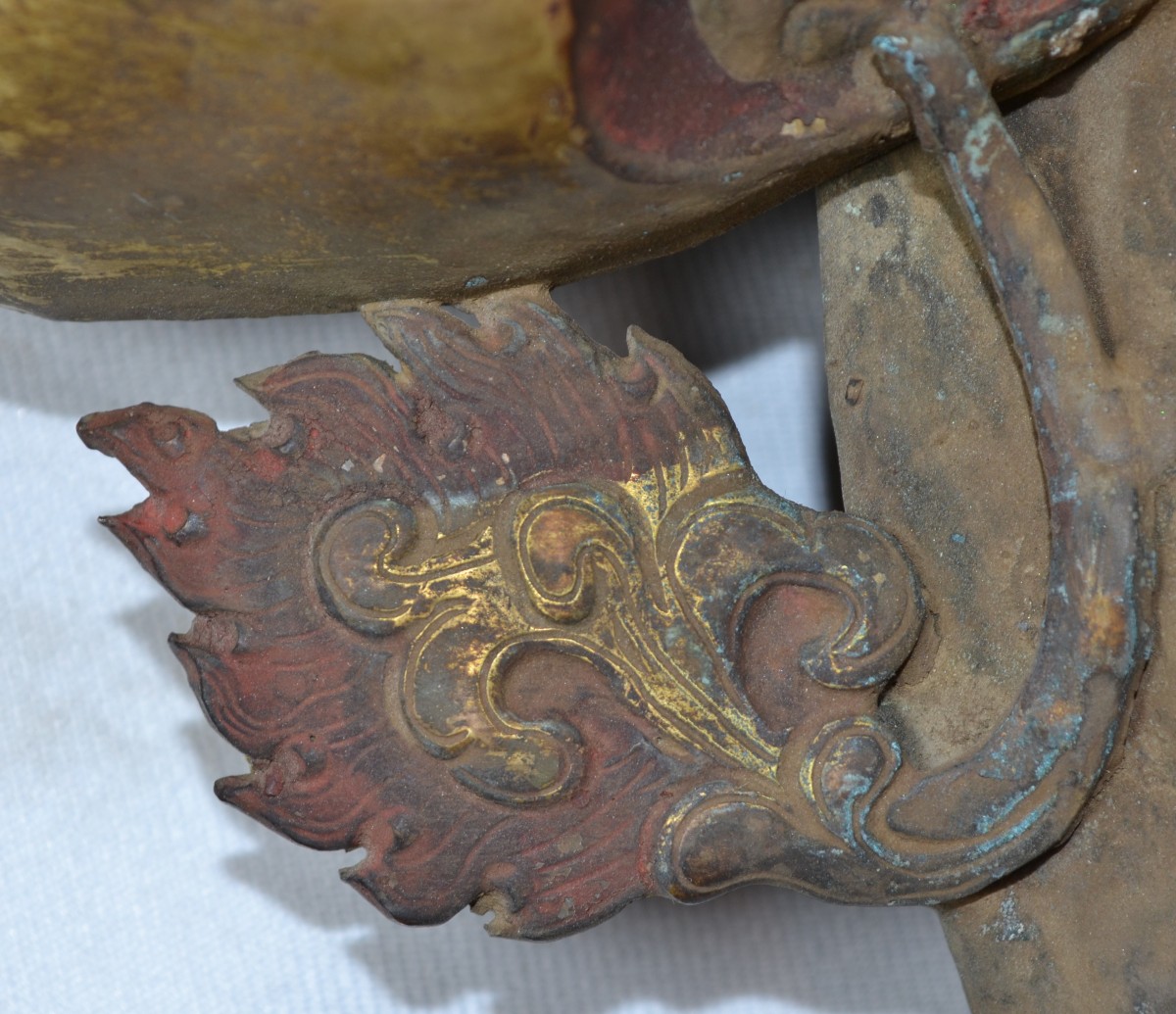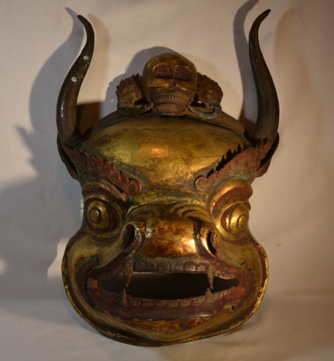 The mask represents the fearsome bull-headed deity Yamantaka. Between the horns appears the skull, a symbol of victory over ignorance and death. A major monastic work in repoussé copper, gilded with mercury, with details in mineral pigments. Made in several parts assembled by brazing and welding, traces of which are visible in some photos. This type of mask was worn by dancing monks during religious festivals. Difficult to date precisely; a specialist might be able to do so, 19th century or earlier. The openings for the nostrils allow good visibility for the dancer. Dimensions: 40 x 30 x 20 cm. Good condition, no restoration, original colors and gilding.