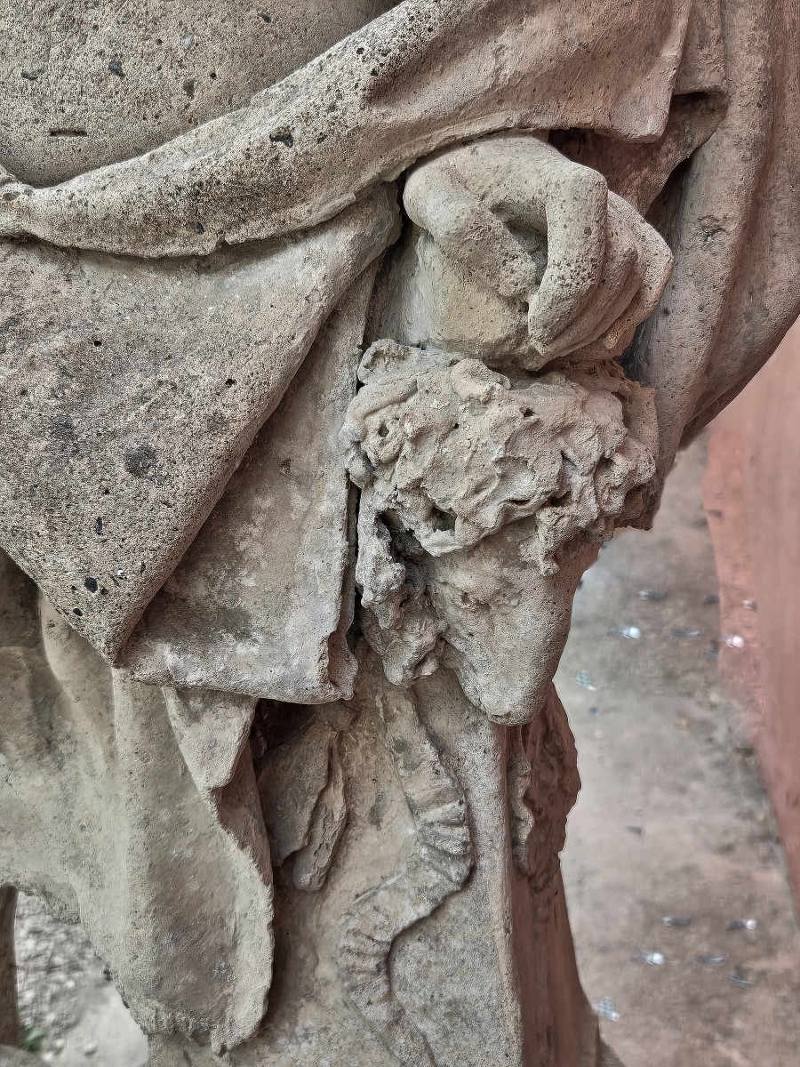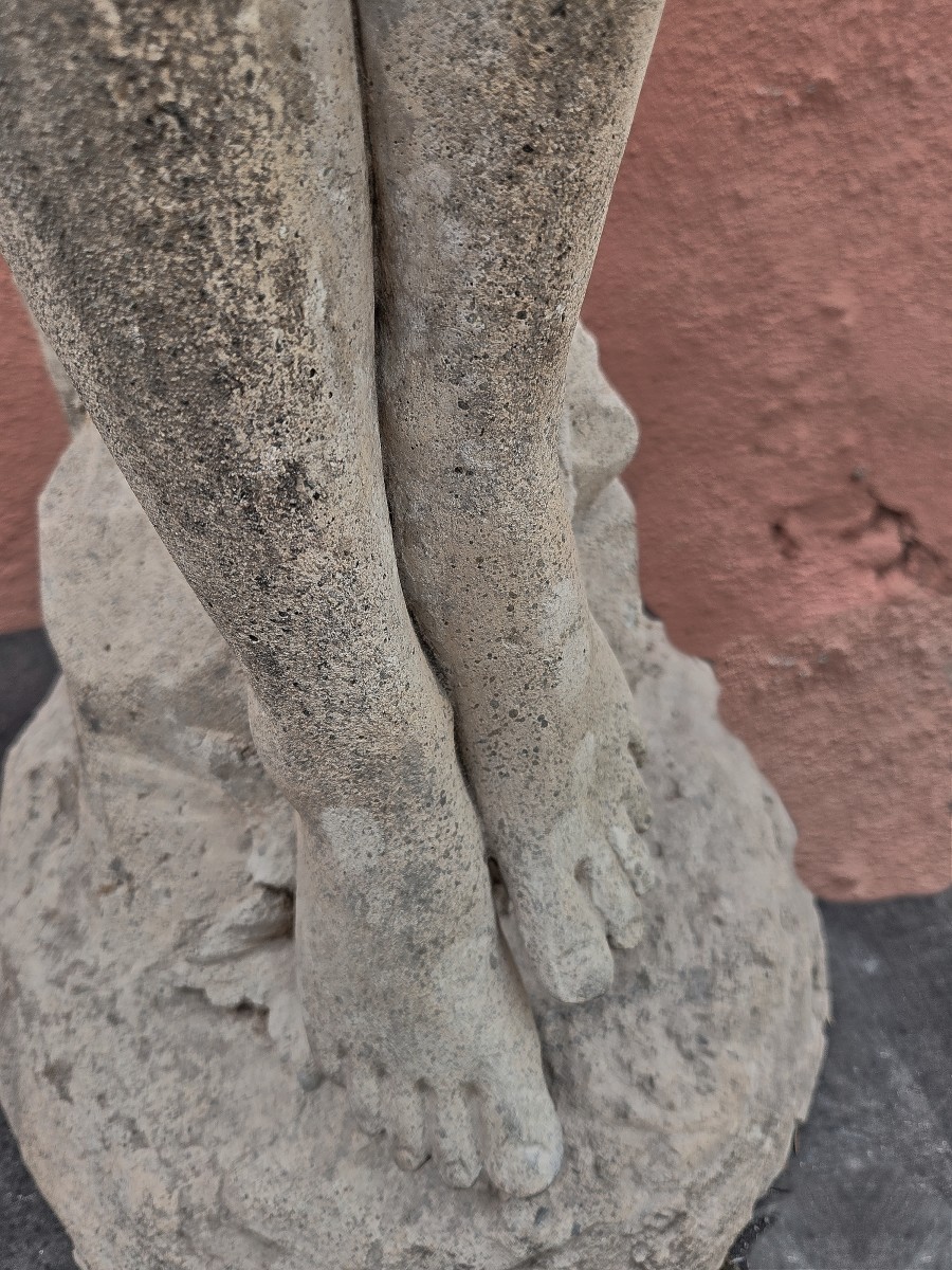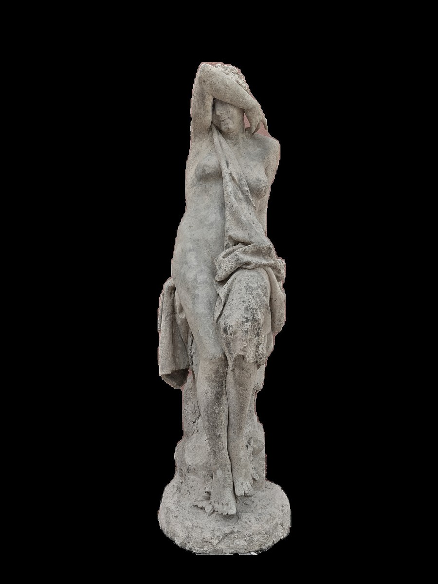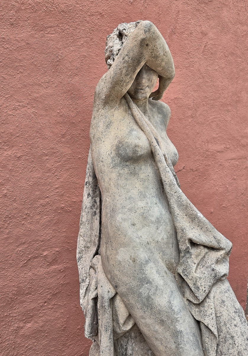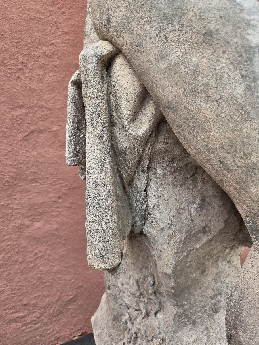 She sits upright on the gilded tile, represented on the side by the ram's head. In an attitude of chastity, she holds her left arm above her face. A piece of fabric hangs from her shoulder. The statue is most likely made of Brossasco marble, a material highly prized by Piedmontese sculptors. Umberto Baglioni studied in Modena, Urbino, and Florence, then attended the academies of Turin and Florence, before becoming director of the Turin academy.