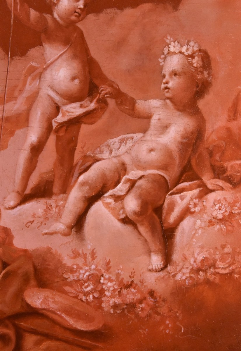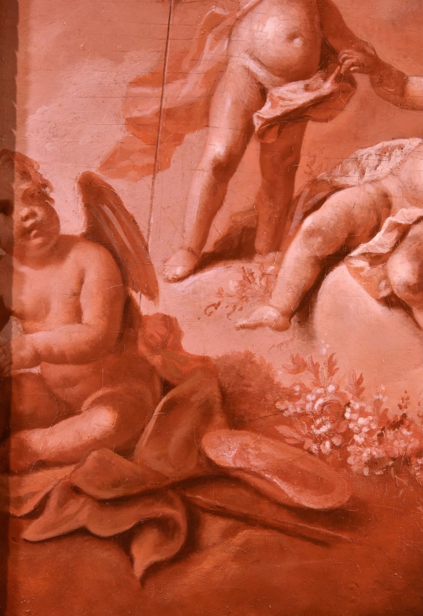 The painting we are presenting, depicting a playful group of cherubs and cupids, is rendered in the particular decorative technique called “en camaieu” (literally monochrome), achieved using different shades of the same colour, in this case purple. It is a work of great elegance and chromatic charm, created in the light and frivolous spirit of French Rococo.