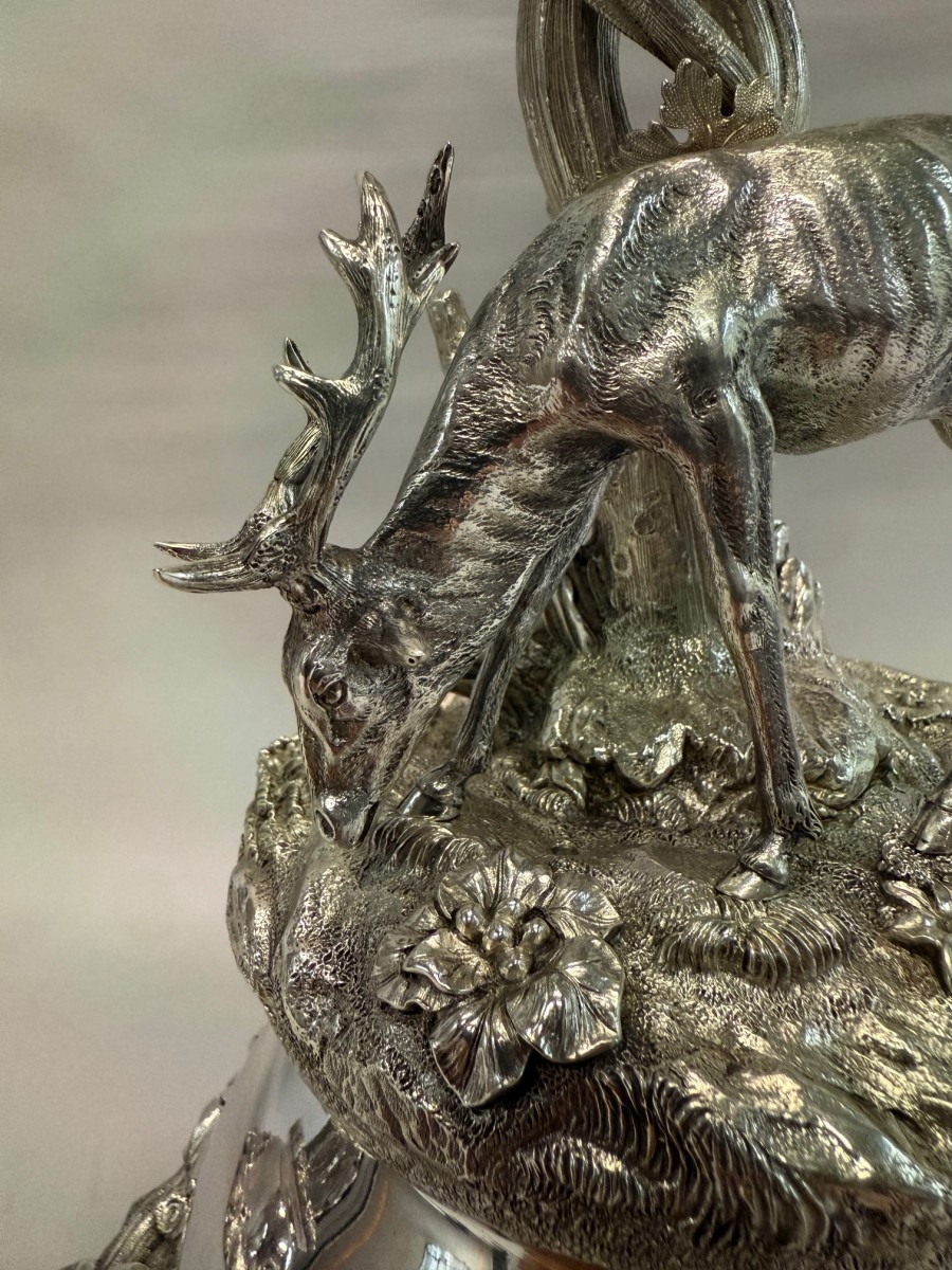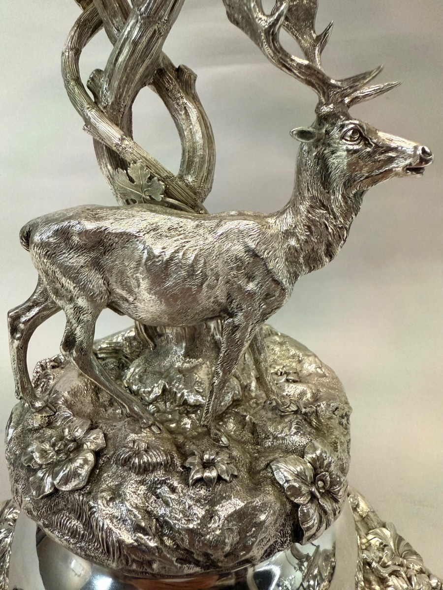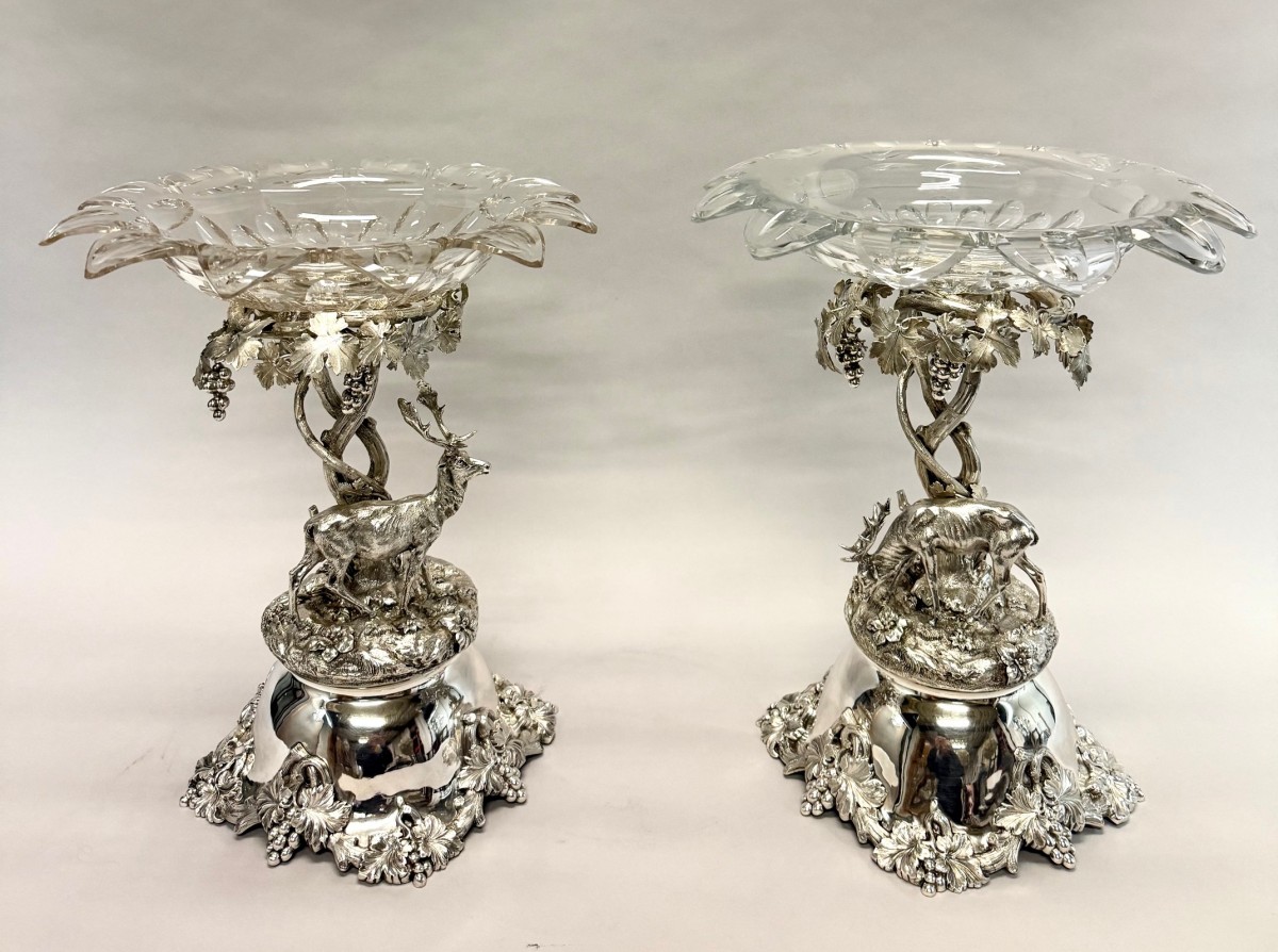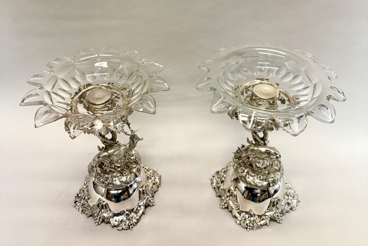 A magnificent pair of solid silver centerpieces by Van Kempen & Begeer, superbly modelled in naturalistic style. Each piece features a finely chased stag and doe amidst richly detailed foliage and flowers, set on a rocky base supporting a vine-entwined stem that rises to a detachable cut crystal bowl with a scalloped rim.