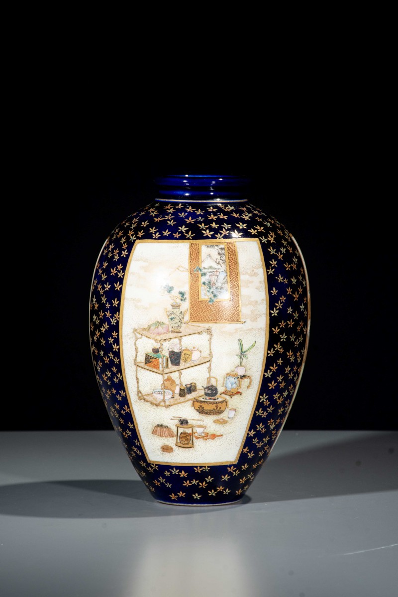 A Japanese Satsuma ceramic vase of ovoid form, with a cobalt-blue ground adorned with gilt floral motifs and decorated with scenes of courtly life, signed Kinkozan.