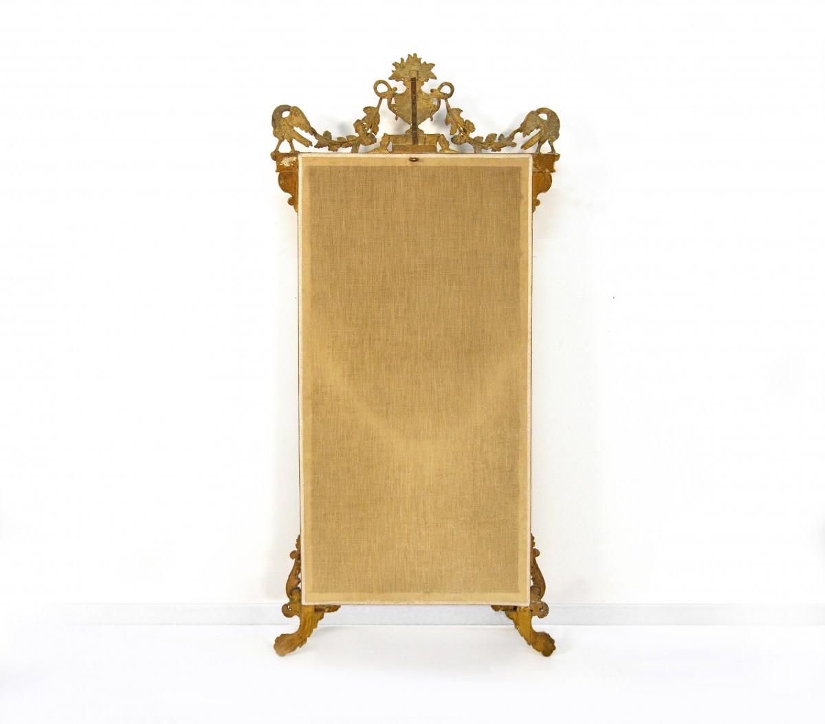 Carved and gilded wood mirror, Naples, late 18th century, rectangular frame with a fluted motif; on the cymatium, two birds each hold a floral garland that joins the handles of a flamed vase. At the base, two acanthus leaves rest on leafy tufts and lion's paws. 178 x 84 x 11 cm.