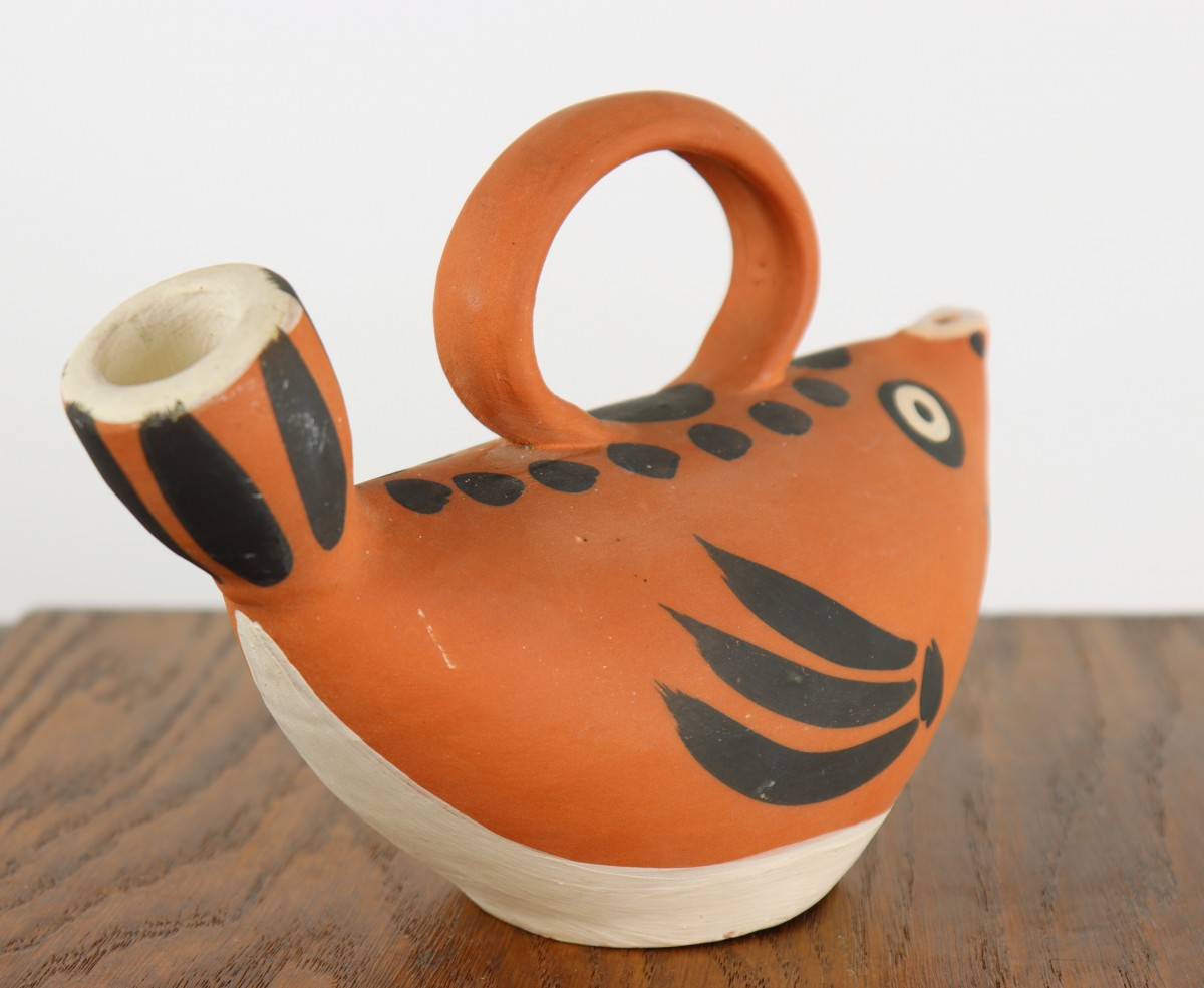 Sujet Poisson by Pablo Picasso, red earthenware pitcher, decorated with engobe, 500 copies produced. Marked “Edition Picasso Madoura” and stamped “Edition Picasso” and “Madoura” under the base, restoration to the spout.