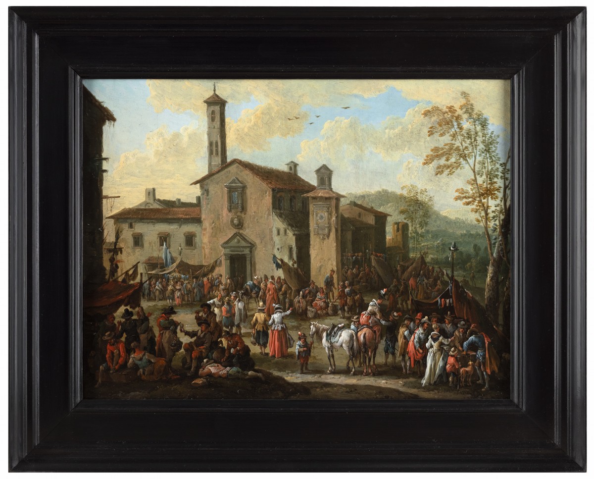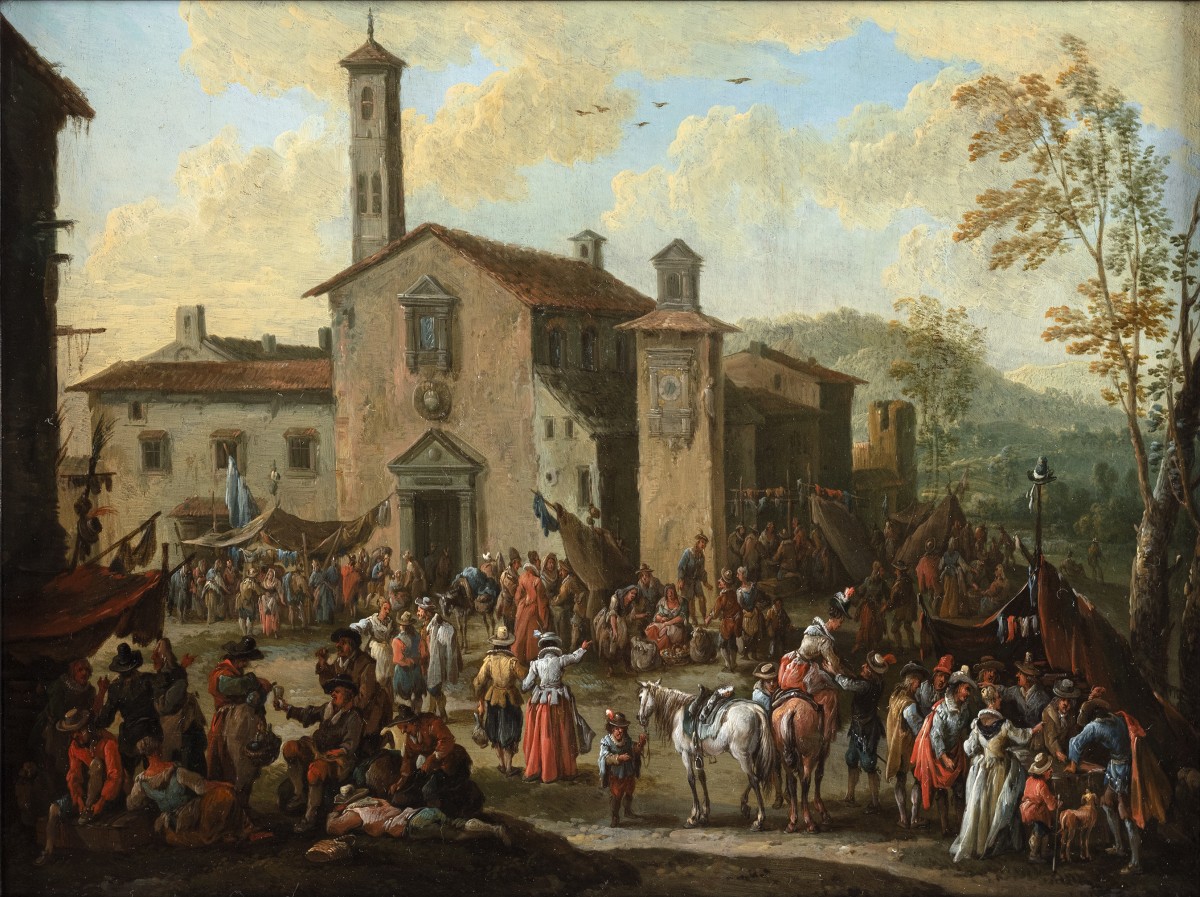 Ferg’s compositions are characterized by their miniaturist precision, warm tonality, and vibrant human activity. His figures, often dressed in bright reds and blues, animate rustic settings — fairs, markets, or harbours — which he painted with both humour and sympathy. These works reflect his ability to merge the Flemish love of anecdotal detail with the ordered, picturesque balance favoured by the Rococo. Though his life ended in poverty, Ferg’s paintings remained popular throughout the eighteenth century, often engraved and collected across Europe.