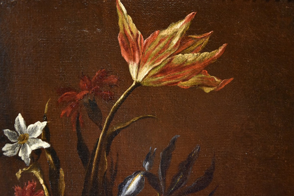 The work can therefore be dated to Naples in the early 1640s, before these Flemish influences, when Porpora was still inclined to interpret the models of the Neapolitan Giacomo Recco in modern terms, distinguishing himself for the intense naturalism with which the colourful corollas are depicted in the different stages of flowering, suggesting the passionate study from life that marks the beginnings of the genre.