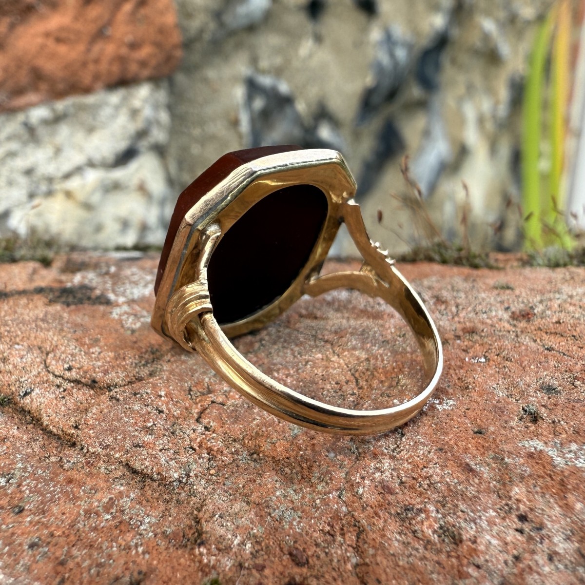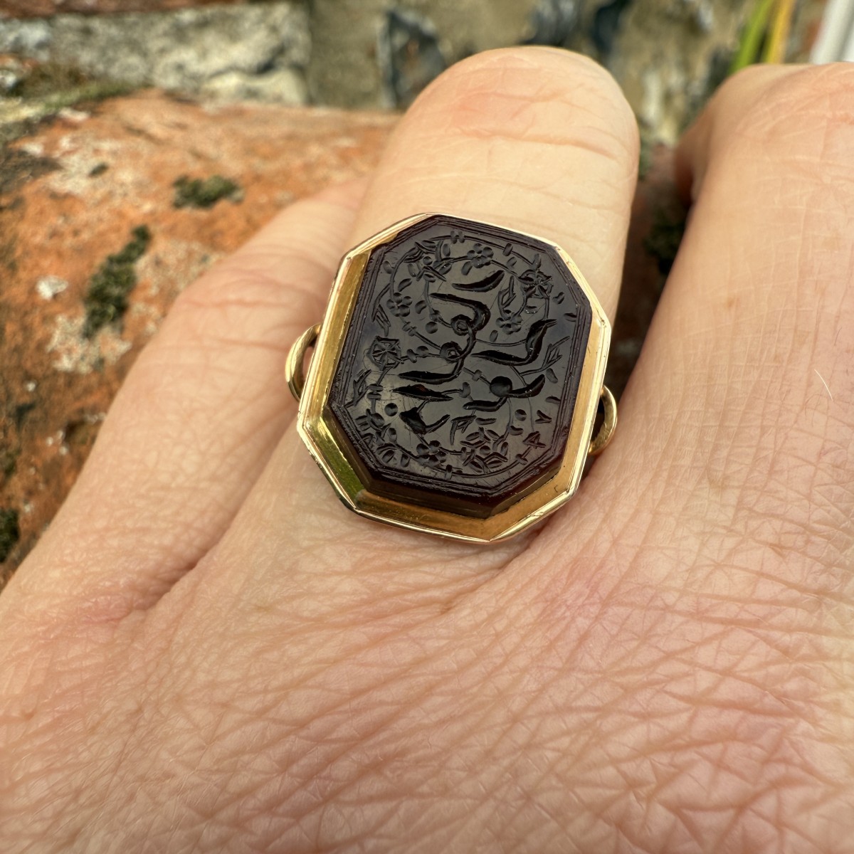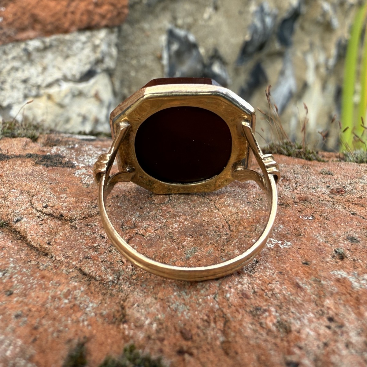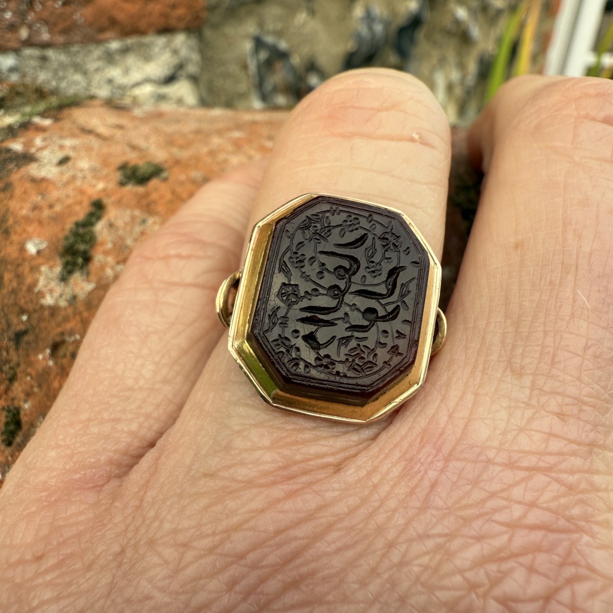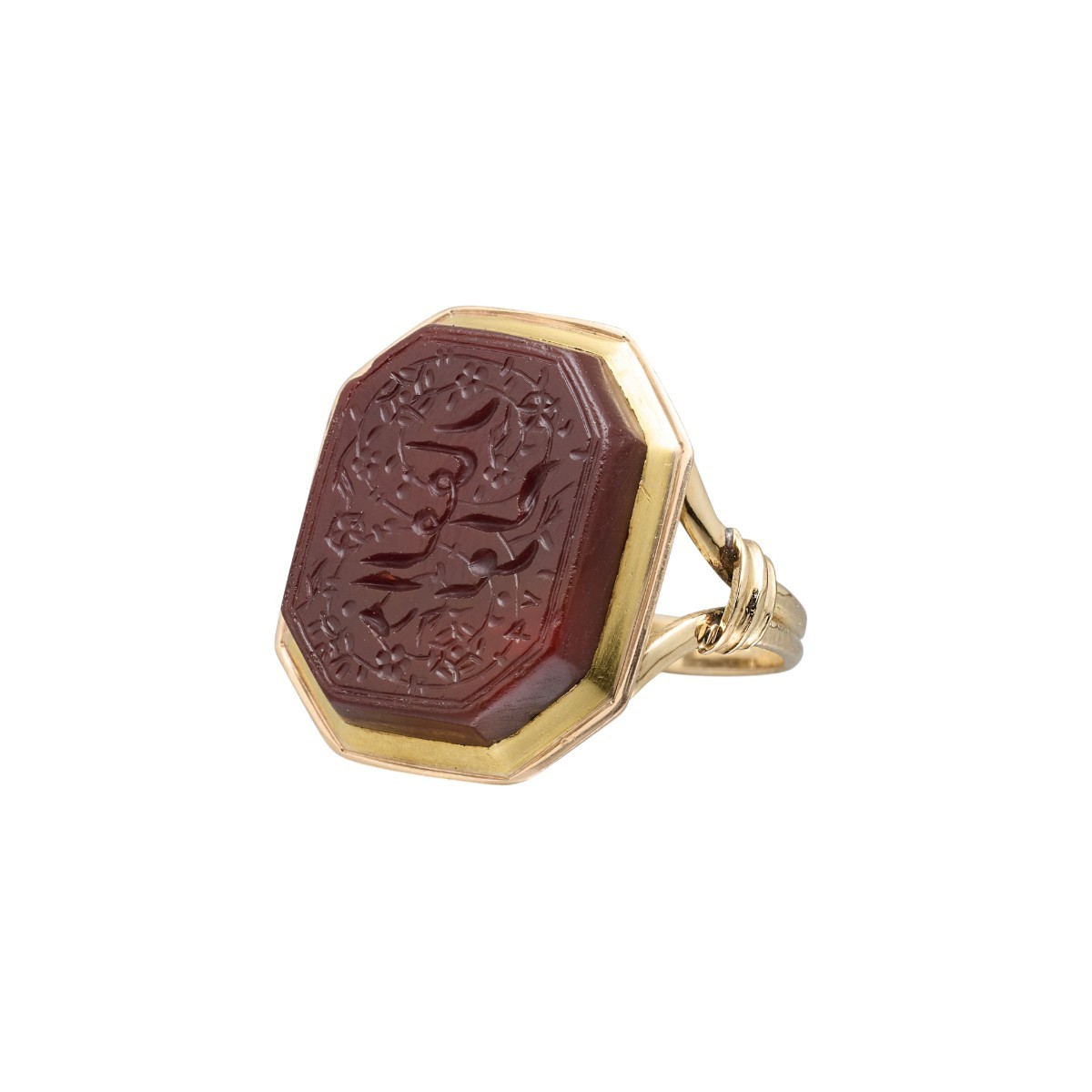 A high-carat gold ring set with an octagonal carnelian intaglio finely engraved in elegant nasta‘liq script with the name “Thulfiqar Lola” and the date 1179 AH (1765 AD). The surface of the stone is enriched with finely worked vegetal scrolls and floral motifs forming a delicate frame around the inscription.