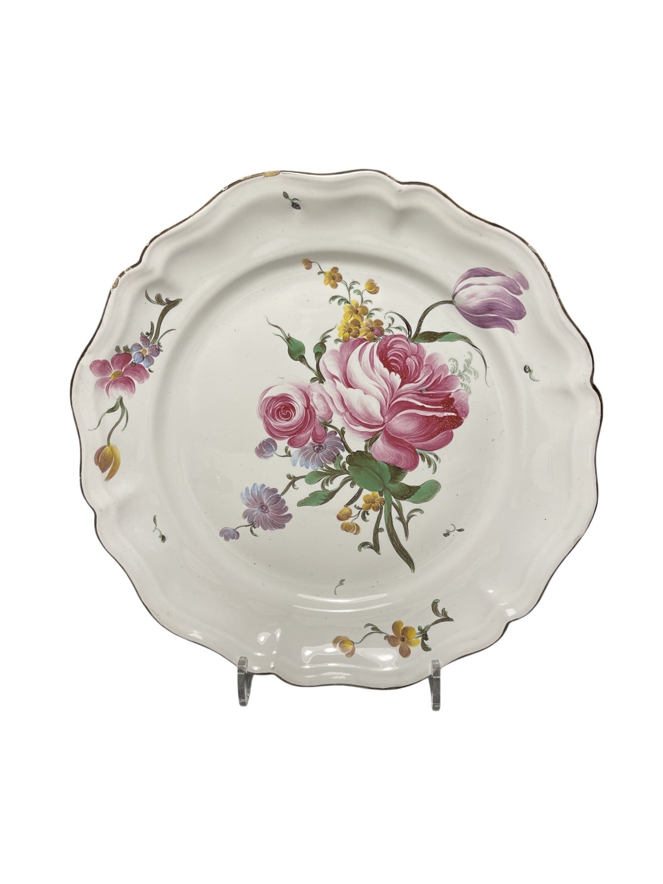 Silverware shape plate, polychrome decoration of a large bouquet of flowers. Joseph Hannong workshop. Marked JH 39. 24,8cm. 18th century.