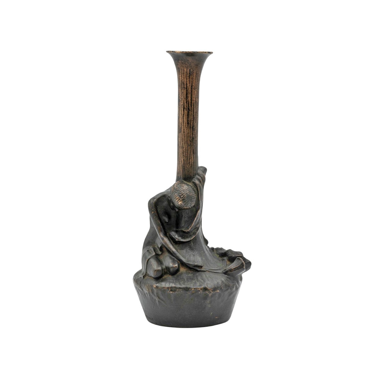 An early example of Viennese Art Nouveau bronze, this poetic candlestick features a reclining figure gently curled around the candleholder, a poppy flower resting in one hand. Symbolism, introspection, and subtle eroticism converge in a piece that reflects the dreamlike, introspective world of Jugendstil.