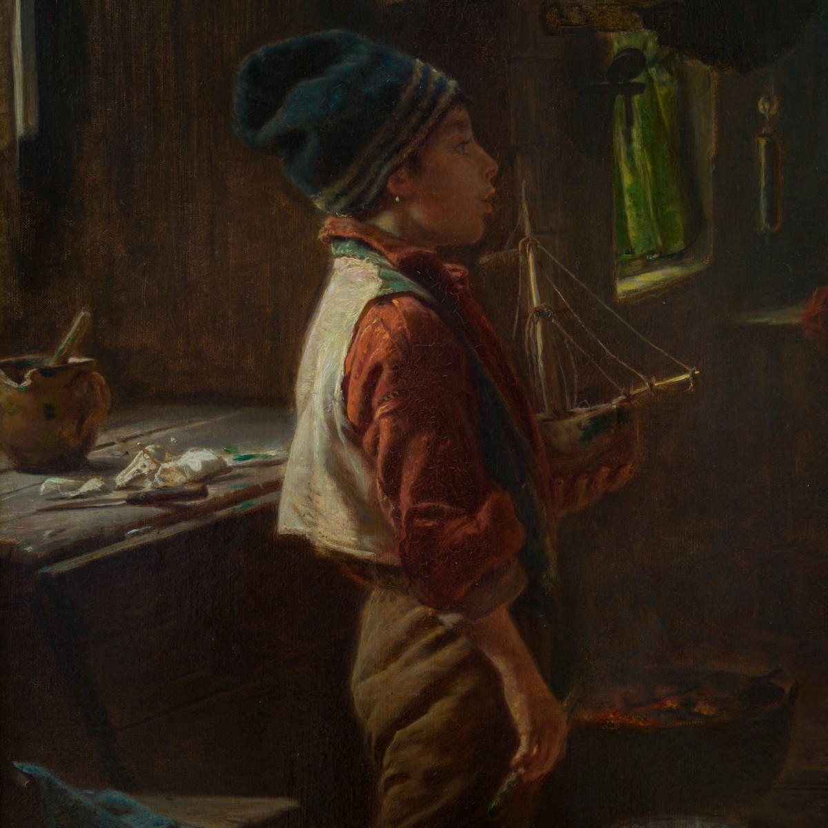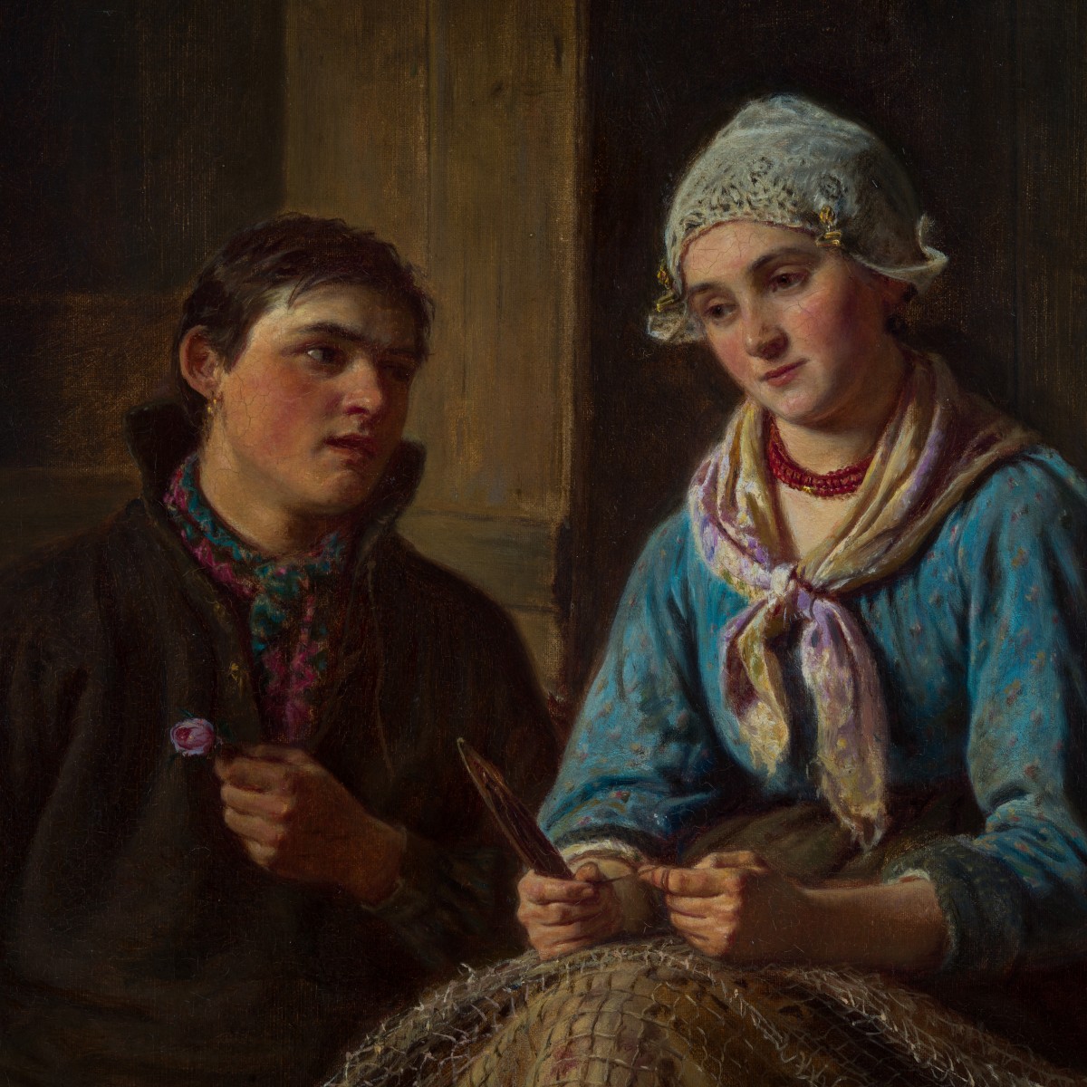 Kärleksförklaring exemplifies Fagerlin’s technical virtuosity and the hallmarks of the Düsseldorf school. The composition is well-thought-out and balanced, populated by just a few figures so that every gesture counts. Fagerlin’s attention to detail is exceptional – from the delicate weave of the fishing net to the gleam on the ceramic stove tiles – reflecting the technical perfection, elegant brushwork, warm and mature colour, and assured drawing and modelling for which he was renowned. The paint handling is refined and precise, bringing each texture , wood, fabric, porcelain, flesh vividly to life. Yet this precision never impedes the atmosphere: the scene feels natural and inviting, with a warm tonal palette that enhances the story’s emotional resonance. Fagerlin’s characterisation of his figures is equally masterful, their expressions and body language are rendered with empathetic realism, communicating the hope, affection, and slight nervousness of a public declaration of love. Overall, Kärleksförklaring stands as an elegant narrative tableau, combining meticulous detail and rich storytelling to capture a timeless moment of domestic intimacy and affection in a 19th-century fishing village home.