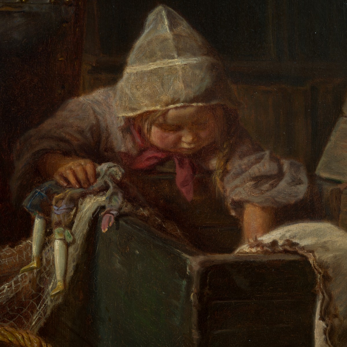 In this finely detailed genre scene, Fagerlin depicts a cosy 19th-century fisherfolk interior filled with warmth and narrative symbolism. A young fisherman, rose in hand, offers a tender declaration of love to a modest young woman seated with a half-mended fishnet in her lap. Her eyes are downcast and cheeks subtly flushed, suggesting both surprise and quiet joy as she contemplates his courtship. The intimate drama unfolds in the heart of a rustic cottage: a model boat rests nearby – a child’s toy that nods to the suitor’s seafaring life – and a little girl plays with her doll by an open wooden chest, innocently unaware of the moment’s significance. These domestic details, from the humble chest to the child’s toys, emphasise the familial setting and the promise of home and future family that the proposal carries.