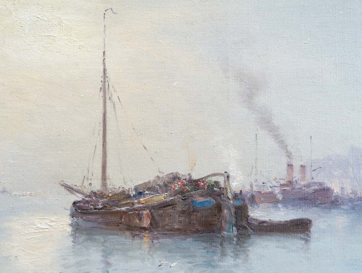 In Morning Mist Effect in Dordrecht, Marie-Joseph Clavel, known as Iwill, delicately captures a quiet, mist-shrouded morning on the calm waters of Dordrecht. The diffuse light of a veiled sun gently reflects on the water’s surface, creating an ethereal atmosphere. At the center of the composition lies a stationary boat, likely a river barge, accompanied by a small canoe. In the background, the city of Dordrecht emerges through the haze in soft lavender and grey-blue tones. The impressionistic, almost vaporous technique of the painting evokes the poetry of everyday life and the serene beauty of Dutch river landscapes.