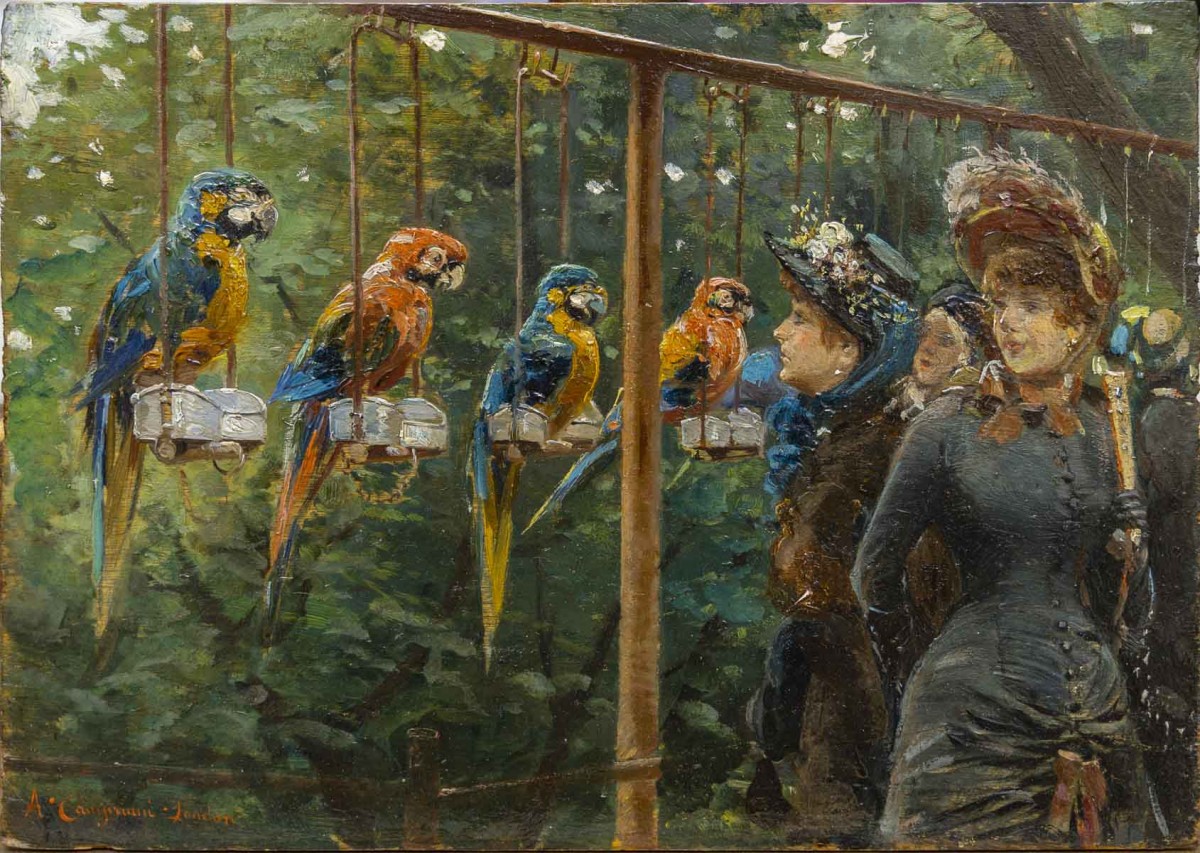 Alceste Campriani’s painting depicts a refined and delicate genre scene. In a lush garden bathed in soft light, an elegantly dressed woman—wearing a flower-adorned hat and a dark gown—approaches a row of colorful parrots perched on small hanging stands.