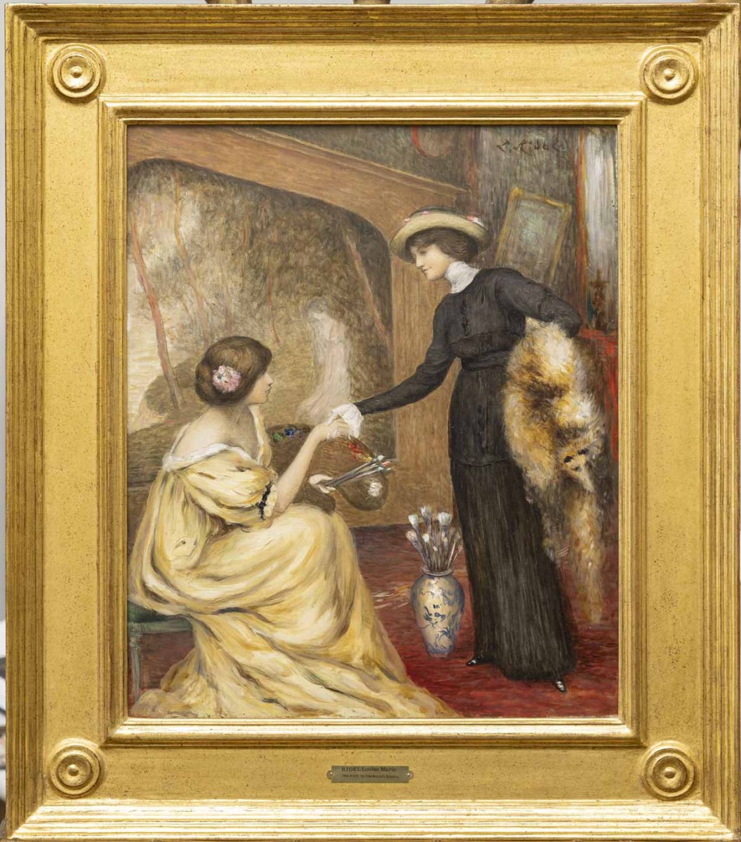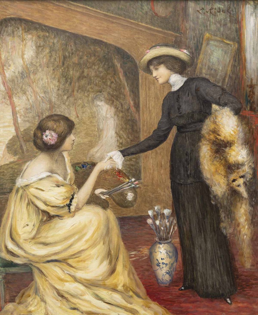 In this composition, Louis Ridel offers an intimate reflection on creation and transmission. Two women embody complementary figures: the artist, focused and holding her palette, and the muse or pupil, extending her hand in a gesture of acknowledgment. The scene, marked by restraint and balance, transcends the simple setting of the studio to become a metaphor for the dialogue between inspiration and realization, a theme dear to the Symbolists.