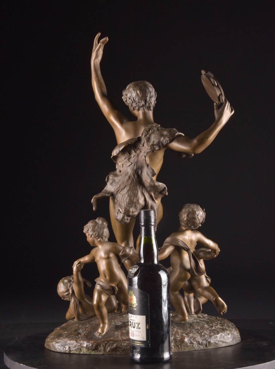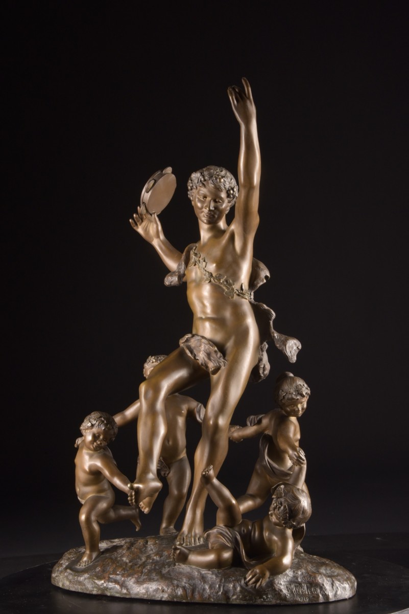 Patinated bronze sculpture depicting a dancing faun holding a tambourine, surrounded by several playful putti arranged in a dynamic composition. The group is set on an integrated rocky base with finely modelled details and balanced movement throughout.