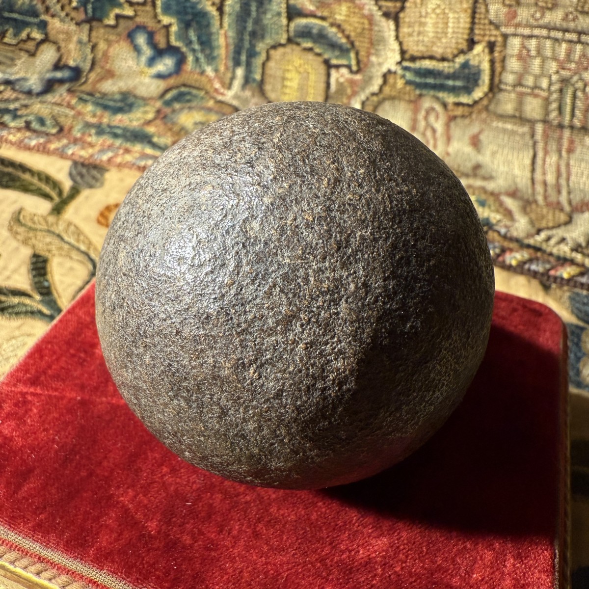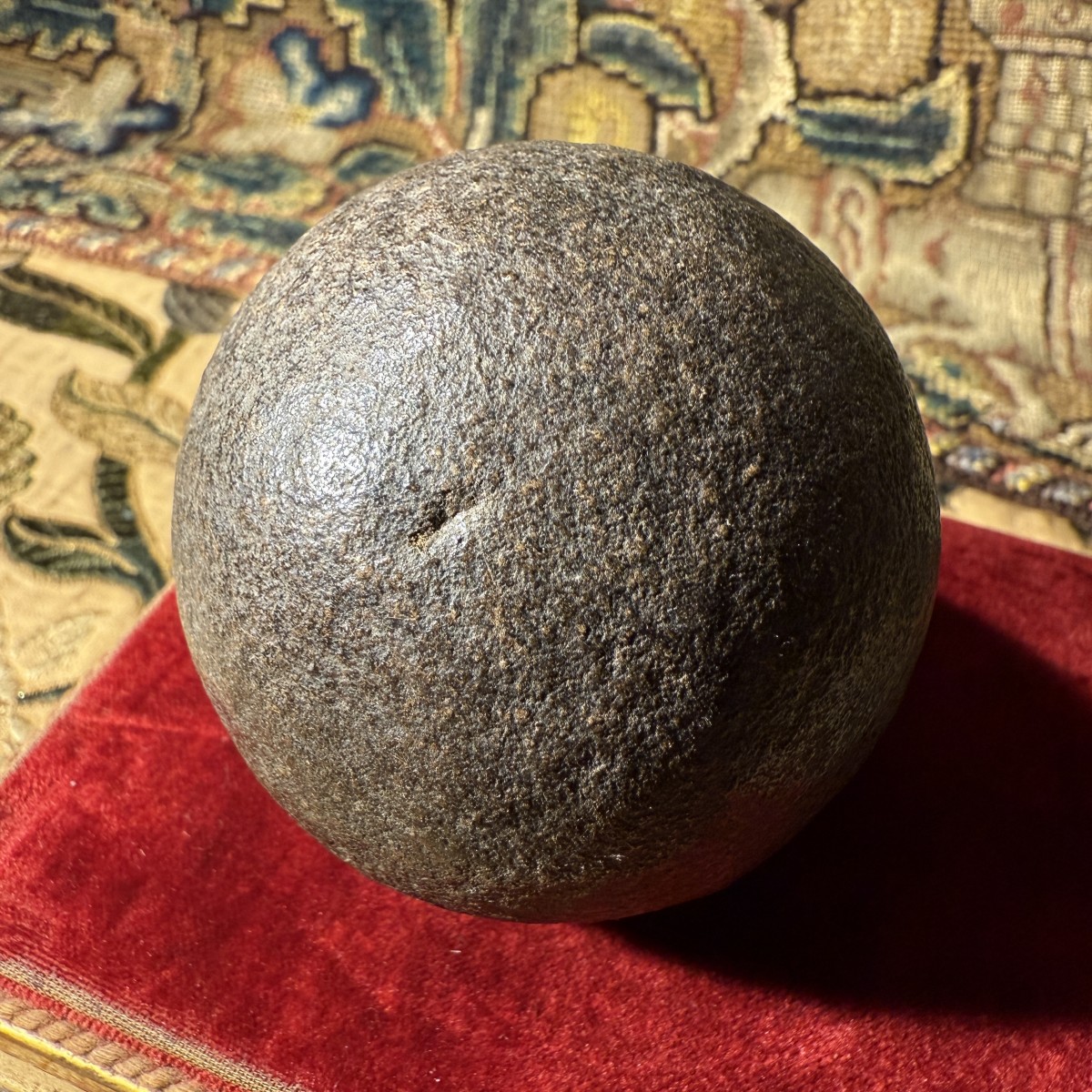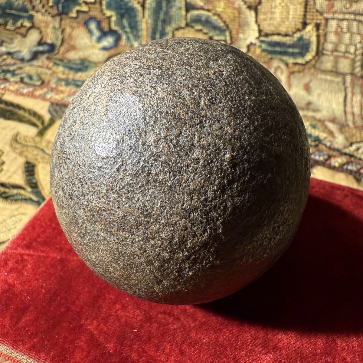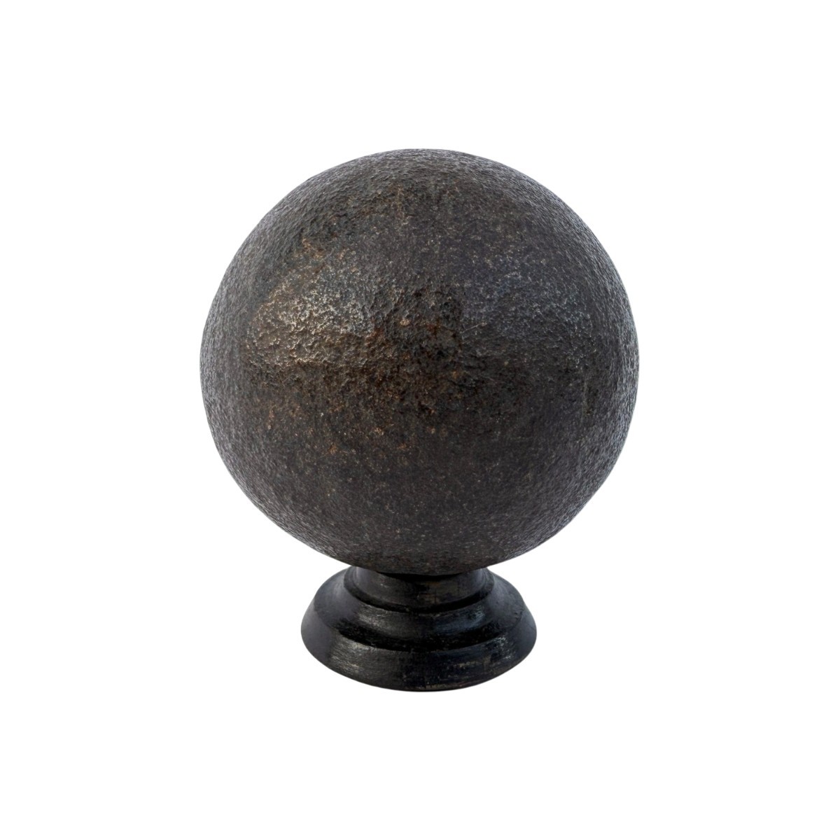 A substantial bezoar stone of rounded form, its surface displaying the characteristic granular, mottled texture produced by successive accretions within the stomach of a ruminant animal, most commonly a goat or camel. The sphere has a dense, dark, mineralised exterior, with subtle natural variations in tone and lustre that reflect its organic formation. It is presented on a turned ebonised wooden stand, shaped with a stepped foot to offer stable and elegant support.