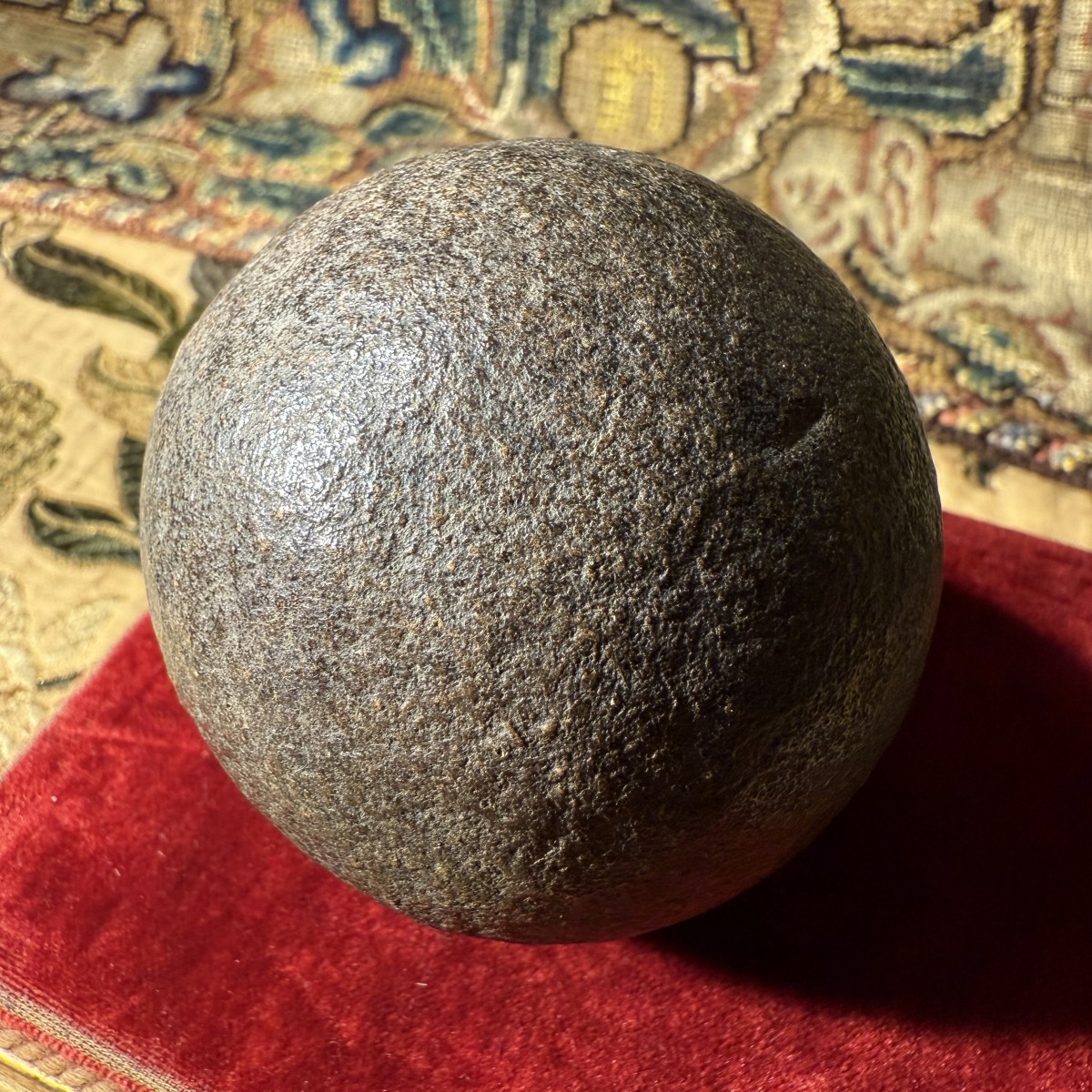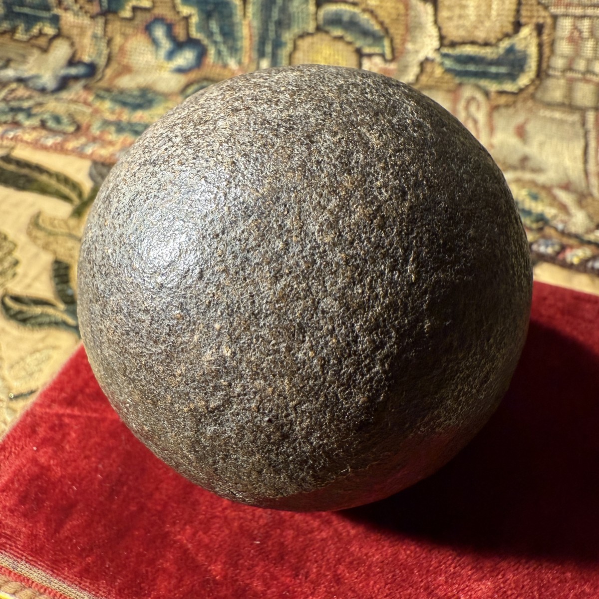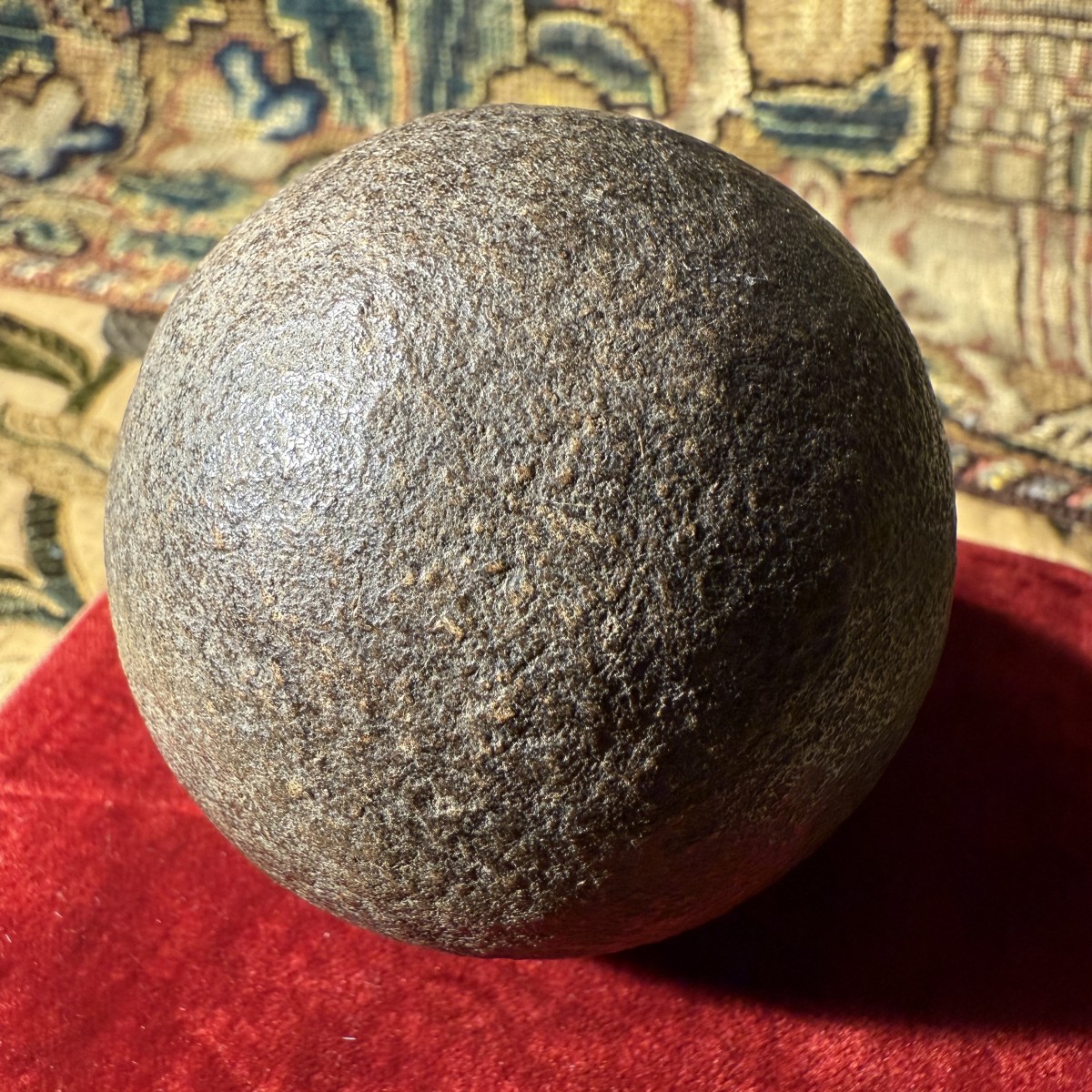 A substantial bezoar stone of rounded form, its surface displaying the characteristic granular, mottled texture produced by successive accretions within the stomach of a ruminant animal, most commonly a goat or camel. The sphere has a dense, dark, mineralised exterior, with subtle natural variations in tone and lustre that reflect its organic formation. It is presented on a turned ebonised wooden stand, shaped with a stepped foot to offer stable and elegant support.